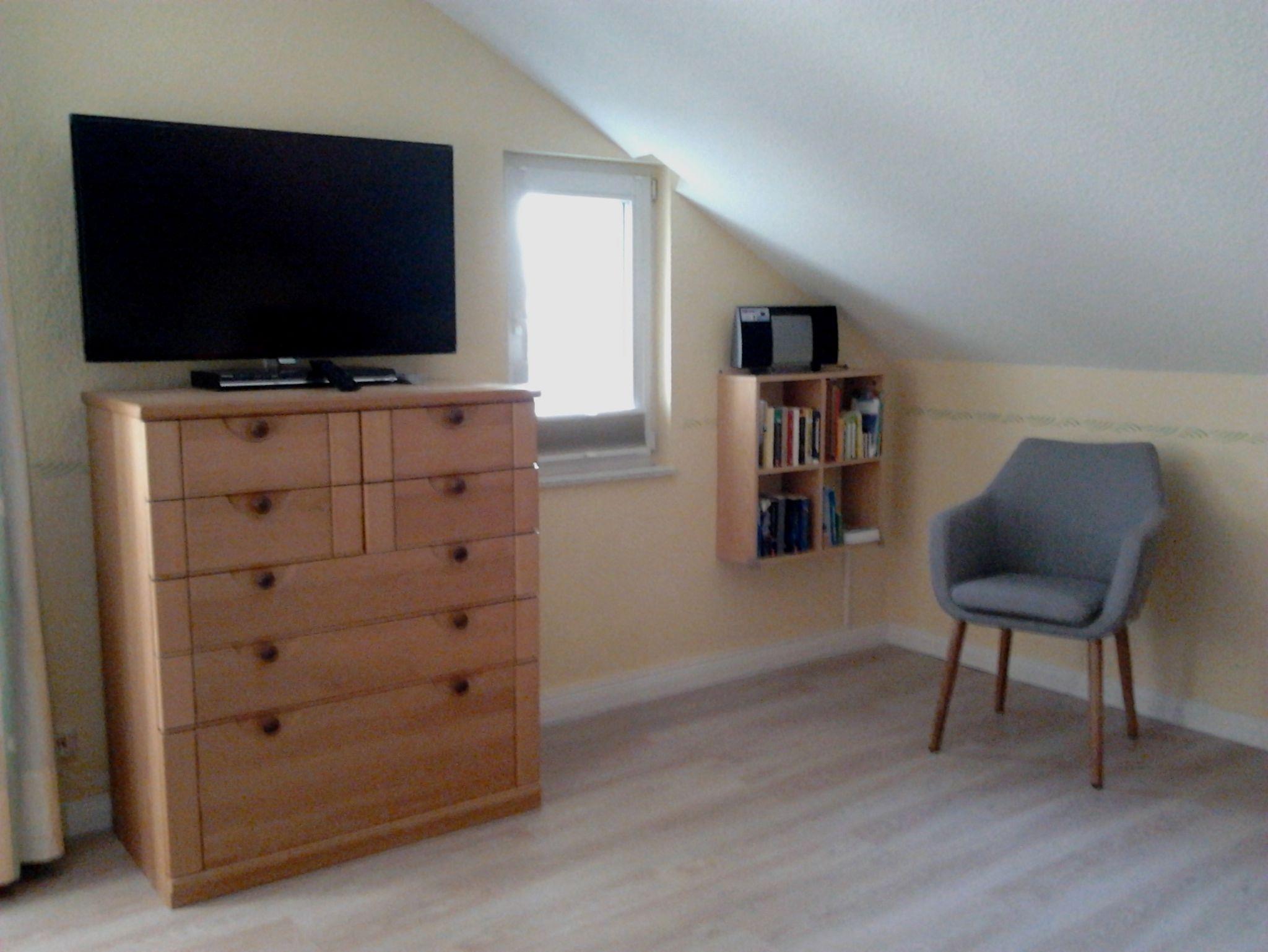 * den Wohnraum mit einem weiteren Schrank, Schlafsofa (Aufbettung für den 3. und 4. Gast), Sesseln, Couchtisch, Sideboard, Kommode, und TV, Stereoanlage mit CD-Player und Radio, sowie eine gemütliche Essecke;