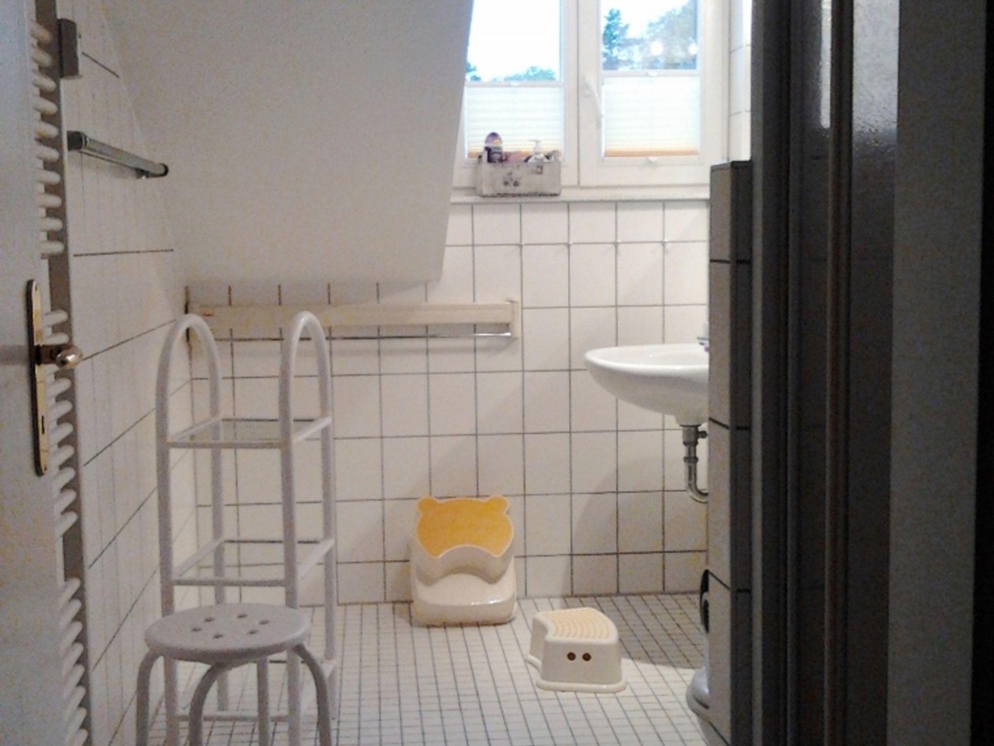 * das helle voll geflieste Bad mit Waschbecken, WC und Dusche, ausgestattet mit großem Handtuchheizkörper, ausziehbarem Wäsche-Trockengestell, Hocker, Badregal, Föhn und Vergrößerungsspiegel;