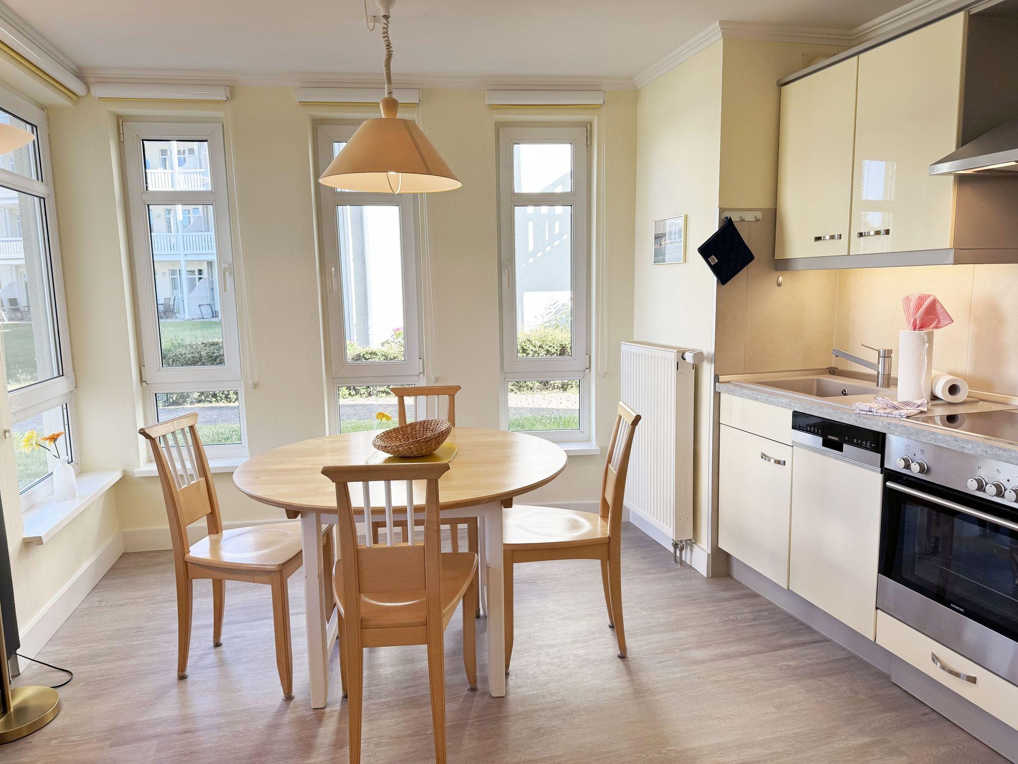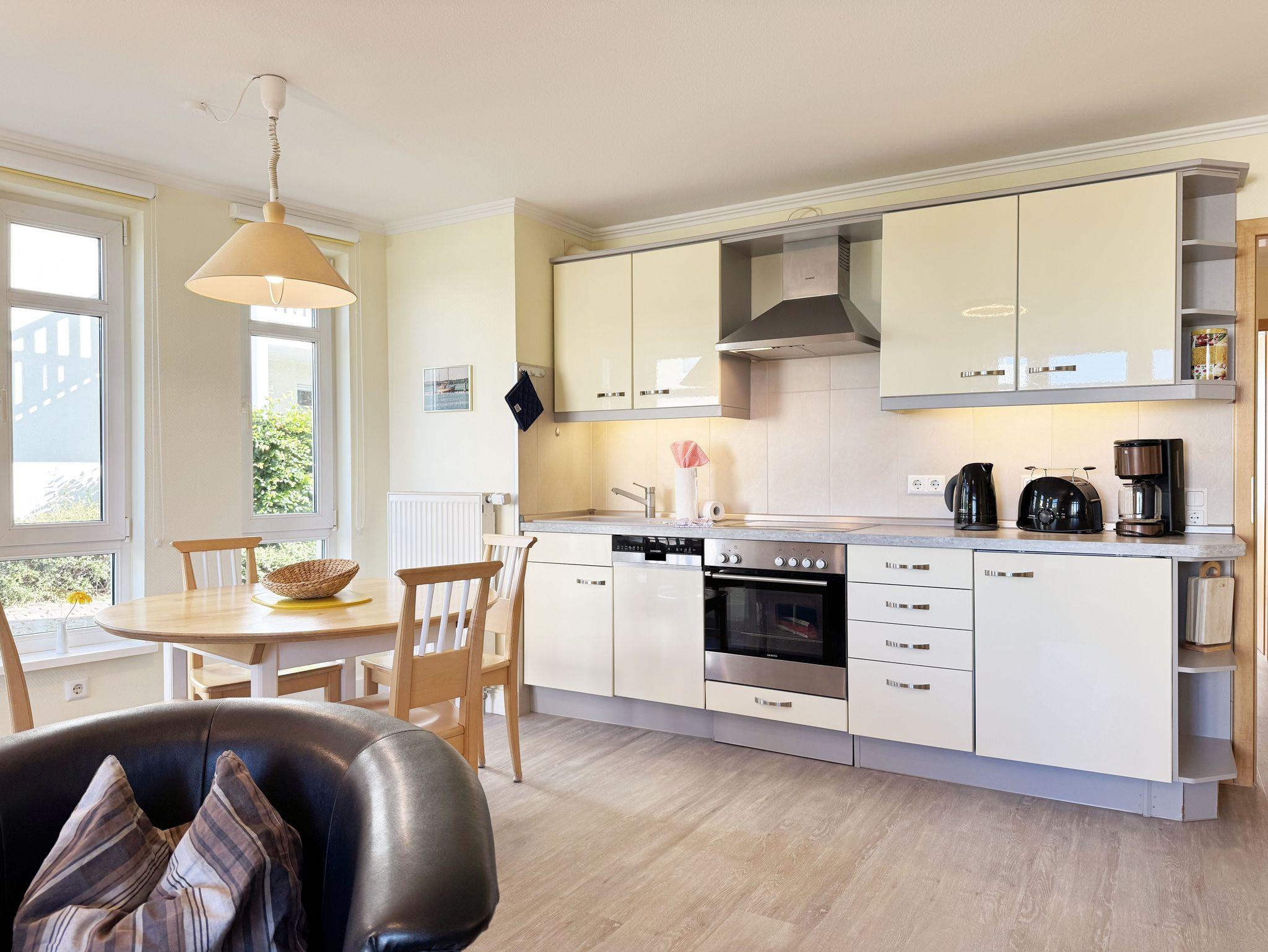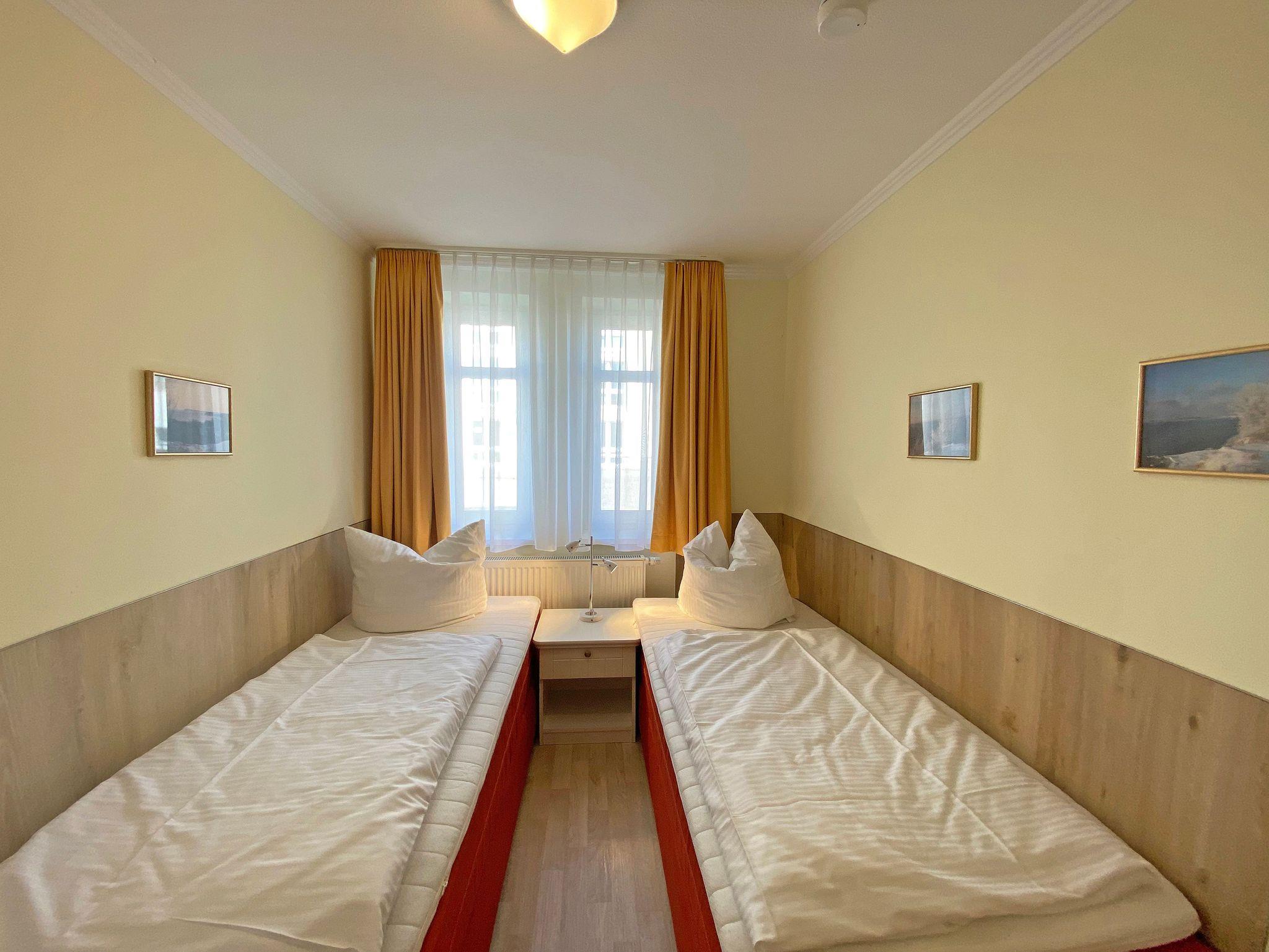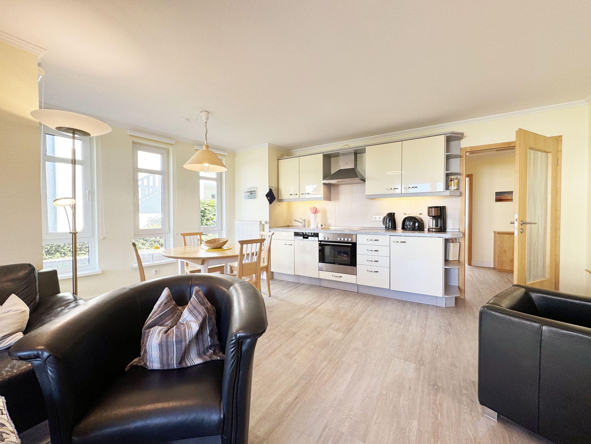 Unsere komfortable Nichtraucherwohnung von ca. 60 qm für 2 bis max. 4 Erwachsene und 1 Kleinkind bis 3 Jahre im Kinderreisebett verfügt über ein Schlafzimmer mit Doppelbett (1,80m x 2,00m), Nachttischkonsolen und Kleiderschrank sowie ein zweites Schlafzimmer mit 2 Einzelbetten (2 x 0,90 m x 2,00 m) und einen weiteren Kleiderschrank. Der Wohnbereich ist mit einem 2-Sitzer, Sessel, Leselampe, TV-Board, Smart-TV, Blu-Ray-Player und Ministereoanlage mit DAB-Radio eingerichtet. Von hier aus gelangen Sie auf die bestuhlte Terrasse und genießen den einmaligen Blick auf die Ostsee. Das Bad ist mit einer Dusche, WC, Waschmaschine mit Trocknerfunktion und Fön ausgestattet. Die Küchenzeile bietet einen Esstisch und 4 Stühlen, Geschirrspüler, Kühlschrank mit Eisfach, 4-Zonen-Ceranfeld mit Backofen, Toaster, Kaffeemaschine, Wasserkocher und diverse Küchenutensilien. Insektenschutzgitter sind vorhanden. WLAN ist für Sie inklusive nutzbar!! Ein PKW-Stellplatz (Nr. 03) sowie eine Unterstellmöglichkeit für Ihre Fahrräder ist am Haus vorhanden. Kinderreisebett (ohne Matratze und Bett Inlett) und Hochstuhl können für unsere kleinen Gäste gegen eine Gebühr gestellt werden. In der Wohnung sind keine Haustiere erlaubt! Die Erstausstattung eines Wäschepaketes (komplette Bettwäsche, 1 Duschhandtuch, 1 kleines Handtuch) können Sie bis 14 Tage vor der Anreise gegen einen Aufpreis dazu buchen oder durch eigene ergänzen. Ab 2 gebuchten Paketen erhalten Sie einmalig 1 Geschirrtuch und einen Duschvorleger dazu.