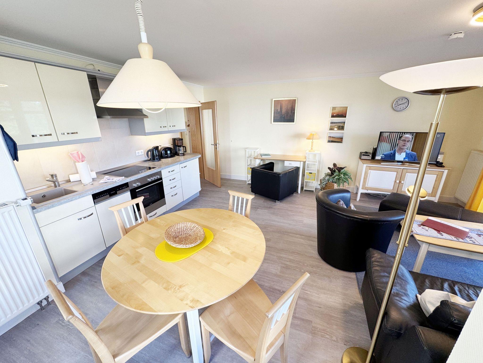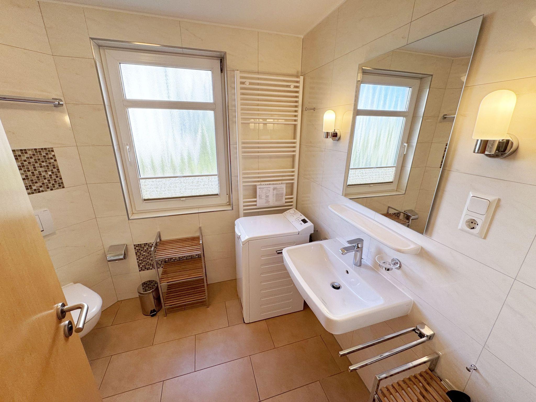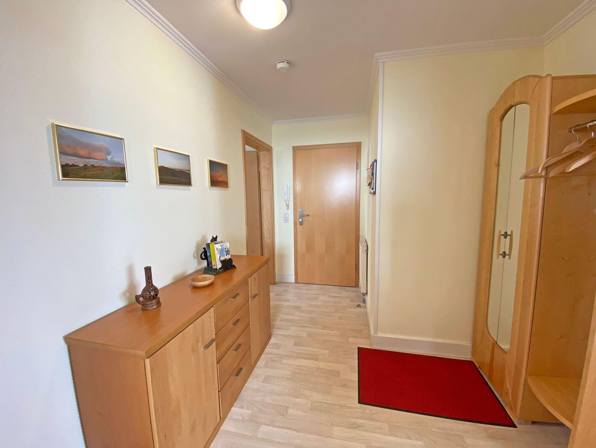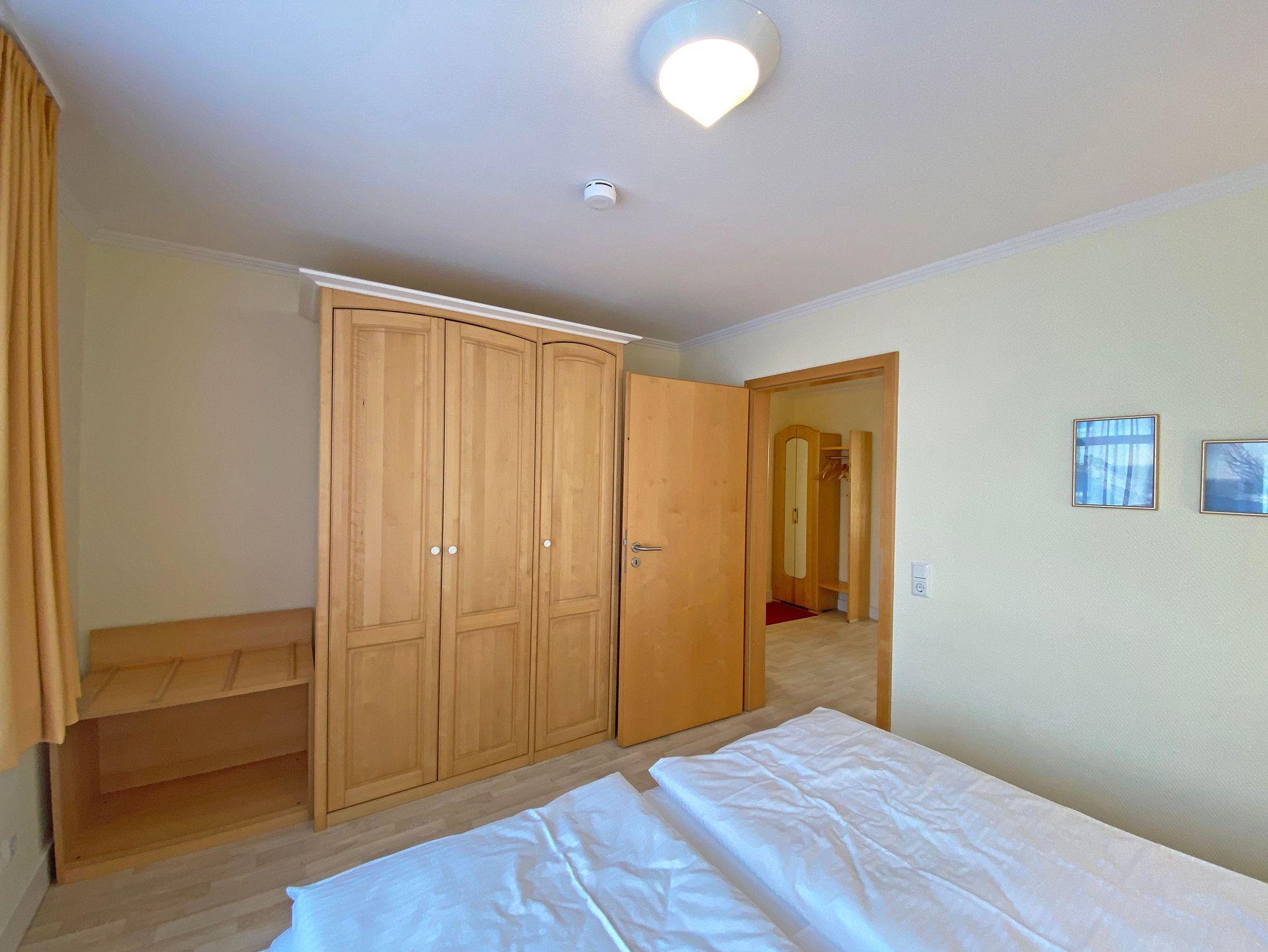 Unsere komfortable Nichtraucherwohnung von ca. 60 qm für 2 bis max. 4 Erwachsene und 1 Kleinkind bis 3 Jahre im Kinderreisebett verfügt über ein Schlafzimmer mit Doppelbett (1,80m x 2,00m), Nachttischkonsolen und Kleiderschrank sowie ein zweites Schlafzimmer mit 2 Einzelbetten (2 x 0,90 m x 2,00 m) und einen weiteren Kleiderschrank. Der Wohnbereich ist mit einem 2-Sitzer, Sessel, Leselampe, TV-Board, Smart-TV, Blu-Ray-Player und Ministereoanlage mit DAB-Radio eingerichtet. Von hier aus gelangen Sie auf die bestuhlte Terrasse und genießen den einmaligen Blick auf die Ostsee. Das Bad ist mit einer Dusche, WC, Waschmaschine mit Trocknerfunktion und Fön ausgestattet. Die Küchenzeile bietet einen Esstisch und 4 Stühlen, Geschirrspüler, Kühlschrank mit Eisfach, 4-Zonen-Ceranfeld mit Backofen, Toaster, Kaffeemaschine, Wasserkocher und diverse Küchenutensilien. Insektenschutzgitter sind vorhanden. WLAN ist für Sie inklusive nutzbar!! Ein PKW-Stellplatz (Nr. 03) sowie eine Unterstellmöglichkeit für Ihre Fahrräder ist am Haus vorhanden. Kinderreisebett (ohne Matratze und Bett Inlett) und Hochstuhl können für unsere kleinen Gäste gegen eine Gebühr gestellt werden. In der Wohnung sind keine Haustiere erlaubt! Die Erstausstattung eines Wäschepaketes (komplette Bettwäsche, 1 Duschhandtuch, 1 kleines Handtuch) können Sie bis 14 Tage vor der Anreise gegen einen Aufpreis dazu buchen oder durch eigene ergänzen. Ab 2 gebuchten Paketen erhalten Sie einmalig 1 Geschirrtuch und einen Duschvorleger dazu.