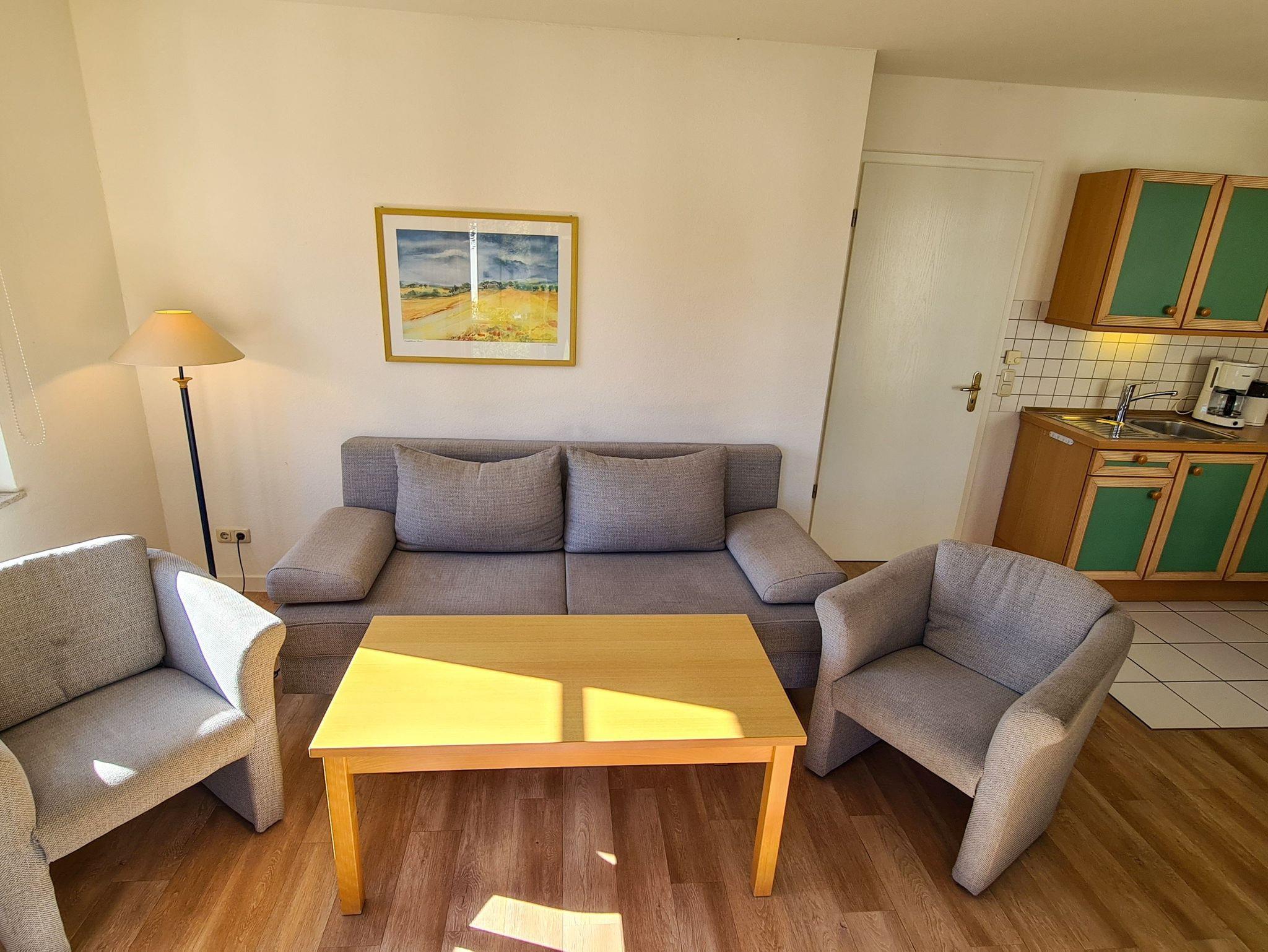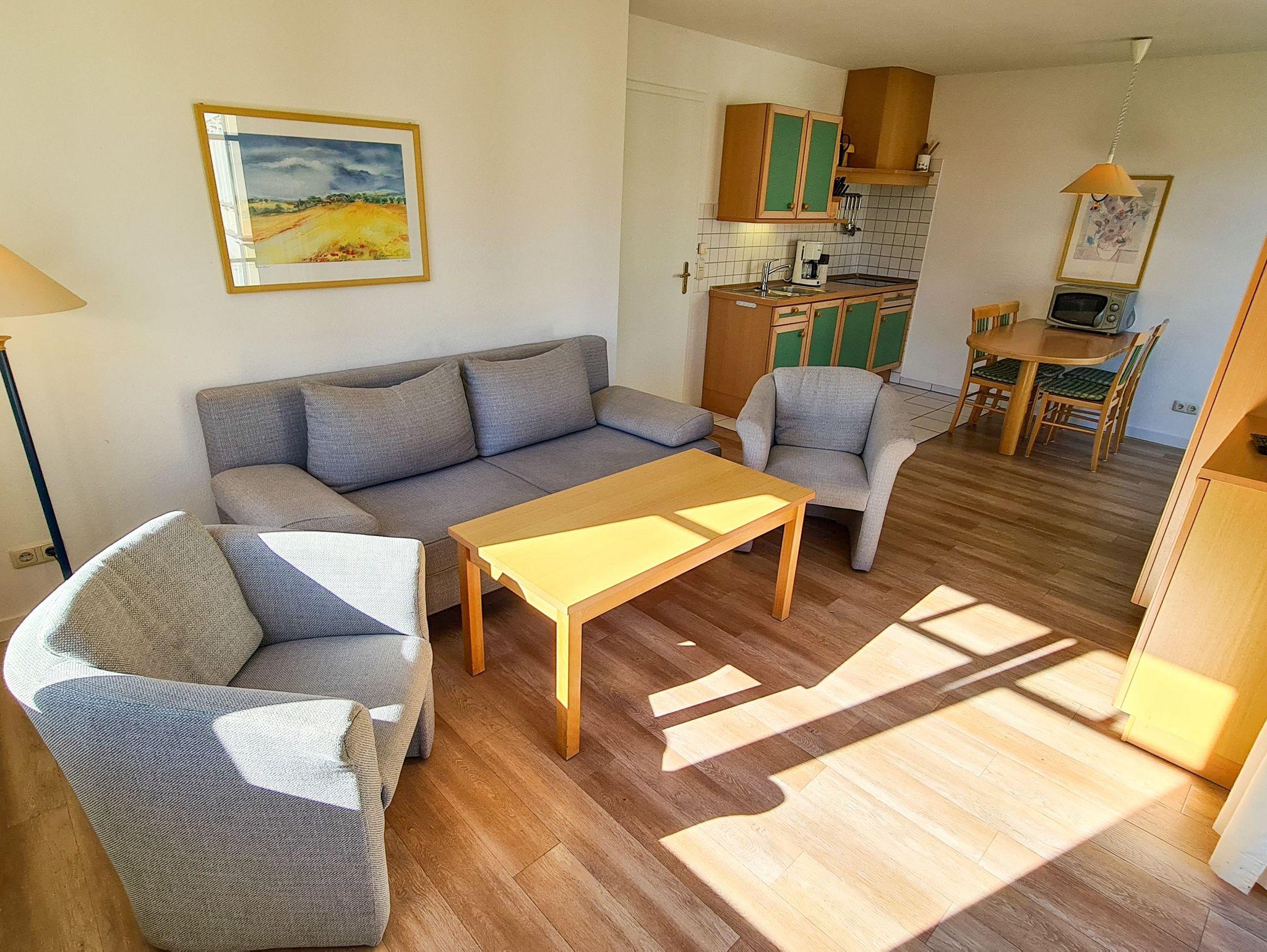 Sie besteht aus einem Wohnzimmer mit Sitzecke (Schlafsofa), TV, Balkon und komplett eingerichteter Küchenzeile (4 Kochplatten, Kühlschrank, Mikrowelle, Kaffeemaschine, Wasserkocher, Toaster), einem Schlafzimmer mit Doppelbett, einem Schlafzimmer mit zwei Einzelbetten und Bad mit Dusche und WC.