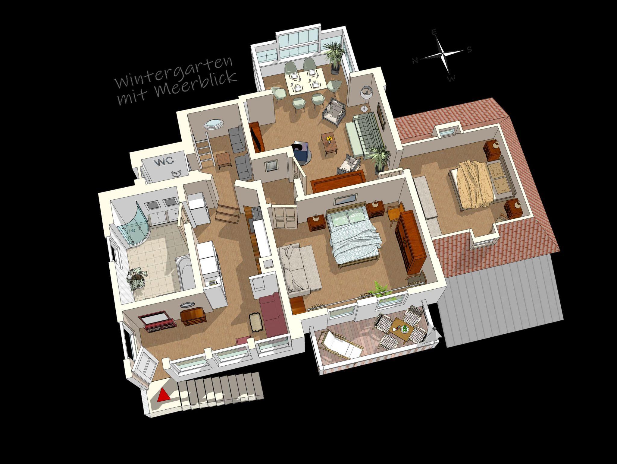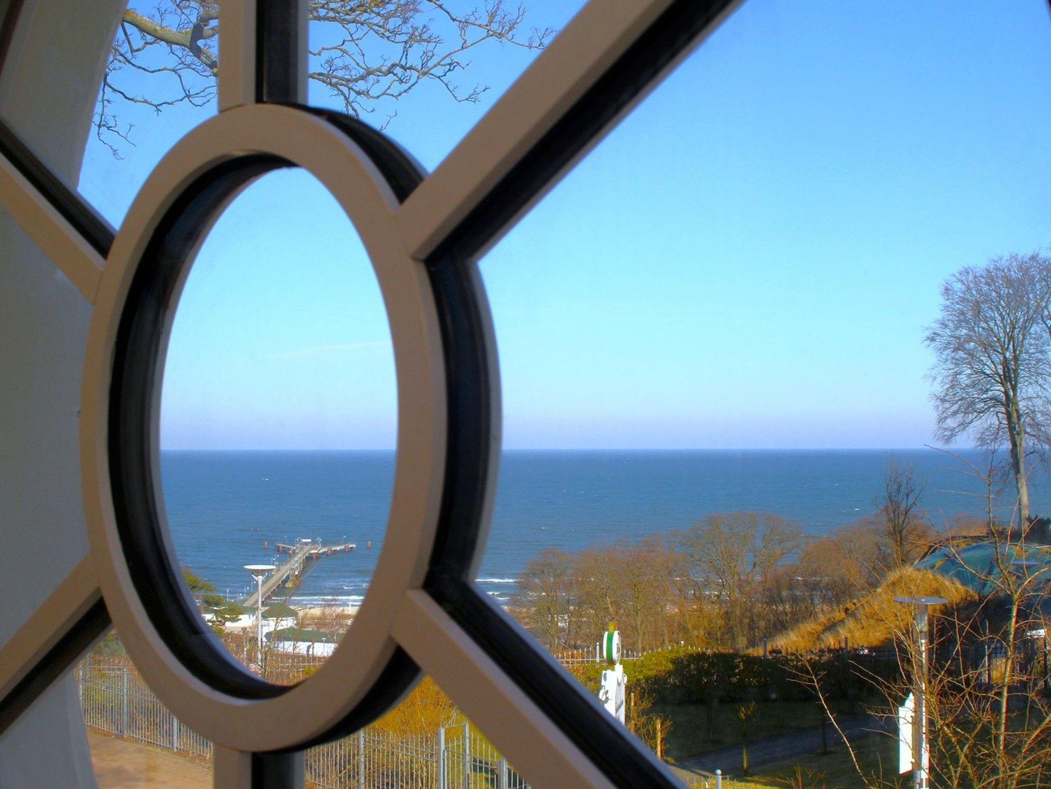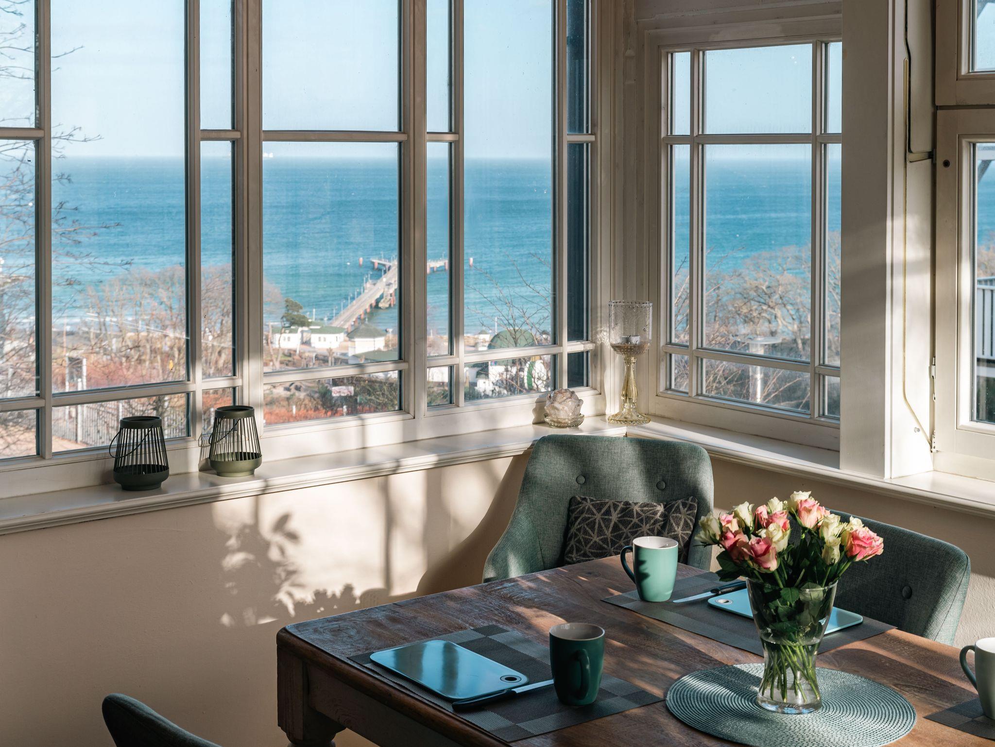 Wohn- und Essbereich im Wintergarten mit traumhaften Meerblick über die Seebrücke und den Strand