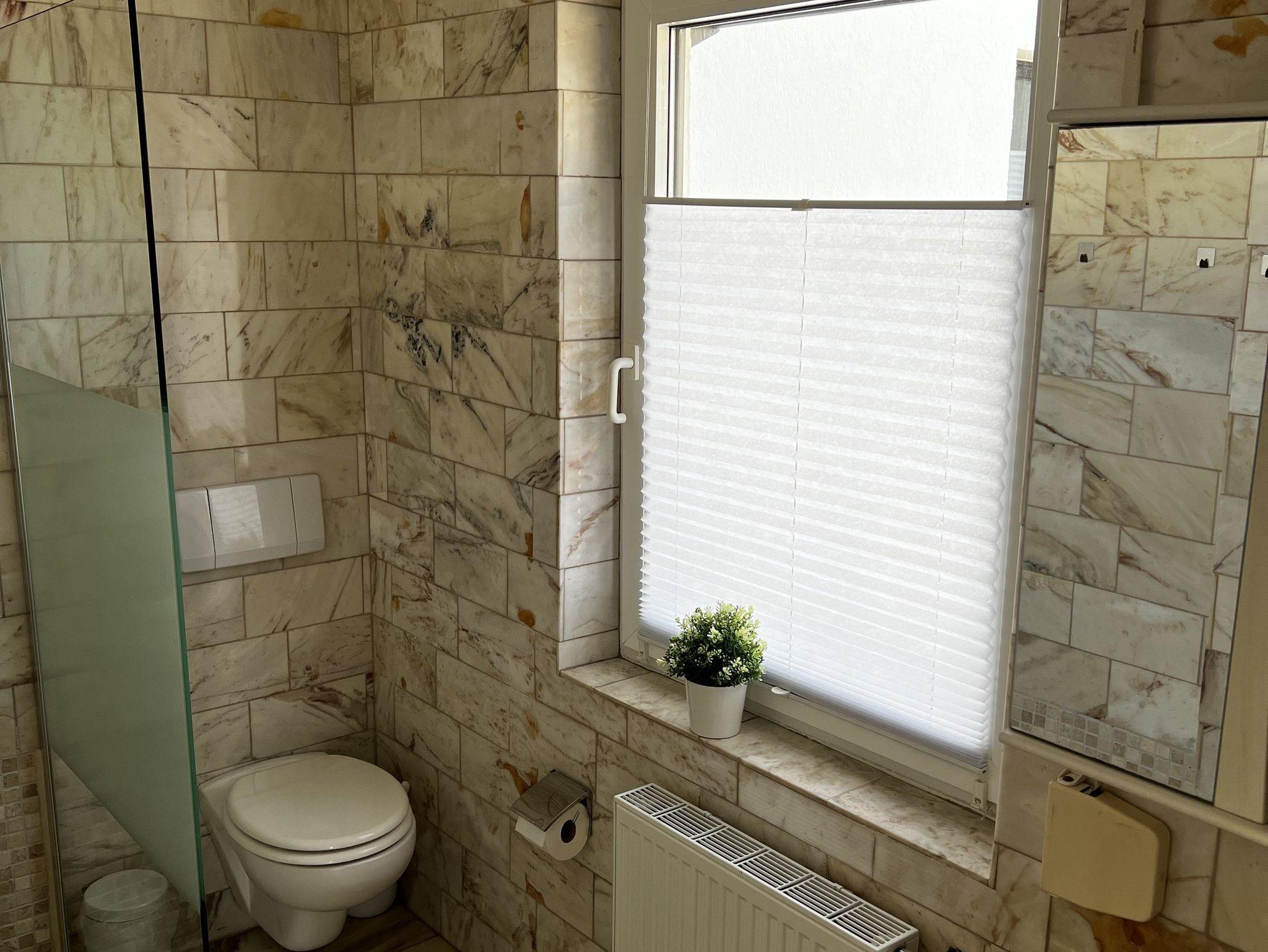 Ebenerdige Lage mit großer Schiebetür zur Terrasse und bodengleicher Dusche. Kurze Wege zum Strand, zum Einkaufen und zu Restaurants.