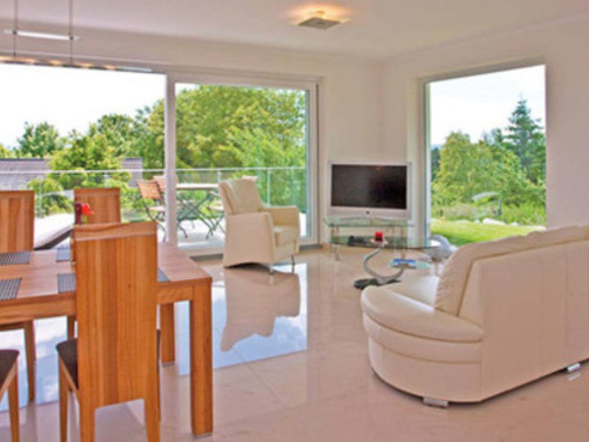 Der Wohnraum von 35 m² ist großzügig eingerichtet und mit Rosa Portogallo Marmor-Feinstein ausgelegt. Große Schiebetüren öffnen die Fensterfronten zur 24 m² großen Terrasse und Rasenfläche nach Süden mit Blick ins Grüne und nach Osten mit Blick auf die Insel Oie und die 100 jährige Eiche.
