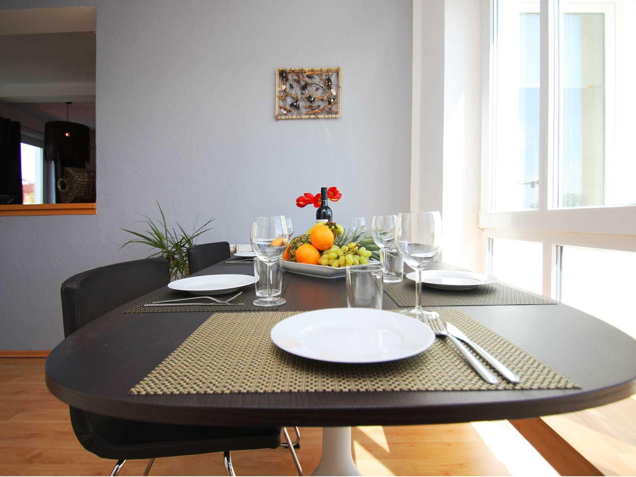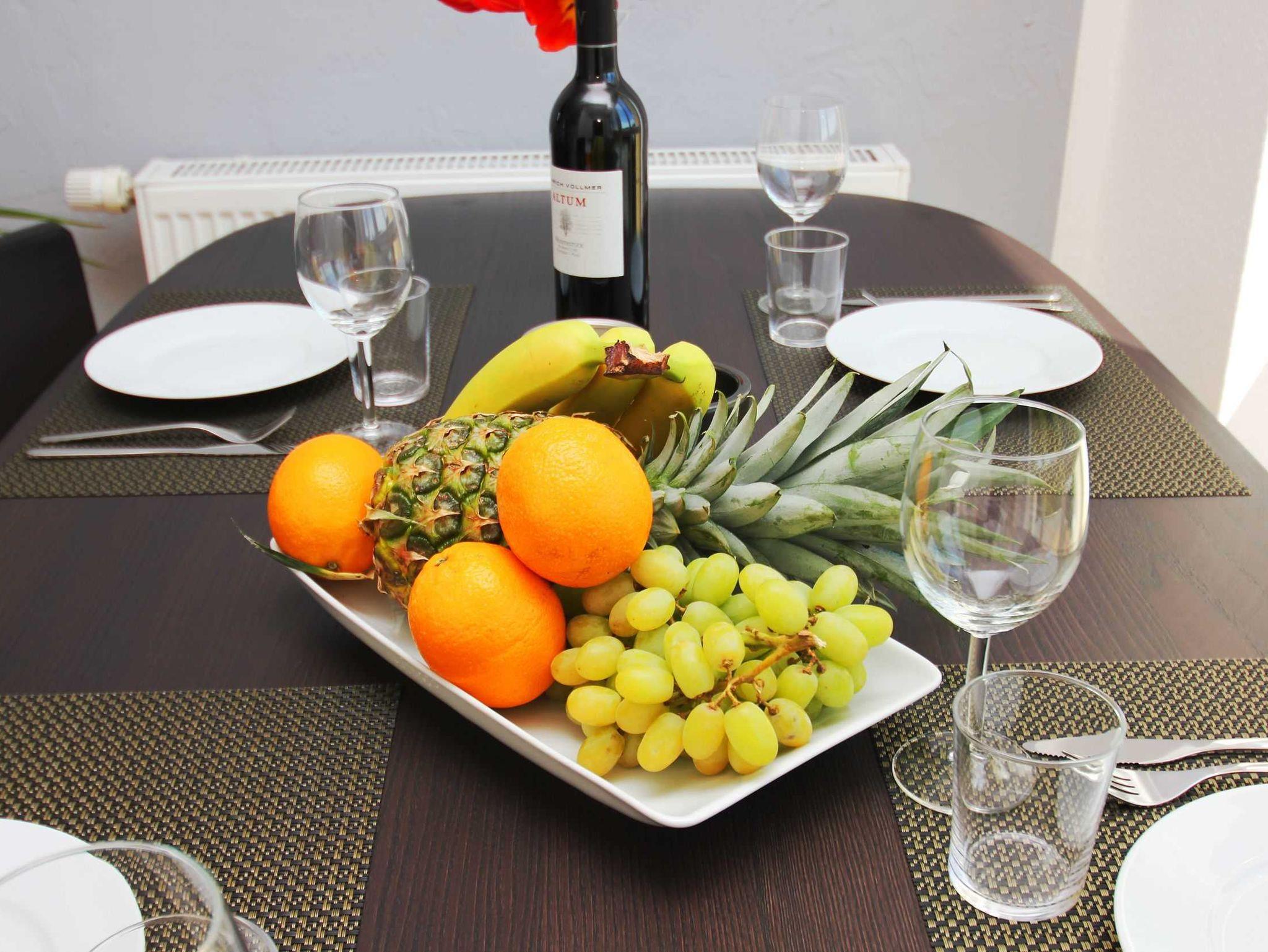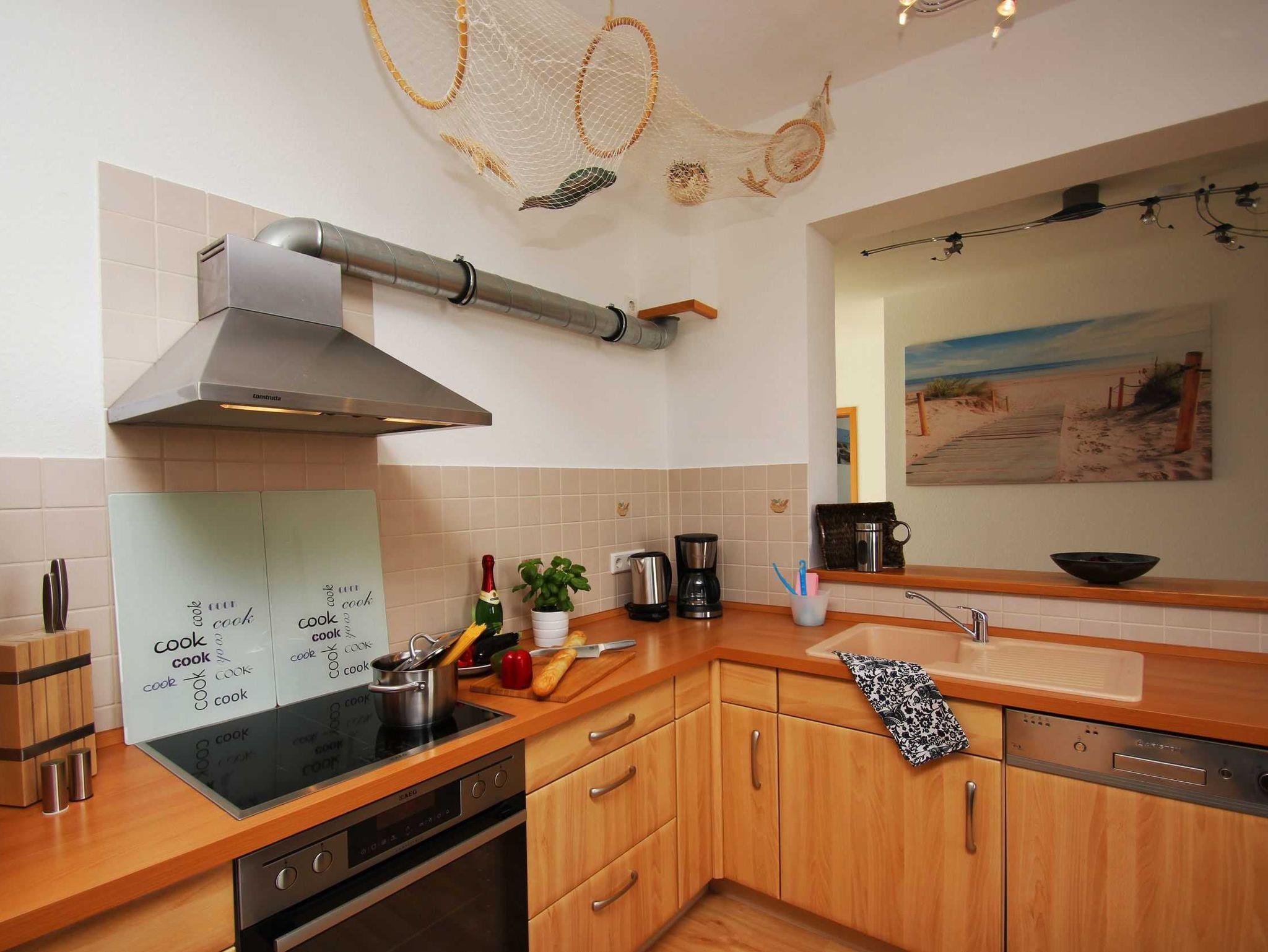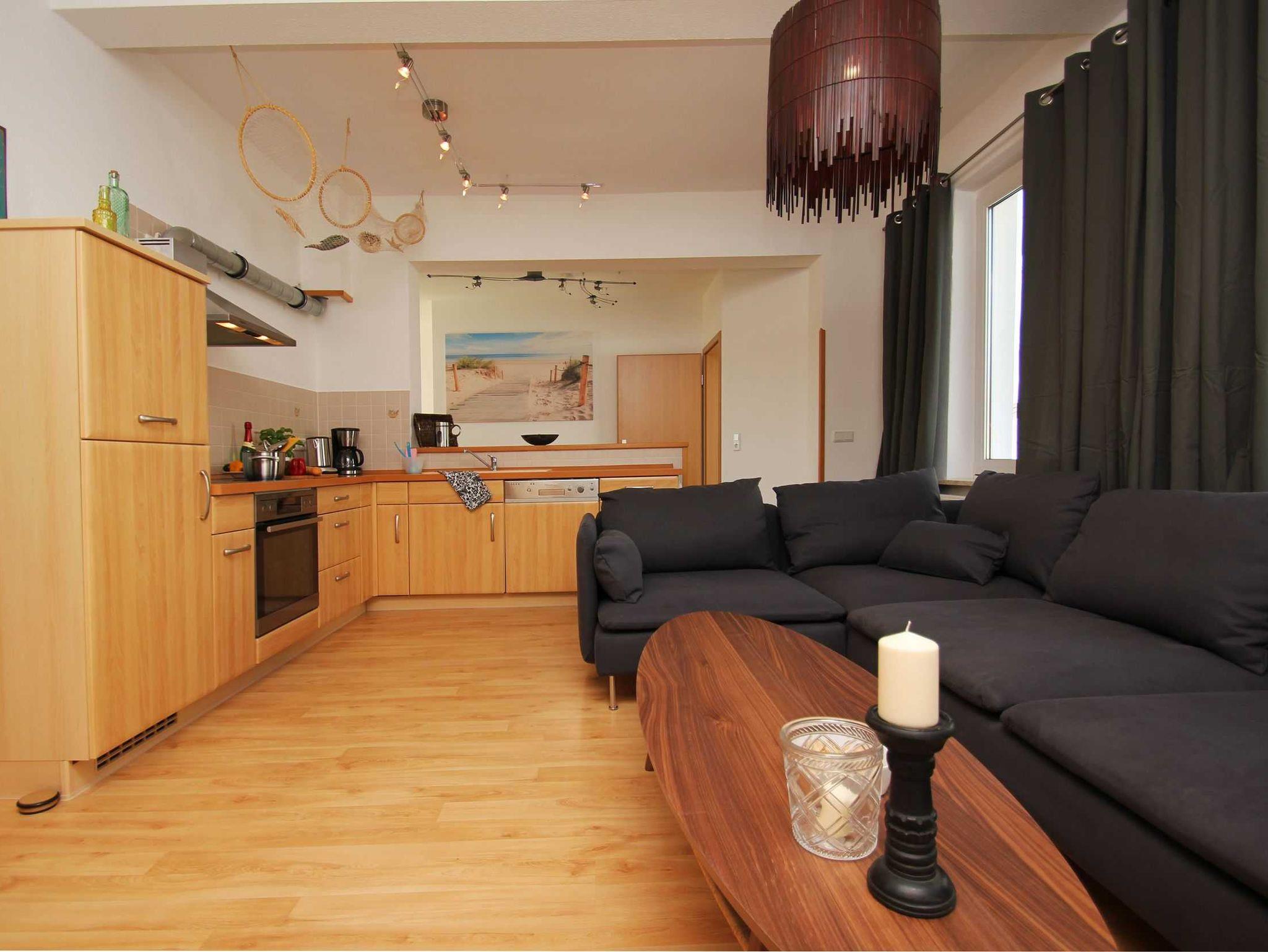 Im Wohnzimmer befindet sich eine große Wohnlandschaft mit Flachbild TV. Die offene, voll ausgestattete Küche mit einem 4-Felder Ceranherd, Backofen, Geschirrspüler, Kühlschrank, Mikrowelle und sämtlichen Küchenutensilien lässt keine Wünsche offen.