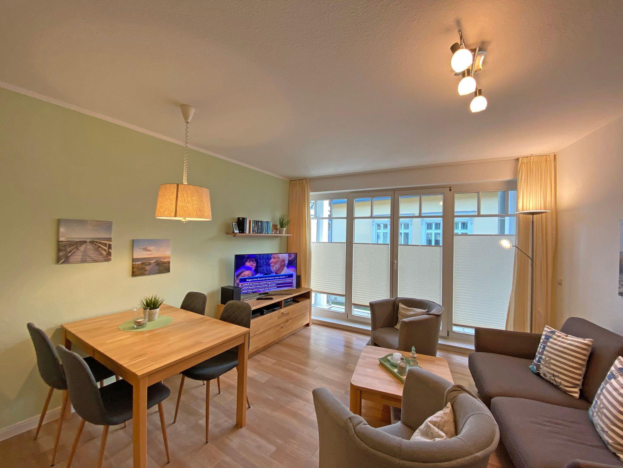 Die gemütliche 2-Raumwohnung (Nichtraucher) befindet sich in der 1. Etage der Appartementanlage Villa Granitz. Die Wohnfläche beträgt ca. 45m², die mit 2 -4 Personen genutzt werden kann. Der Wohnbereich mit offener Küchenzeile wird durch eine hochwertige Schlafcouch (Faltbett, Maße 1,30m x 2,00m, Aufbettungsmöglichkeit für 3./4. Person) mit Couchtisch, Sideboard mit LCD-TV (40 Zoll), Blu-Ray-Player und einer Stereoanlage abgerundet. Der gemütliche Essplatz mit 4 Stühlen passt sich dem Wohnbereich an. Die Küchenzeile ist mit einem 4-Zonen Ceranfeld, Mikrowelle, Kompaktbackofen, Geschirrspüler, Kühlschrank mit Gefrierfach, Spüle, Kaffeemaschine, Toaster, Wasserkocher, Eierkocher und diversen Küchenutensilien ausgestattet. Vom Wohnzimmer aus erreichen Sie den überdachten und bestuhlten Balkon. Im Schlafzimmer befindet sich ein Doppelbett (1,80 x 2,00m, mit getrennten Matratzen), ein Kleiderschrank, Ablageflächen sowie Verdunklungsmöglichkeiten. Ein Kinderreisebett kann hier aufgestellt werden. Das Schlafzimmer bietet zusätzlich einen Zugang zu einem schmalen Balkon, wo Sie mit einem seitlichen Meerblick die Abendsonne genießen können. Das hell geflieste Bad mit einem Waschbecken, Dusche, WC, Ablageflächen, Kosmetikspiegel und Fön runden den Sanitärbereich ab. Der Dielenbereich ist mit einer Garderobe versehen. Alle Räumlichkeiten sind mit einer Fußbodenheizung versehen. Für unsere kleinen Gäste stehen 1x Kinderreisebett mit Matratze (ohne Bett Inlett) und 1x Hochstuhl inklusive zur Verfügung. Ein Internetzugang (WLAN) ist für Sie inklusive. Haustiere sind in der Wohnung nicht erlaubt. In der Tiefgarage befindet sich ein inklusiver PKW-Stellplatz, der zur Wohnung gehört. Im Nebengebäude können Sie eine Waschmaschine und einen Trockner gegen eine Extragebühr nutzen. Ein Fahrradkeller steht Ihnen für Ihre mitgebrachten sowie geliehenen Fahrräder zur Verfügung. Die Erstausstattung eines Wäschepaketes (komplette Bettwäsche, 1 Duschhandtuch, 1 kleines Handtuch) können Sie bis 14 Tage vor Anreise gegen einen Aufpreis dazu buchen oder durch eigene ergänzen. Ab 2 gebuchten Paketen erhalten Sie einmalig 1 Geschirrhandtuch und 1 Duschvorleger hinzu.