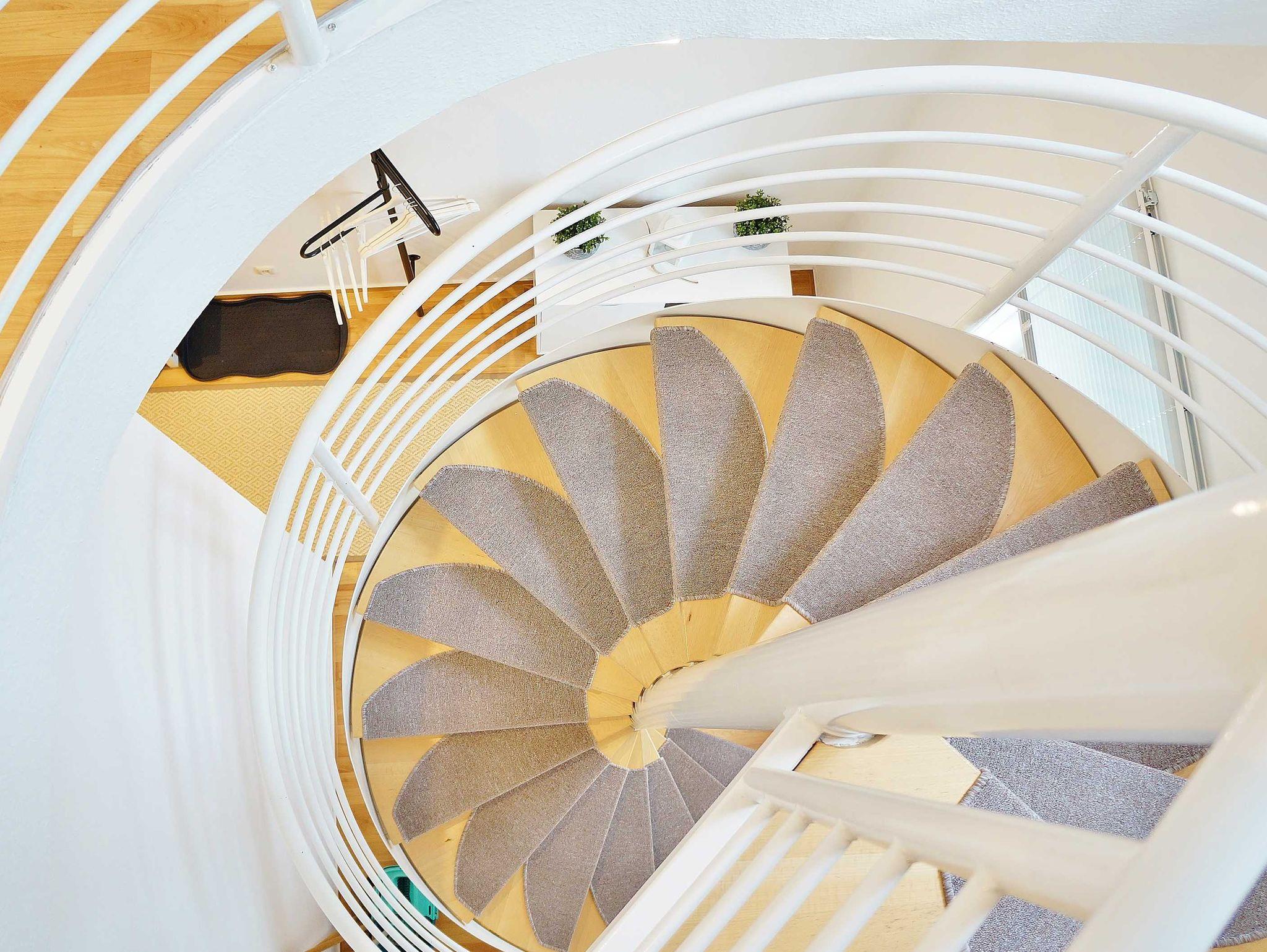 Flur mit Garderobe sowie das Bad mit Dusche und WC. Über eine Wendeltreppe, welche auf Grund