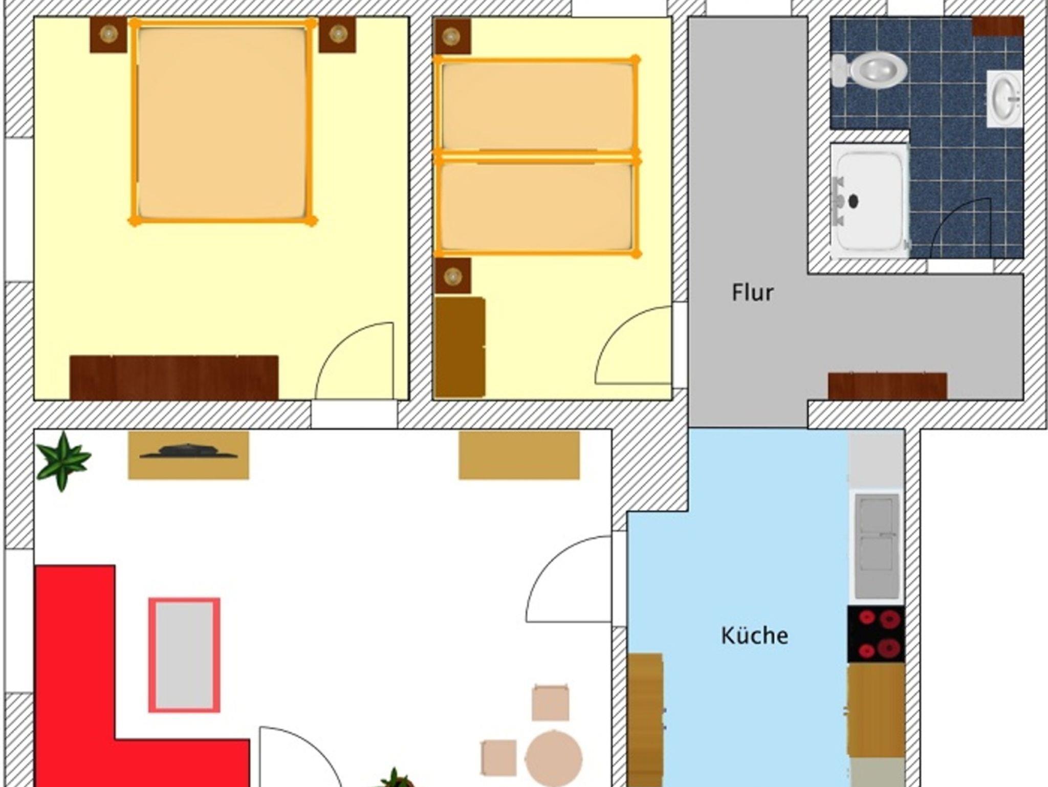 Unsere Ferienwohung 01, (80 qm, mit WLAN) befindet sich im Erdgeschoß und ist für maximal 6 Gäste eingerichtet. Sie ist modern ausgestattet und verfügt über einen Wohnraum mit Schlafcouch, TV und DVD-Player. Die Küche ist komplett ausgestattet mit Herd, Backofen, Kühlschrank, Mikrowelle, Kaffeemaschine, Toaster, Wasserkocher sowie einem Esstisch mit Stühlen. Im ersten Schlafraum steht ein Doppelbett mit Nachtschränken und Leselampen. Im zweiten Schlafraum sind zwei Einzelbetten ebenfalls mit Nachtischen und Leselampen vorhanden. Das moderne Bad verfügt über Dusche, Waschtisch und WC. In der Ferienwohung kann zusätzlich auch ein kleines Kinderreisebett sowie ein Hochstuhl bereit gestellt werden. Eine Erstaustattung von Bettwäsche und Handtücher kann gegen Aufpreis dazu gebucht werden.