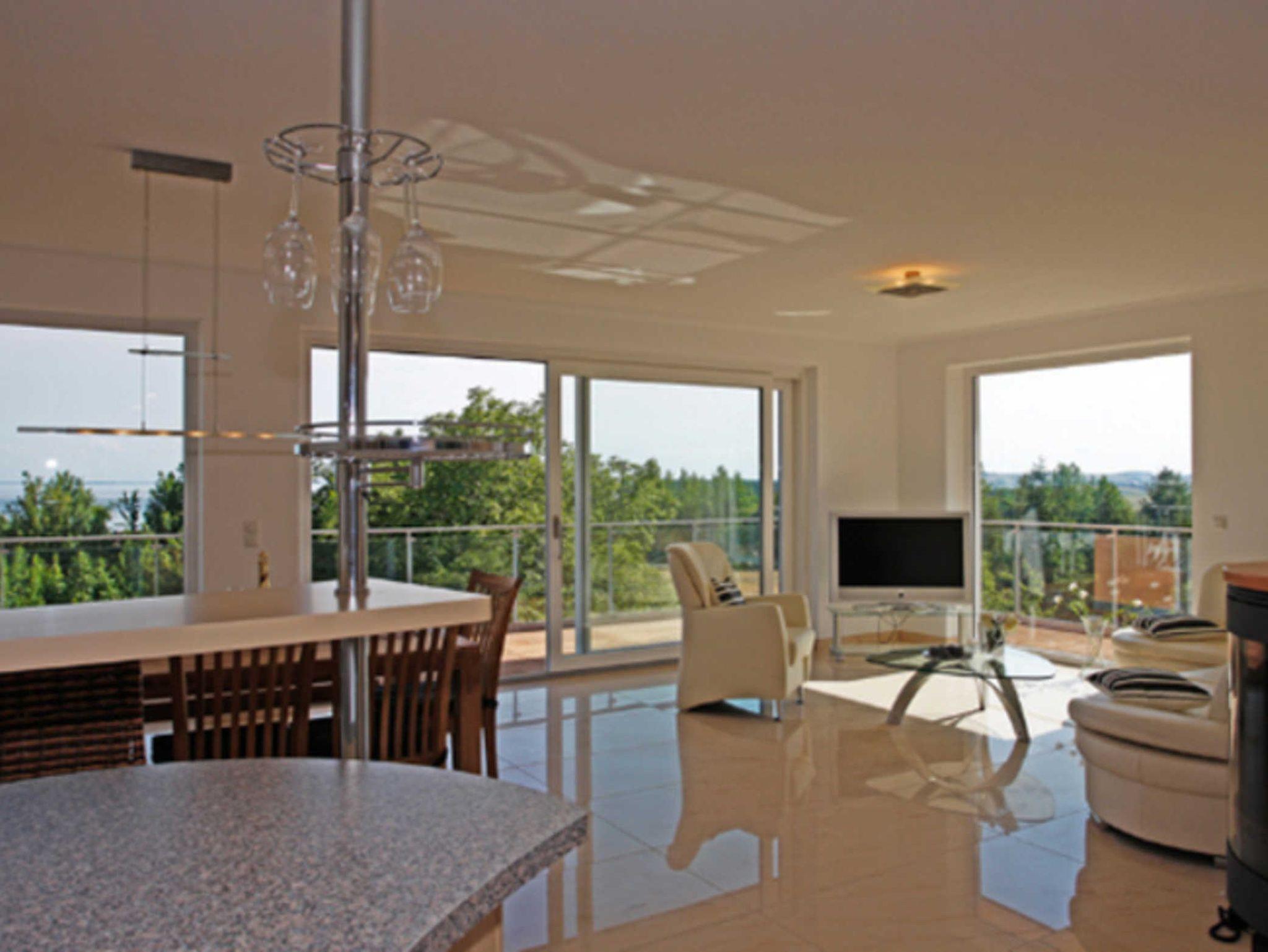 32 m² großen umlaufenden Balkon, nach Süden mit Blick auf die Ostsee und nach Westen mit Blick auf den Bodden und die Zickerschen Berge.