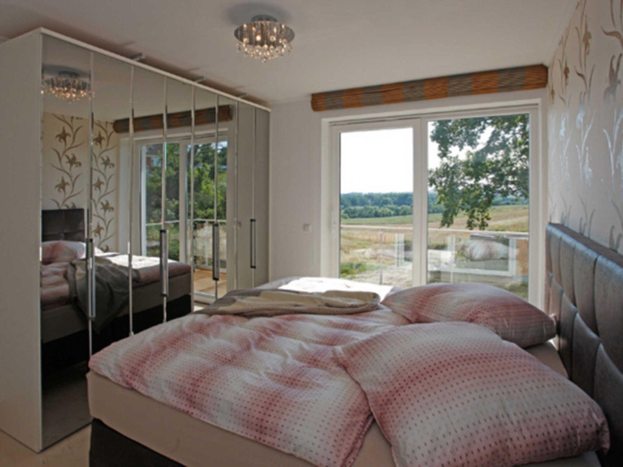 Für erholsame Stunden nach eienem erlebnisreichen Tag befindet sich auch im Schlafzimmer ein Fernseher. Wenn Sie das Gefühl leiben, im Freien zu schlafen, öffnen Sie einfach die Schiebetür zum Westteil des umlaufenden Balkons. Dann können sie mit Blick zum Bodden sogar den Sonnenuntergang erleben.