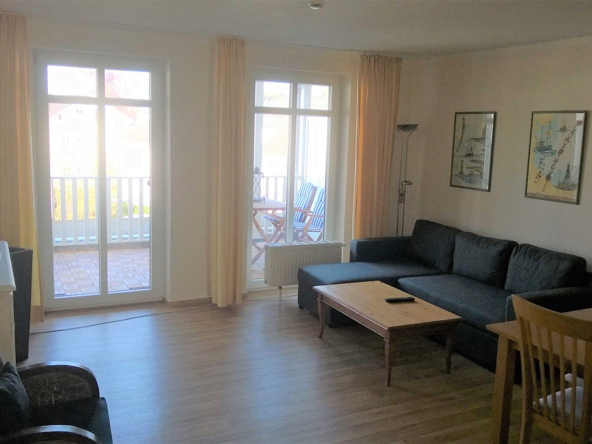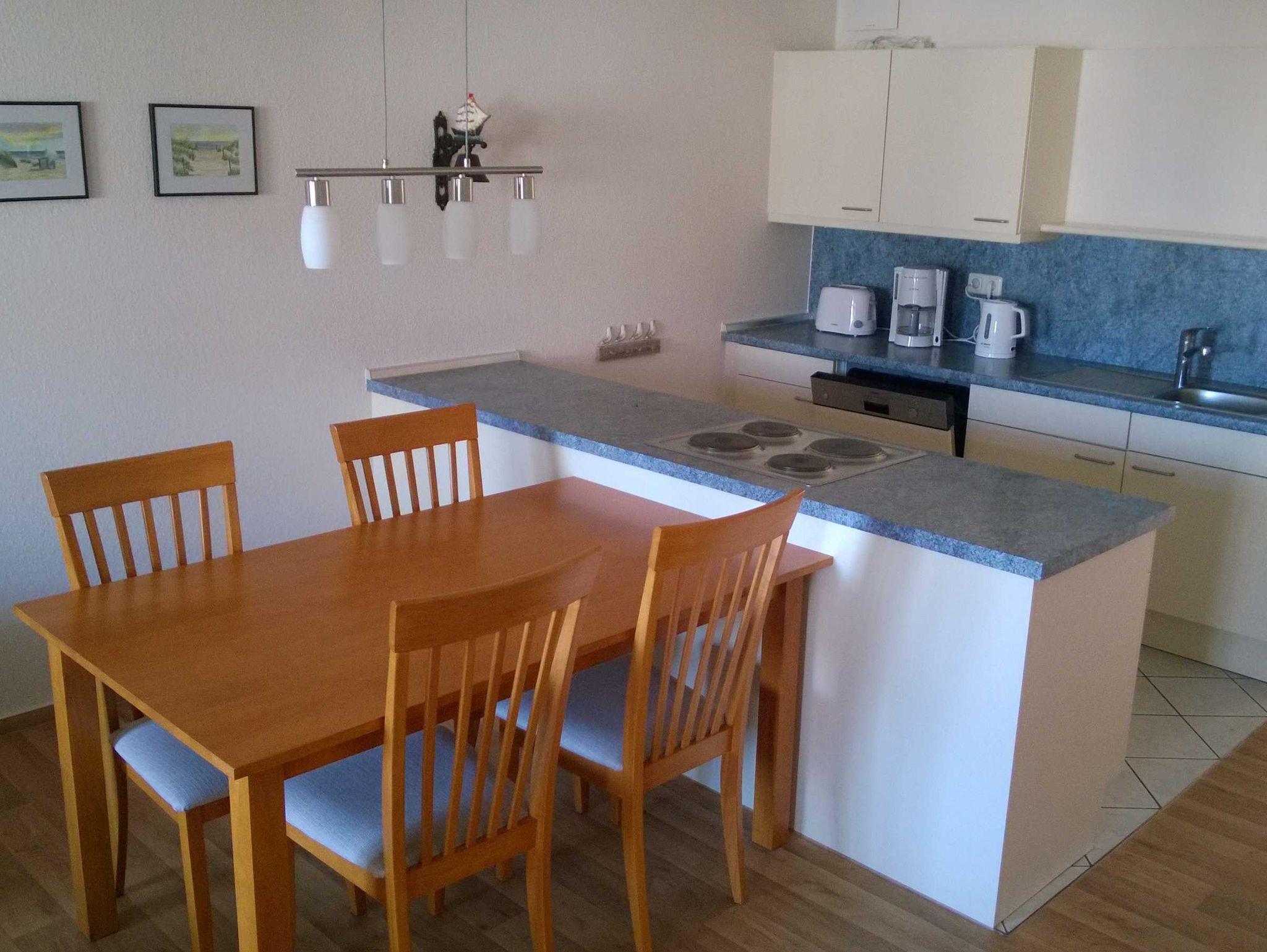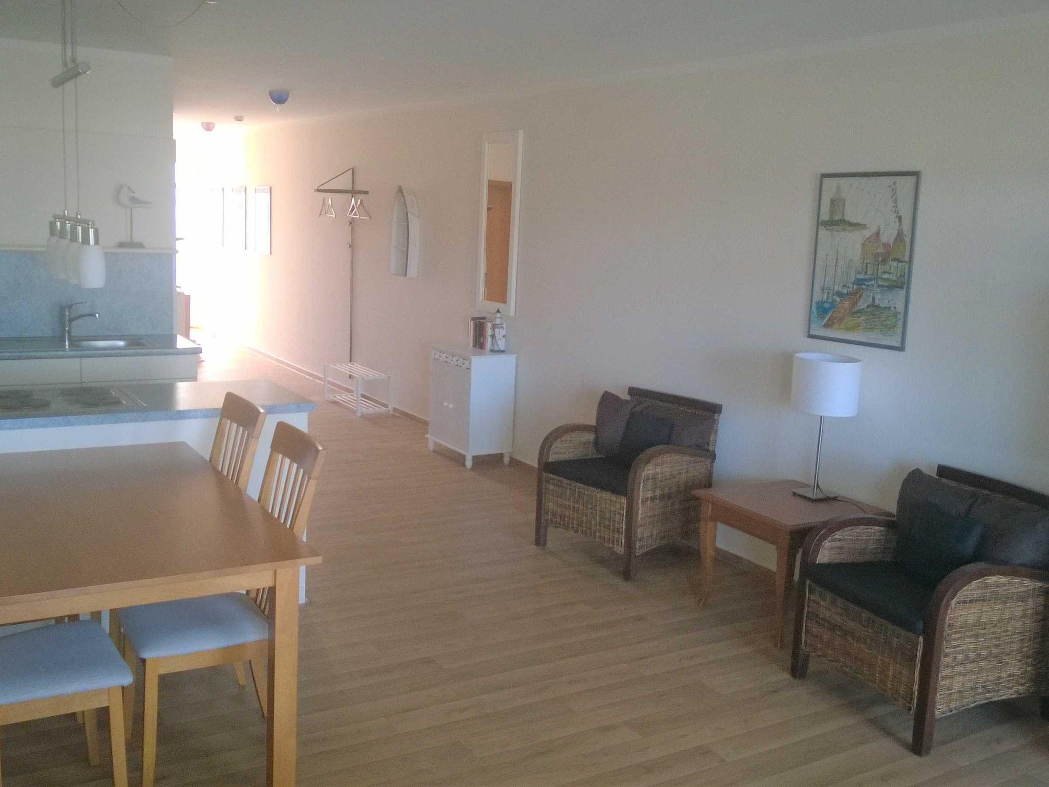 Auf einer Grundfläche von ca. 65 qm können sich vier Erwachsene bequem aufhalten und sich wohlfühlen. Neben dem großen Wohnzimmer mit Essbereich gibt es ein Schlafzimmer mit Doppelbett, sowie ein Bad und eine umfangreich ausgestattete offene Küche. Im Wohnzimmer lädt eine gemütliche Sofalandschaft, die mit wenigen Handgriffen zu einer Schlafmöglichkeit für 2 Personen wird, zum Erholen nach einem langen Strandtag, einer Wanderung zu Fuß oder per Rad oder einem anderen Ausflug ein. Zur technischen Ausstattung gehört ein 50-Zoll Flachbildfernseher, CD/DVD-Player und eine Musikanlage. Ein W-LAN-Zugang zur kostenlosen Nutzung ist selbstverständlich vorhanden. Der grosse Balkon lädt zum Verweilen zwischen den Ausflügen oder einem Strandtag ein. Er ist auch gross genug um dort z.B. zu Frühstücken. In der komplett ausgestatteten offenen Küche finden Sie ein Cerankochfeld, einen Backofen, einen Geschirrspüler, Kühlschrank mit Eisfach, Toaster, Kaffeemaschine, Wasserkocher und umfangfreiche Küchenutensilien. Das Schlafzimmer mit Doppelbett (2x 0,90 m x 2,00m) ist zusätzlich mit einem 32 Zoll Flachbildfernseher ausgestattet. Nachtischablagen und Kleiderschränke sind selbstverständlich. Wohn- und Schlafzimmer sind mit einem Laminat-Fußboden ausgelegt. Die Ausstattung des Bades besteht aus einer Duschkabine, Waschbecken und WC. Mitgebrachte Fahrräder können im Keller abgestellt werden.