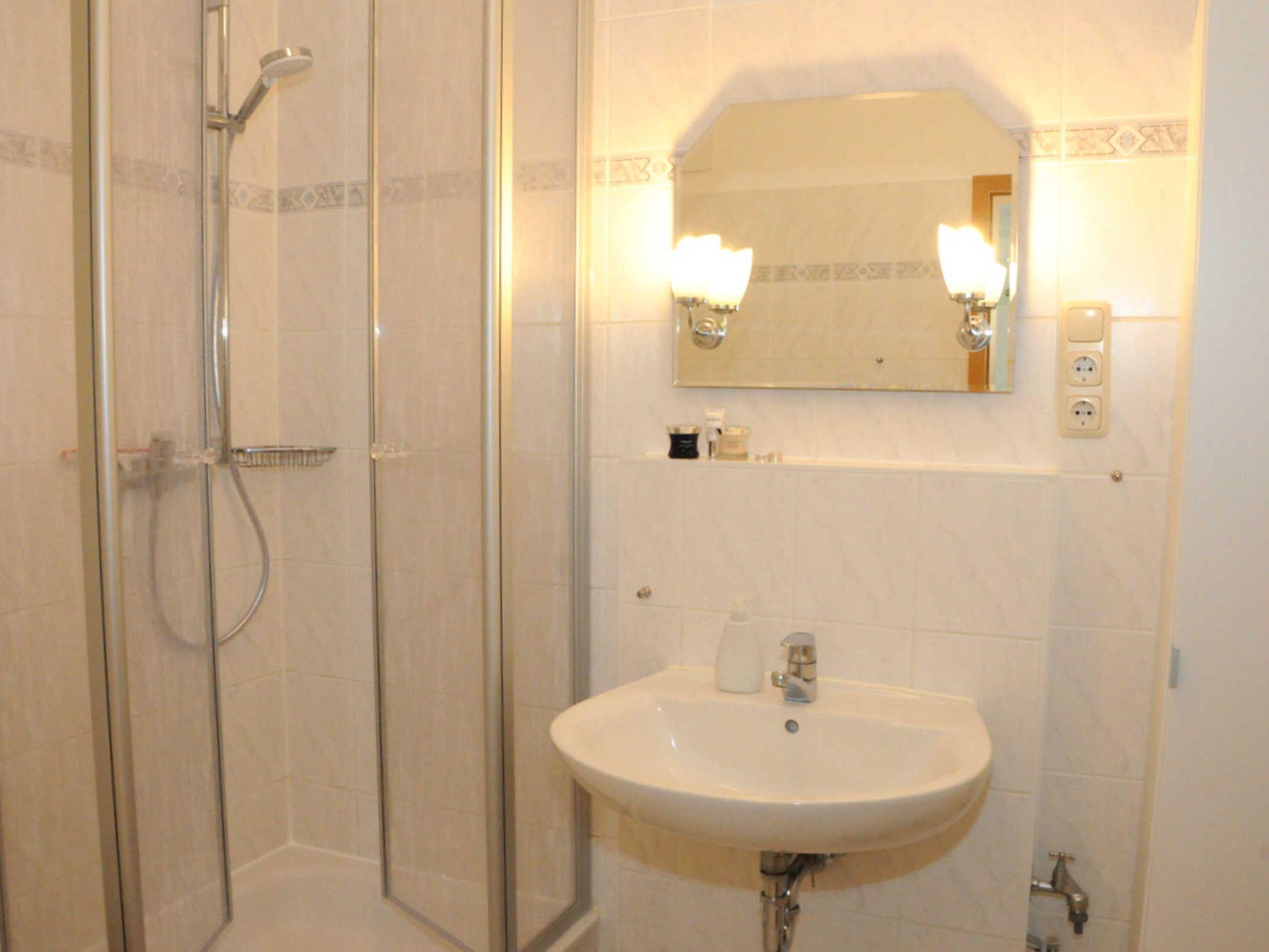 Das helle Badezimmer ist mit einer Dusche ausgestattet.
