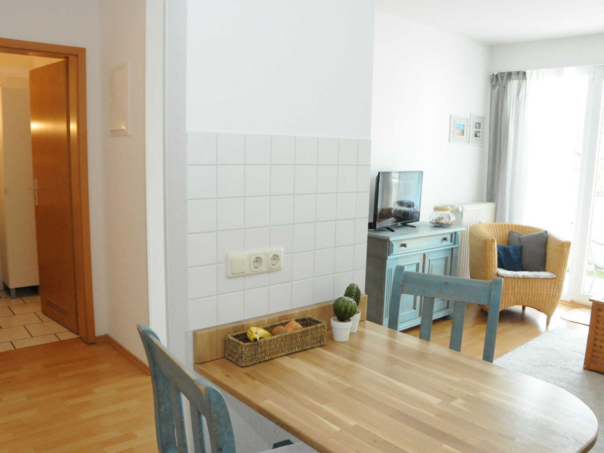 Hell und freundlich empfängt Sie diese 2-Zimmer-Ferienwohnung mit ca. 40m². Bis zu 2 Erwachsene finden hier Ruhe und Erholung in 250m Strandnähe. Nachdem Sie Ihre Garderobe im Eingangsbereich abgelegt haben, betreten Sie den lichtdurchfluteten Wohn- und Essbereich, in dem Sie sich sofort wie zu Hause fühlen werden. Ein komfortables Sofa, ein TV, sowie ein Esstisch mit ausreichend Platz bietet Ihnen viel Raum für Ihre Freizeitgestaltung. Auf dem möblierten Balkon können Sie ausgiebig frühstücken oder ein gutes Buch genießen.