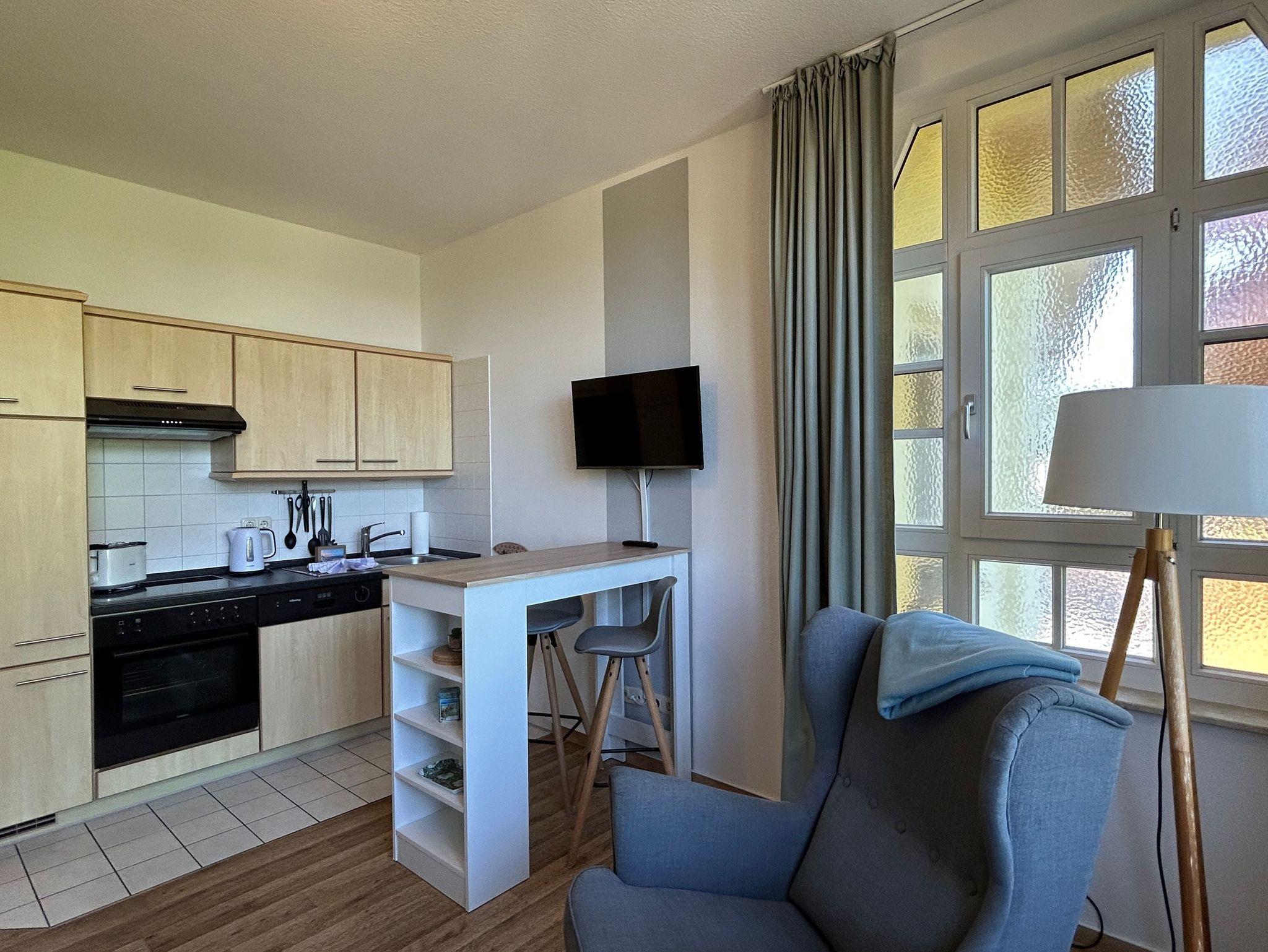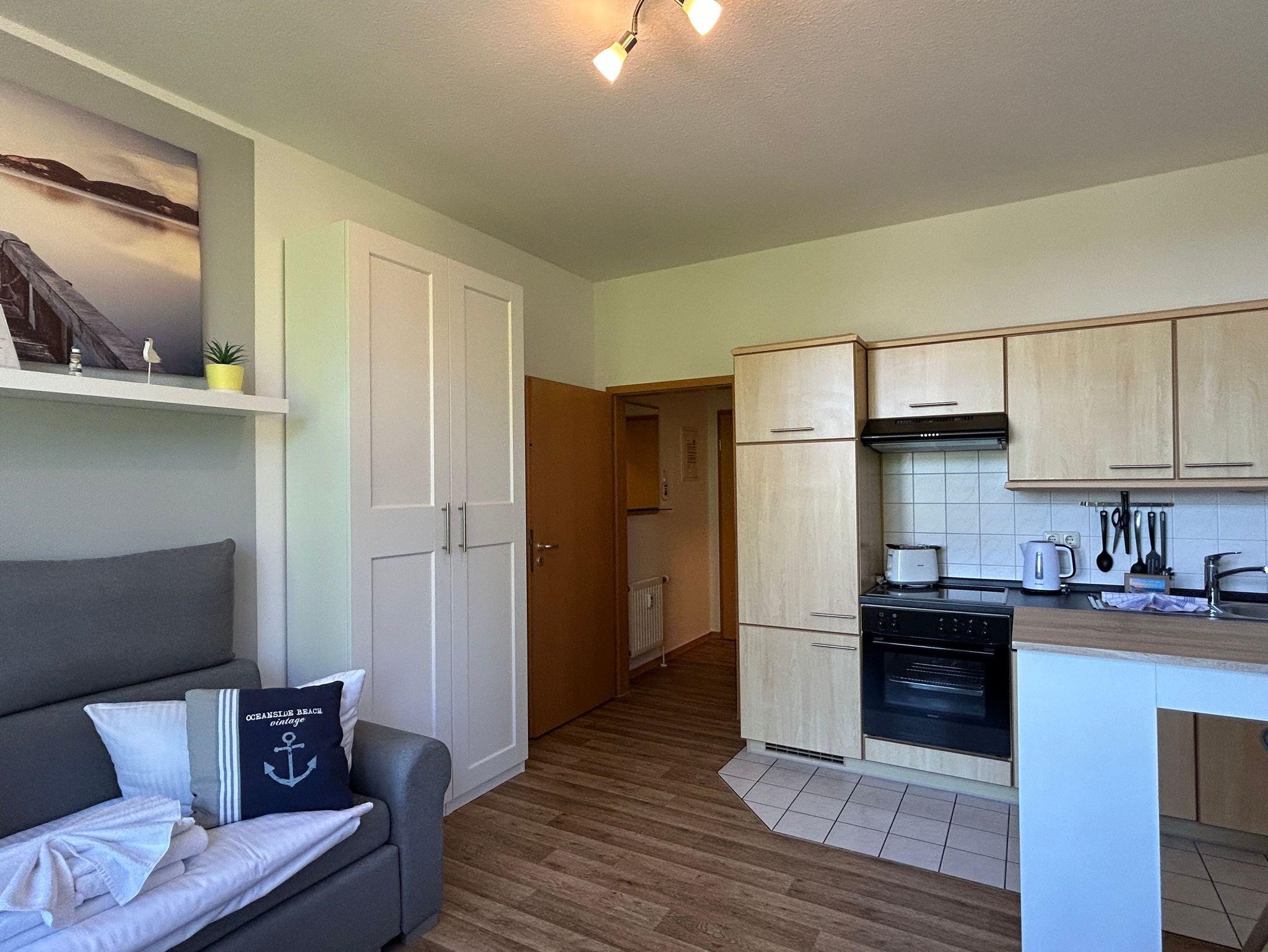 Gemütliche 1-Zimmer-Ferienwohnung mit Meerblick und moderner Ausstattung in Göhren, ideal für einen entspannten Urlaub zu zweit.