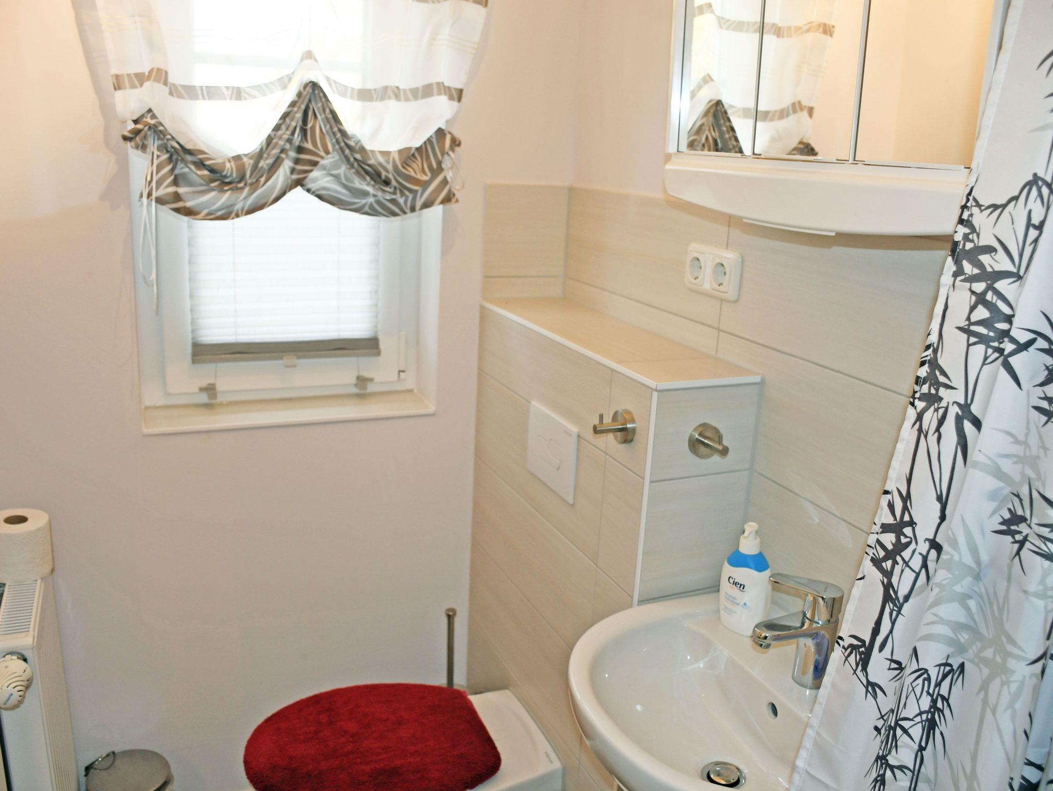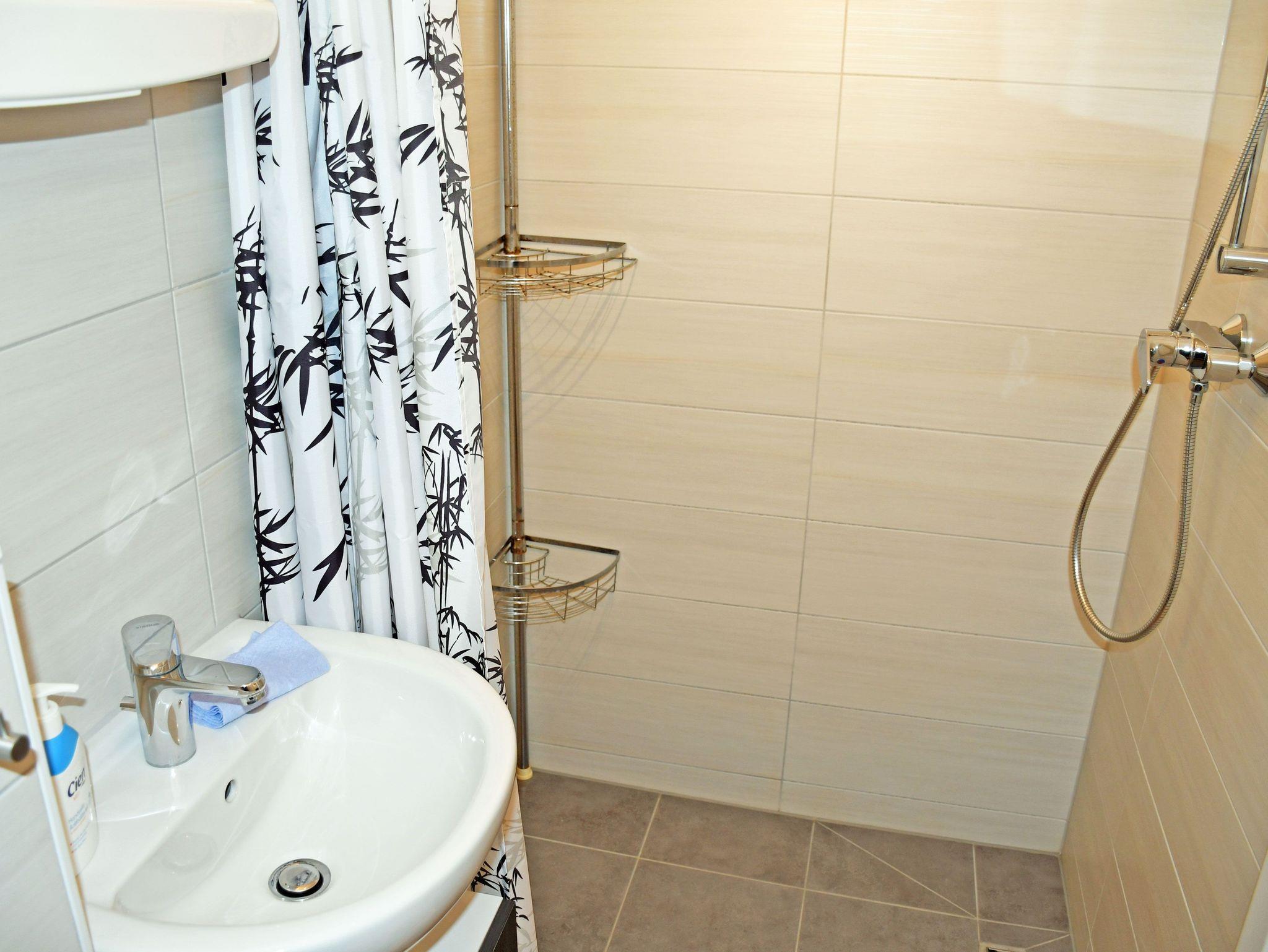 Das moderne Bad ist mit Dusche, WC und Waschtisch ausgestattet und verfügt über Tageslicht.