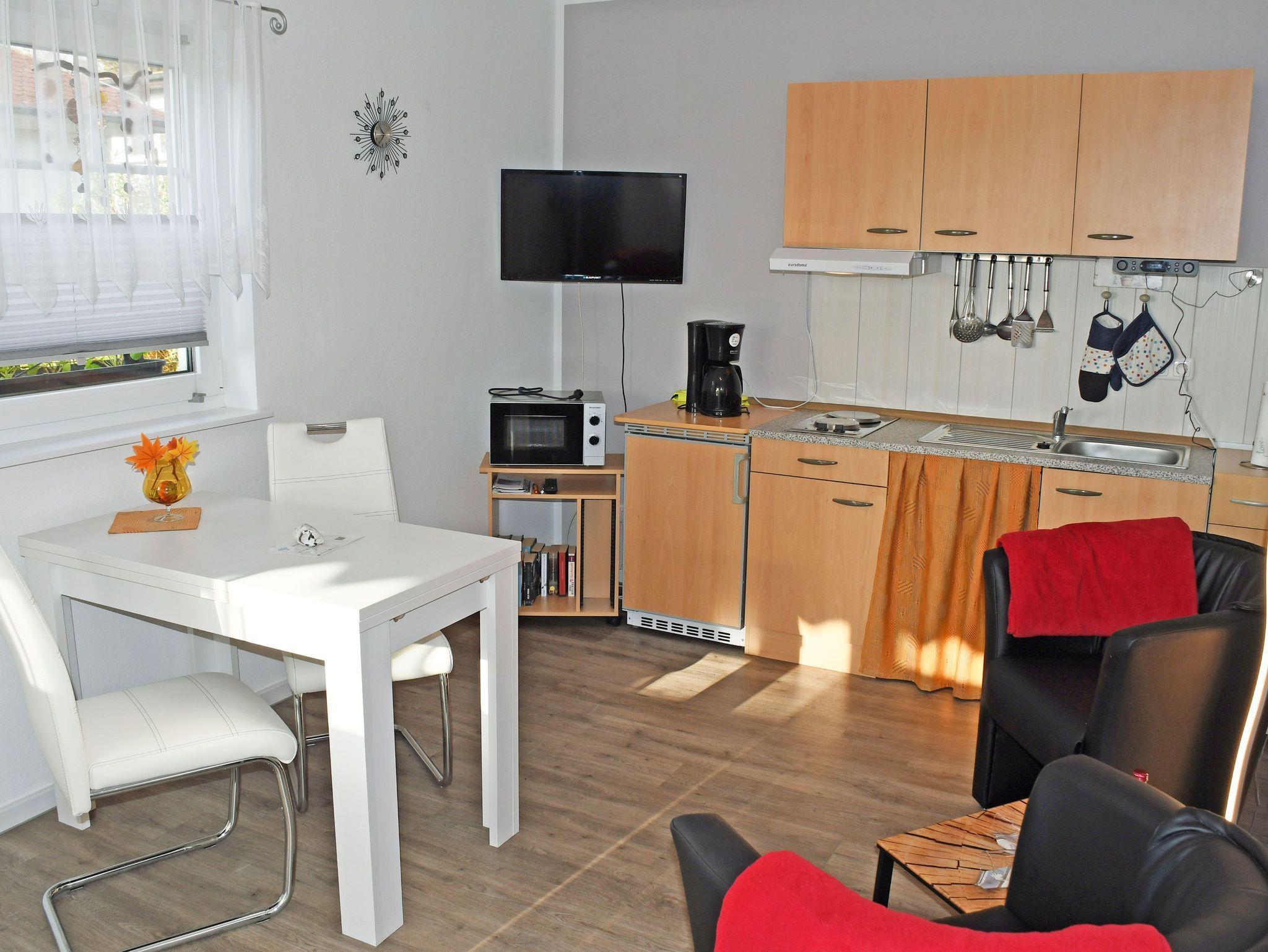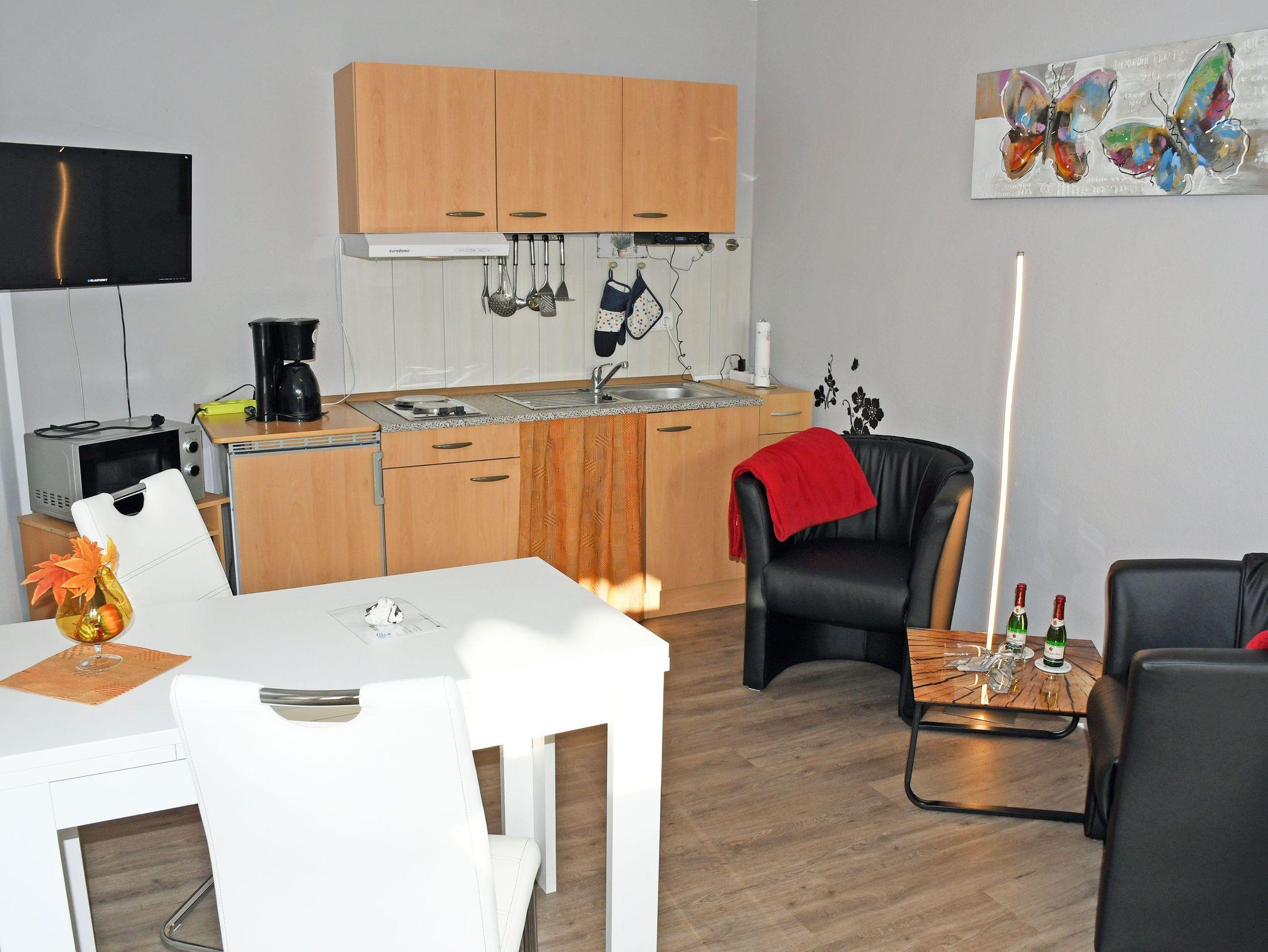 Über einen separaten Eingang gelangt man in den Wohnraum mit Sitzgelegenheit, Flachbild-TV und Küchenzeile. Diese ist mit einem kleinen Herd, Abzugshaube, Mikrowelle, Wasserkocher, Kaffeemaschine, Toaster und Kühlschrank komplett ausgestattet. Hier stehen auch ein Esstisch und Stühle.