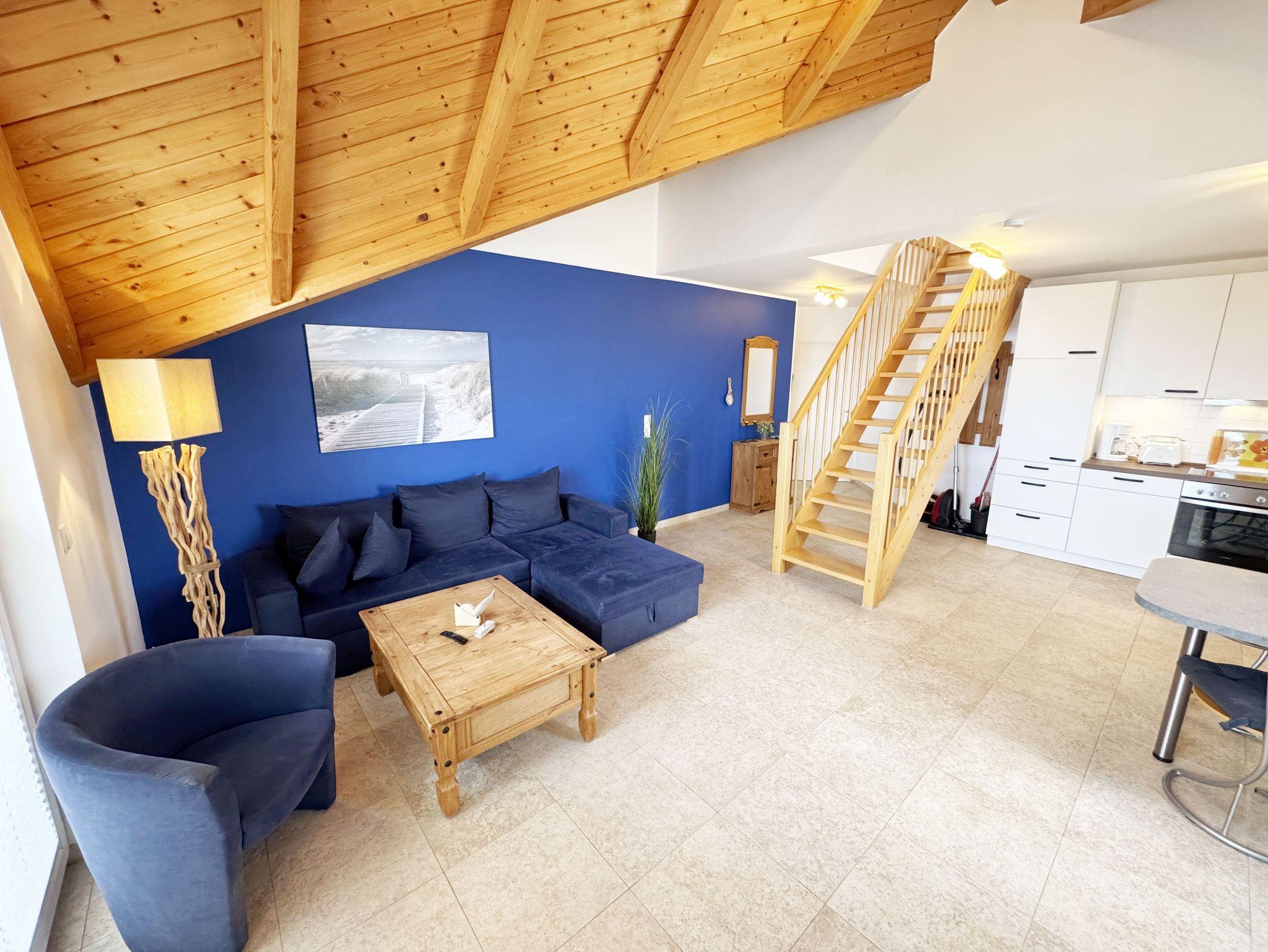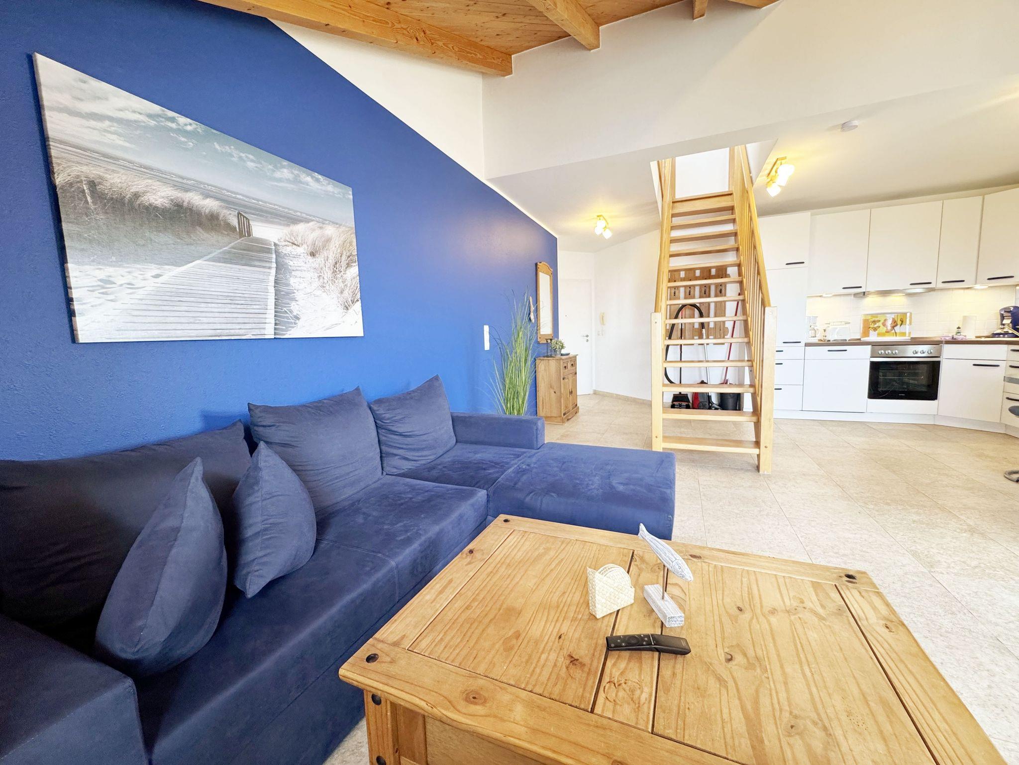 Die komfortable Maisonette Ferienwohnung (Nichtraucher) bietet mit ca. 53 qm Platz für 2 Personen und ein Kleinkind bis 3 Jahre im Kinderreisebett. Die Wohnung befindet sich in der 2. Etage. Der Wohn- und Essbereich besteht aus einer gemütlichen Couchecke, sowie einer Anrichte mit Smart-TV. Sie brauchen auch im Urlaub auf einen Internetzugang (WLAN) in Ihrer Wohnung nicht zu verzichten. Dieser ist für Sie inklusive! Gleichzeitig finden Sie hier den angrenzenden Essbereich mit einer voll ausgestatteten modernen Küchenzeile mit Geschirrspüler, einer Spüle, einen Kühlschrank mit Eisfach, einen Backofen mit 4-Zonen-Cerankochfeld, einen Wasserkocher, einer Kaffeemaschine, einer Senseo-Padmaschine, diversen Küchenutensilien sowie einen Esstisch mit Bestuhlung. Vom Wohnbereich aus können Sie den bestuhlten Balkon mit Sonnenschirm erreichen. Hier können Sie bei einem Glas Wein den herrlich, traumhaften Panoramablick Richtung Nordstrand auf das Meer genießen. Das Schlafzimmer erreichen Sie über die Treppe, welche sich im Wohnbereich befindet. Hier finden Sie ein Doppelbett mit 2 einzelnen Matratzen (je 0,80 m x 2,00 m), eine Kommode mit SMART-TV sowie einen Kleiderschrank. Auf der gleichen Etage befindet sich das Bad welches über eine ebenerdige Dusche mit WC, einen Kosmetikspiegel und einen Fön verfügt. Insektenschutzgitter befinden sich zum Teil an den Fenstern. Bis zu 2 Haustiere können Sie gegen eine Gebühr dazu buchen. Der PKW-Stellplatz Nr. 09 befindet sich direkt am Haus. Die Erstausstattung eines Wäschepaketes (komplette Bettwäsche, 1 Duschhandtuch, 2 kleine Handtücher) können Sie bis 14 Tage vor der Anreise gegen einen Aufpreis dazu buchen oder durch eigene ergänzen. Ab 2 gebuchten Paketen erhalten Sie einmalig 1 Geschirrtuch und einen Duschvorleger dazu.