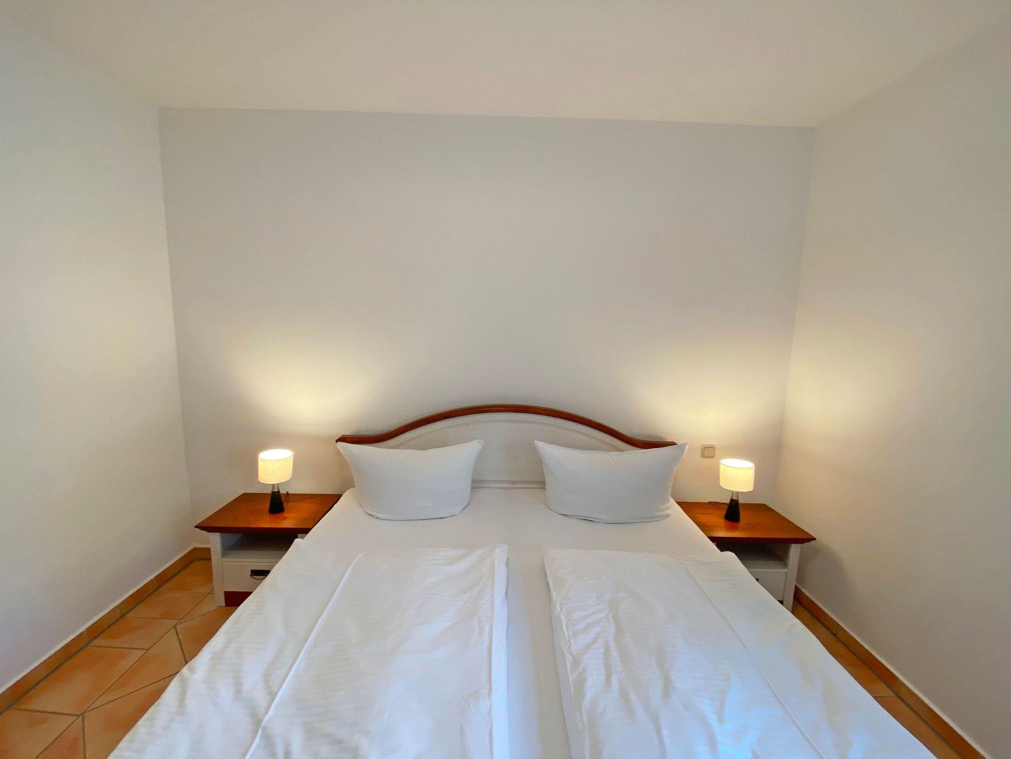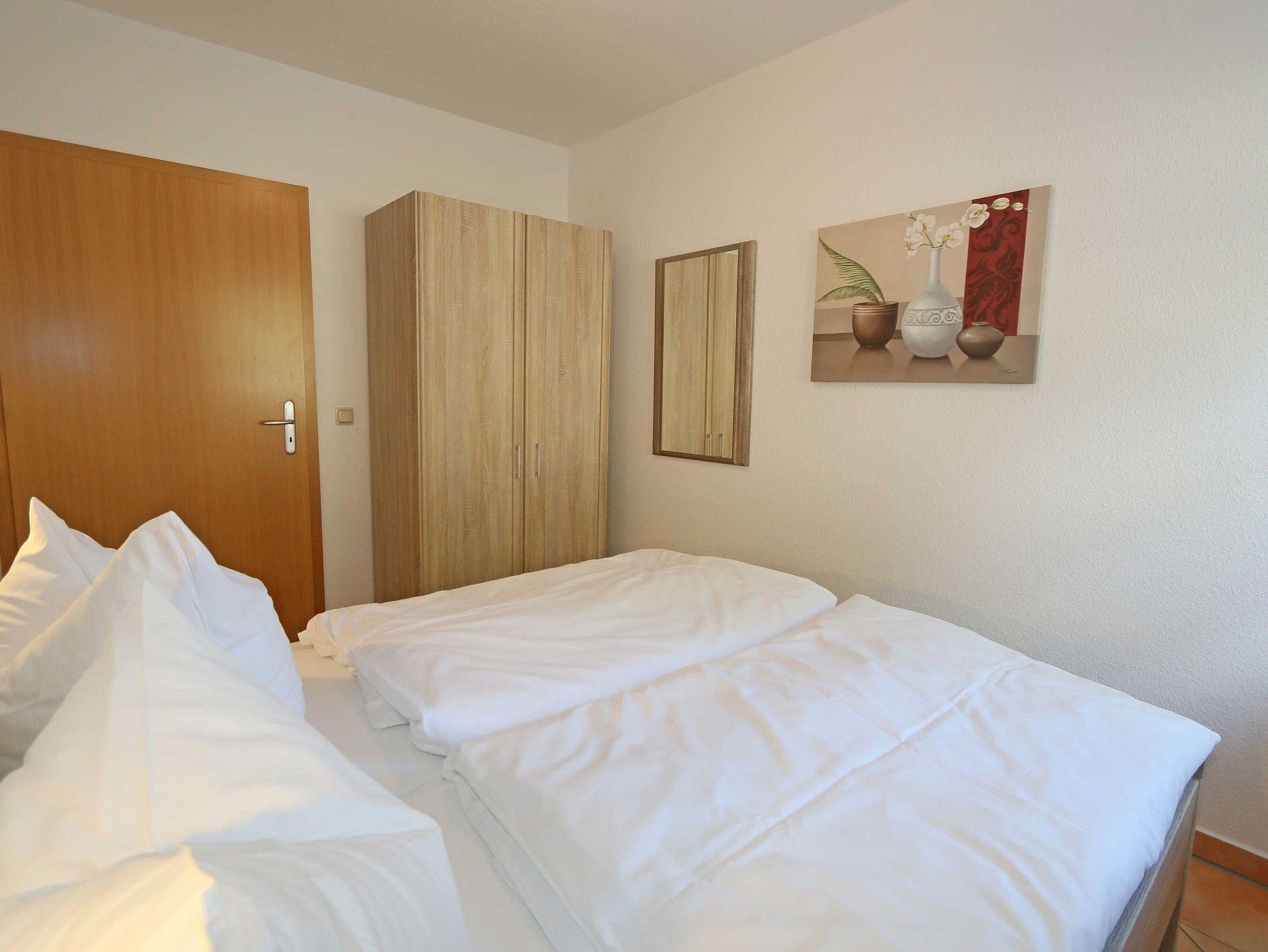 Die ca. 57m² große Nichtraucher-Wohnung befindet sich im Erdgeschoss des Hauses Südstrand und bietet Ihnen ausreichend Platz für 2 bis 4 Personen. Der moderne Wohnbereich lädt mit einer gemütlichen Polsterecke mit Couchtisch und Leselampe zur Entspannung ein. Für Ihre Unterhaltung können Sie dabei einen Flachbild-TV, einen DVD-Player und ein DAB-Radio nutzen. Der angrenzende Essbereich wird durch eine moderne Küchenzeile mit einer Kühl-Gefrierkombination, einem Geschirrspüler, einen Backofen und 4-Zonen Ceran-Kochfeld, einer Kaffeemaschine, einen Toaster, einen Mixer, eine Tassimo-Kaspelmaschine und einen Wasserkocher sowie diverse Küchenutensilien, abgerundet. Der freundliche Essplatz befindet sich direkt am Fenster. Vom Wohnbereich gelangen Sie auf die überdachte und bestuhlte Terrasse (Ost), welche Sie bereits in den Morgenstunden mit Sonne verwöhnt. Alle Räumlichkeiten können Sie vom Flur mit Garderobe erreichen sowie beide Schlafzimmer. Im ersten Schlafzimmer befinden sich ein Doppelbett (1,80 m x 2,00 m) mit Federkernmatratzen und Nachttischablagen mit Beleuchtung und ein großer Kleiderschrank. Das kleinere Schlafzimmer ist mit einem Doppelbett (1,60 m x 2,00 m) und einem Kleiderschrank ausgestattet. Beide Schlafzimmer können durch Außenrollos verdunkelt werden und verfügen über Insektenschutzgitter sowie Plissees, somit steht einem ruhigen Schlaf nichts im Wege. Der Sanitärbereich wird durch eine Dusche, WC, Fön, Kosmetikspiegel und einem Waschplatz abgerundet. Ein kleiner Abstellraum bietet eine gute Möglichkeit Dinge zu verstauen. Unteranderem befinden sich hier diverse Reinigungsutensilien. Haustiere sind nicht erlaubt. Auch im Urlaub brauchen Sie auf einen Internetzugang (WLAN) in Ihrer Wohnung nicht zu verzichten. Dieser ist inklusive. Die Münzbetriebene Sauna steht allen Gästen des Hauses zur Verfügung. Ein inklusiver PKW-Stellplatz befindet sich direkt am Haus. Die Erstausstattung eines Wäschepaketes (komplette Bettwäsche, 1 Duschhandtuch, 2 kleine Handtücher) können Sie bis 14 Tage vor Anreise gegen einen Aufpreis dazu buchen oder durch eigene ergänzen. Ab 2 gebuchten Paketen erhalten Sie einmalig 1 Geschirrhandtuch und 1 Duschvorleger hinzu.