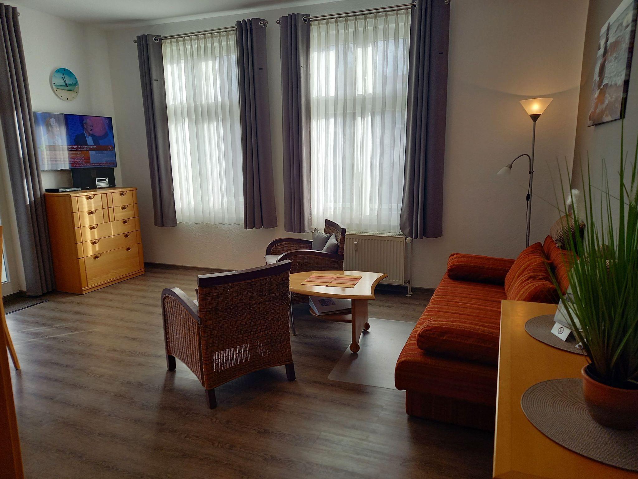 Wohnraum: große gemütliche Schlafcouch, Couchtisch, zwei Sessel, großer runder Esstisch mit Sitzmöglichkeit für 4 Personen, Mini ? CD Stereoanlage, Flachbildfernseher mit DVD - Funktion und Kabelempfang, kleine DVD - Sammlung, eine gut sortierte kleine Familienbücherei, Spielesammlung, großer Kleiderschrank, 2 Anrichten / Kommoden