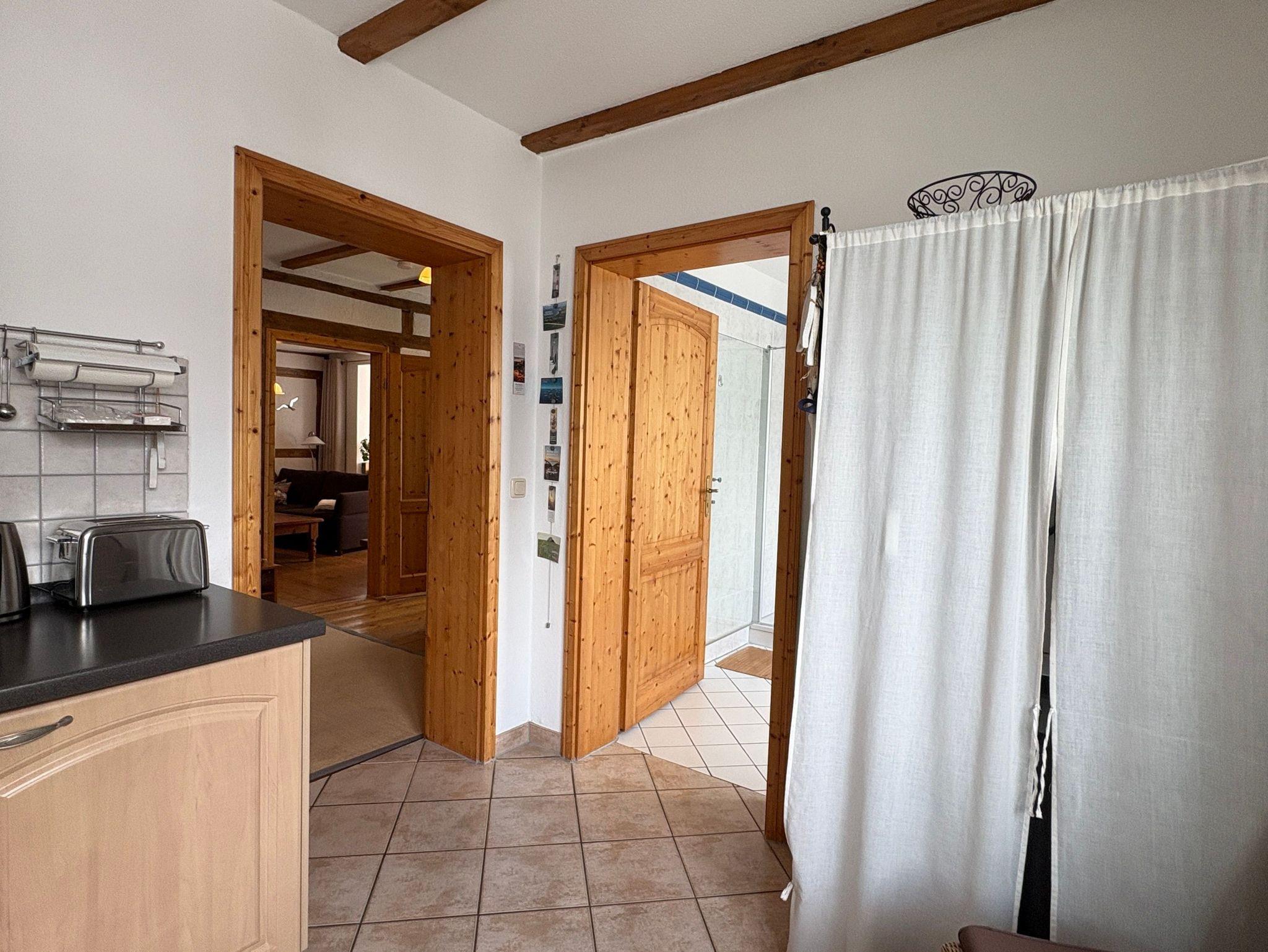 • Küche und Dusch-Bad. Das geräumige Badezimmer wurde 2022 modernisiert und hat jetzt einen fußbodenebenen Eintritt in die Dusche.