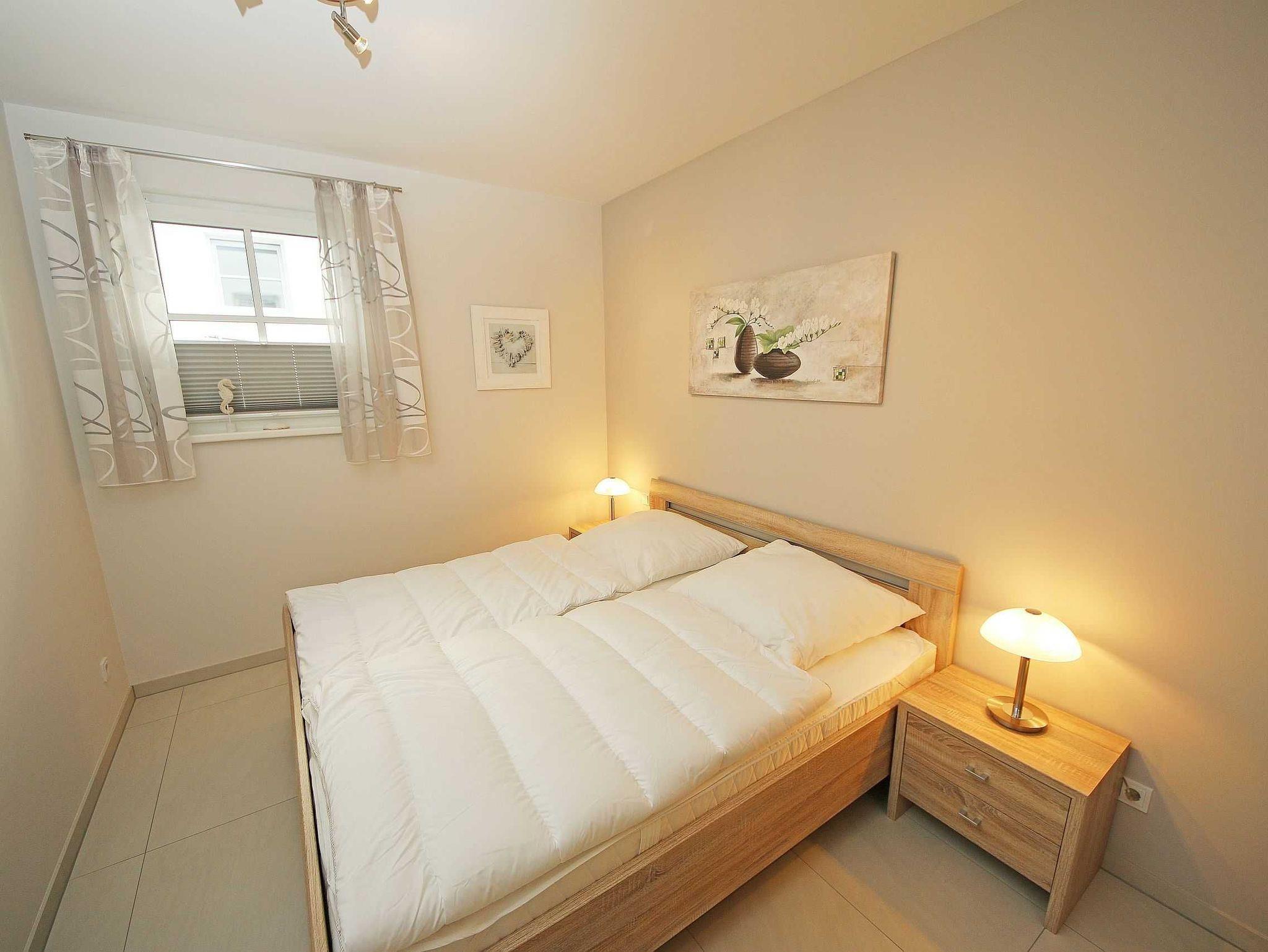 Die geschmackvoll eingerichtete 2-Raumferienwohnung (Nichtraucher) befindet sich im Erdgeschoss der Villa Antje. Durch die hellen, freundlichen Bodenfliesen und der in allen Räumen verlegte Fußbodenheizung ergibt sich eine angenehme Wohnatmosphäre. Der gemütliche Wohnbereich bietet für die 3. Person eine vollwertige Schlafcouch mit Ottomane (1,25m x 2,00m). Zusätzlich haben Sie einen Couchtisch, eine Leselampe sowie ein Smart-TV, Blu Ray Player und Mini-Stereo-Anlage. Das zweiflügelige Fenster im Wohnzimmer ist mit einem Insektenschutzgitter ausgestattet sowie das Fenster im Küchenbereich. Auch im Urlaub brauchen Sie in der Wohnung nicht auf einen Internetanschluss (WLAN) verzichten. Dieser ist für Sie inklusive! Die angrenzende Wohnküche mit Ceranfeld, Geschirrspüler, Kühlschrank mit Gefrierfach, Backofen, Wasserkocher, Kaffeemaschine, Toaster und diverse Küchenutensilien laden zum Kochen ein. Auf die überdachte Terrasse mit Süd-Ost-Ausrichtung, Möblierung und eigenem Strandkorb gelangen Sie durch den Wohnbereich. Das Schlafzimmer verfügt über ein Doppelbett (2 x 0,90 x 2,00m) mit Nachttischkonsolen, verstellbare Lattenroste, einen Kleiderschrank sowie Verdunklungsplissee. Im Schlafzimmer ist kein Platz für ein Kinderbett. Der komfortable Sanitärbereich wird durch einen ebenerdige Dusche, Handtuchheizkörper, Waschtisch, WC und Fön abgerundet. Das Schlafzimmer und das Duschbad verfügen jeweils über ein Insektenschutzgitter. Ein kleiner Abstellraum gehört zusätzlich zur Wohnung dazu. Über einen Fahrstuhl ist der zur Wohnung gehörende Tiefgaragenstellplatz (Nr. 3, Einfahrtshöhe 2,00m) im Untergeschoss zu erreichen. Ein allgemeiner Waschraum mit Waschmaschine und Trockner gegen Gebühr kann von allen Hausgästen genutzt werden sowie ein gemeinschaftlicher Fahrradabstellraum. Haustiere sind in der Wohnung nicht erlaubt. Die Erstausstattung von Bettwäsche ist pro Person inklusive. Ein Handtuchpaket ( 1 Duschhandtuch, 2 kleine Händehandtücher, sowie 2 Geschirrhandtücher) können Sie bis 14 Tage vor Anreise gegen einen Aufpreis dazu buchen bzw. durch Eigenmitnahme ergänzen.