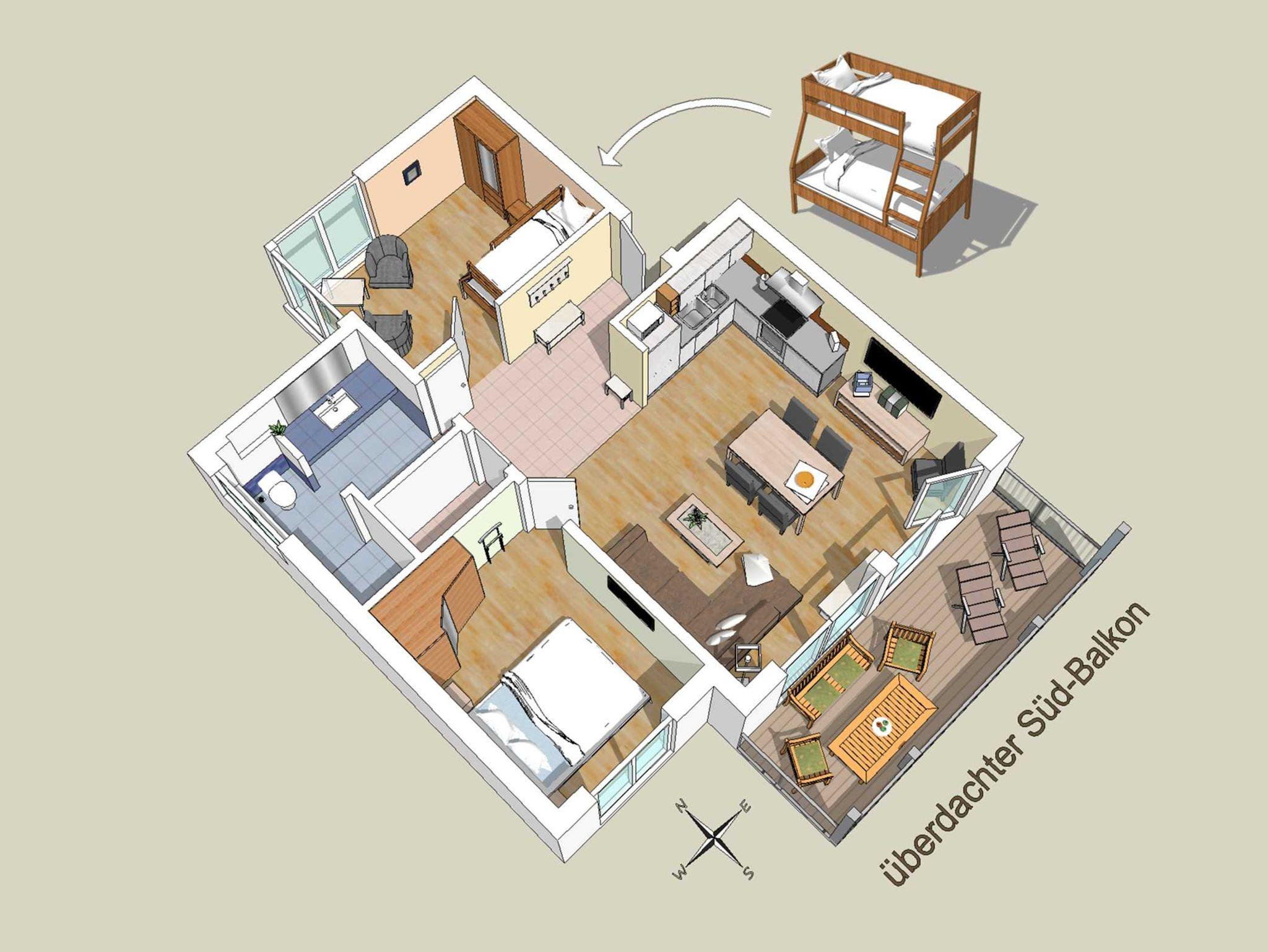 Moderne 3-Zimmer-Wohnung in Göhren mit Meerblick, Sauna und überdachtem Südbalkon für entspannte Urlaubstage.