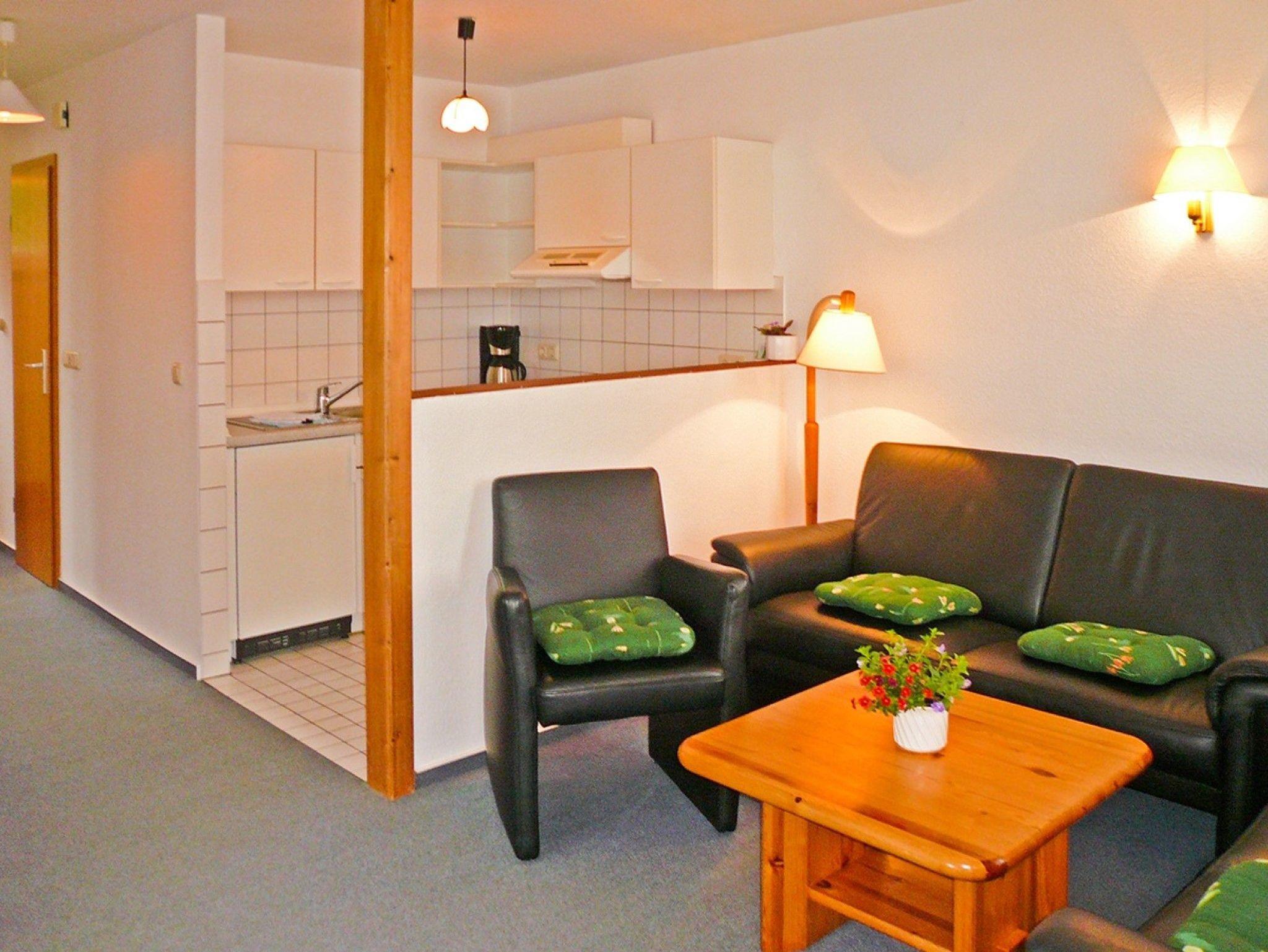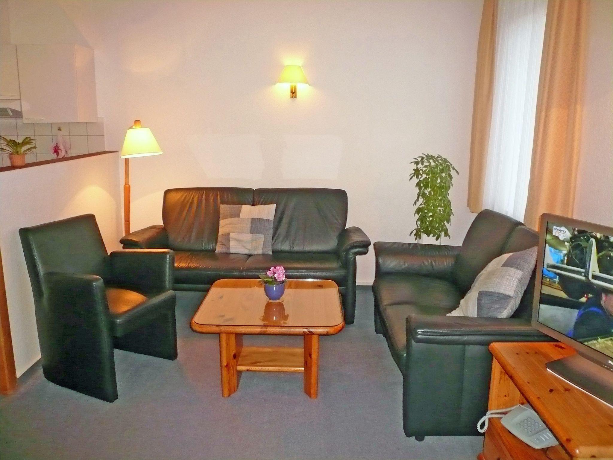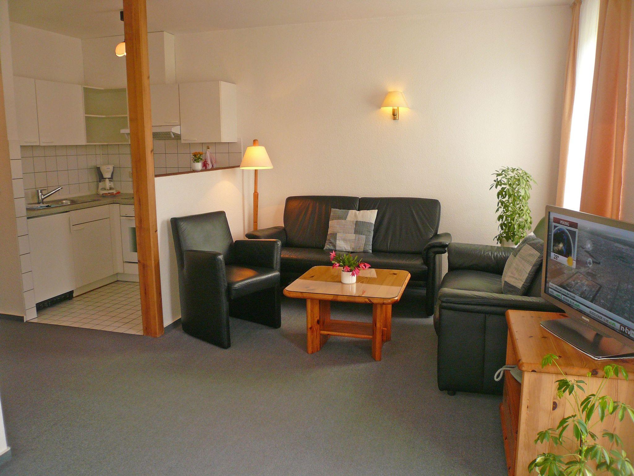 • Ein Wohnzimmer mit Couchecke und Flachbild TV (Sat TV). Integriert ist die gut ausgestattete Küchenecke mit Herd, Backofen, Kühlschrank mit Gefrierfach sowie eine Sitzecke.