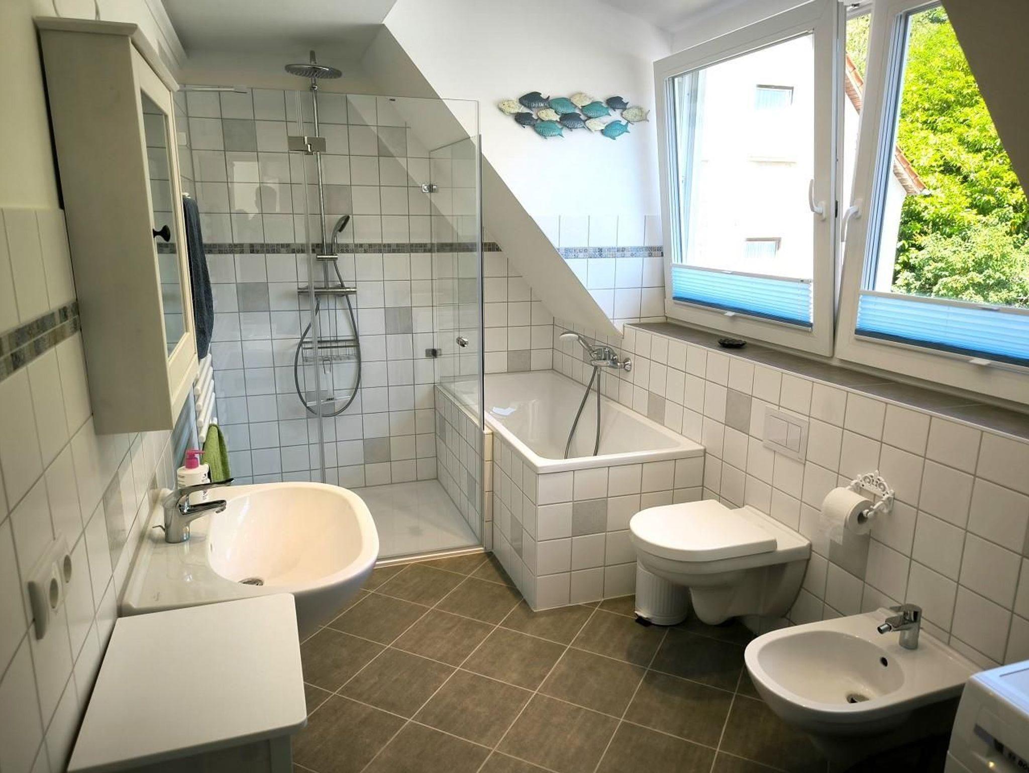 - Bad mit großer ebenerdiger Dusche, Badewanne, Bidet, WC, Föhn und Waschtrockner