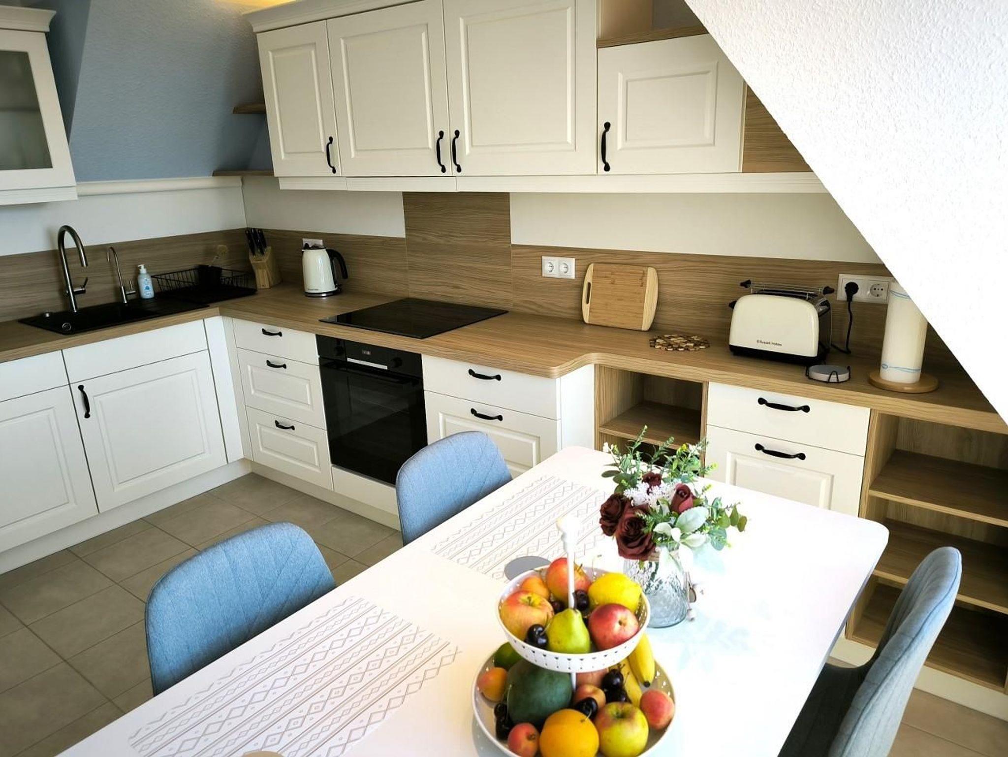 - große Küche mit Induktionskochfeld, Backofen, großer Kühl- Gefrierkombination, Geschirrspüler, Toaster, Kaffeemaschine, Wasserkocher und hochwertigen Küchenutensilien, Osmose-Trinkwasser-Filteranlage
