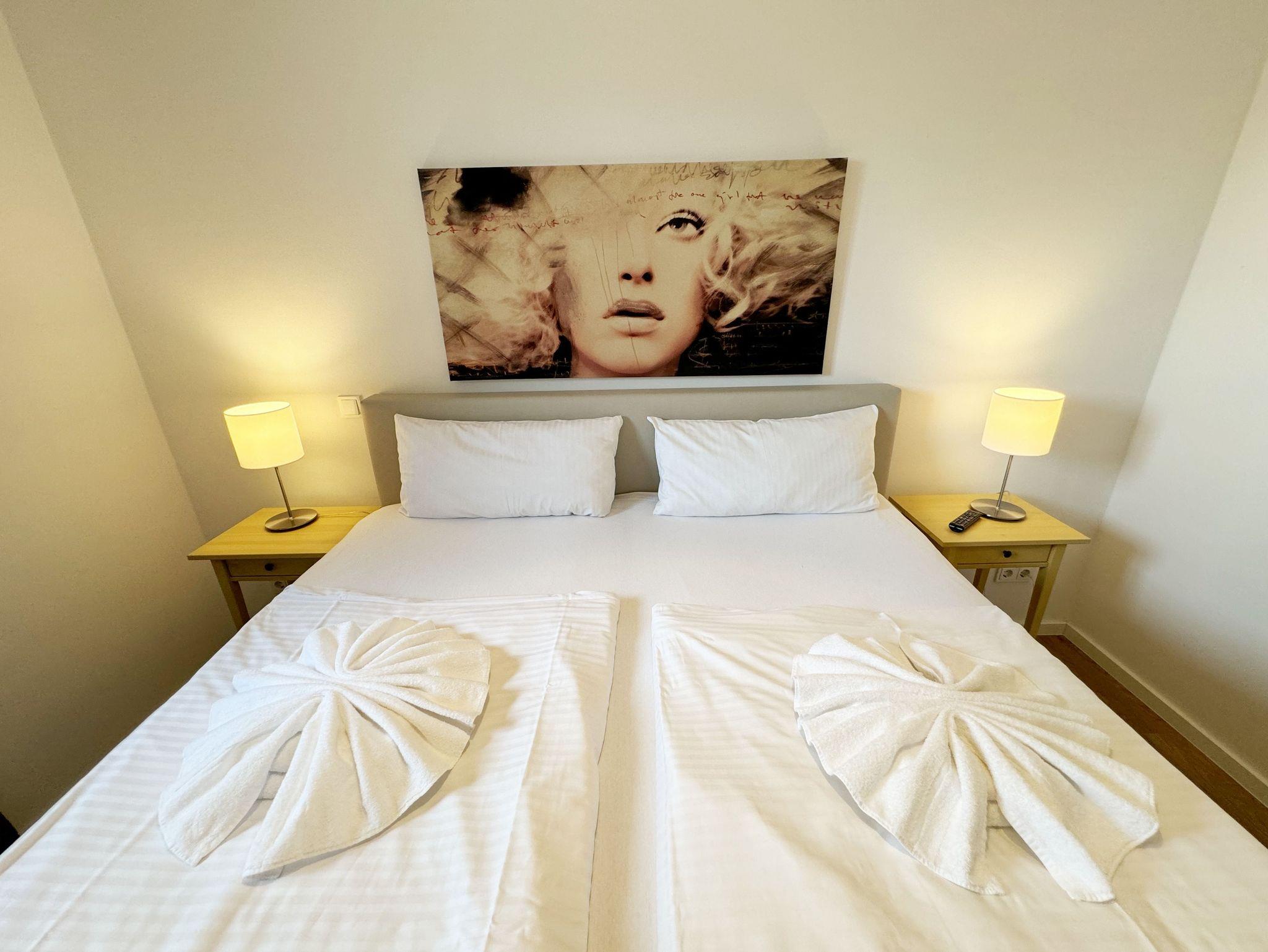 Die Wohnung Nr. 4 der Villa Anni ist eine komfortable, ca. 57 m² große und stilvoll eingerichtete Nichtraucherferienwohnung im ersten Obergeschoss. Sie bietet Ihnen ausreichend Platz für 2 bis 3 Personen. Der kombinierte Wohn-/Koch- und Essbereich mit der modernen und integrierten Küchenzeile lässt mit Ceranfeld, Backofen, Geschirrspüler, Mikrowelle, Kühlschrank mit Gefrierfach, Kaffeemaschine, Wasserkocher, Toaster und diversen Küchenutensilien keine Wünsche offen. Der Essbereich fügt sich der Küchenzeile an. Der offene Wohnbereich verfügt über eine gemütliche Sitzecke (Liegefläche 1,50m x 2,00m) mit Couchtisch, eine Leselampe, ein TV mit CD-Player, DAB-Radio und einen Blu-Ray Player. Auch auf einen Internetanschluss (WLAN) müssen Sie in Ihrem Urlaub nicht verzichten. Dieser ist für Sie inklusive! Eine Auswahl an Gesellschaftsspielen und Urlaubslektüre sorgt für eine gelungene Abwechslung. Der nach Nord/Osten mit Blick Richtung Meer ausgerichtete, und bestuhlte Balkon mit Sonnenschirm ist direkt vom Wohnbereich aus zu erreichen. Das Schlafzimmer verfügt über ein Boxspringbett mit Tonnentaschenfederkernmatratzen (1,80m x 2,00m), Nachttischablagen, Flachbild-TV und einen Kleiderschrank. Für einen ruhigen Schlaf sorgt eine Verdunklungsmöglichkeit sowie ein Insektenschutzgitter. Das Bad ist mit einer ebenerdigen Dusche, Waschplatz, Kosmetikspiegel, WC, Handtuchheizkörper und Fön ausgestattet. Im Schlafzimmer ist ein Insektenschutzgitter vorhanden. Alle Räumlichkeiten sind mit einer Fußbodenheizung versehen und sorgen für eine angenehme Wärme. Ein eigener PKW-Stellplatz (Nr. 4) befindet sich in der Tiefgarage (Einfahrtshöhe: 2,00 m) des Hauses. 1 kleiner Hund ist gegen eine Gebühr in der Wohnung erlaubt! Die Erstausstattung eines Wäschepaketes (komplette Bettwäsche, 1 Duschhandtuch, 2 kleine Handtücher) können Sie bis 14 Tage vor Anreise gegen einen Aufpreis dazu buchen oder durch eigene ergänzen. Ab 2 gebuchten Paketen erhalten Sie einmalig 1 Geschirrhandtuch und 1 Duschvorleger hinzu.