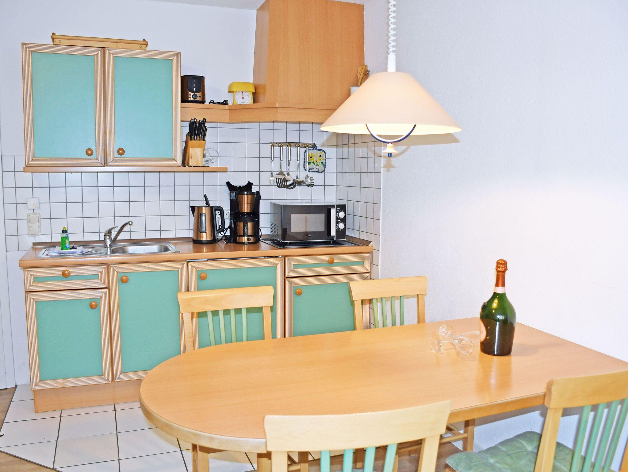 * Im Wohnbereich integrierte Einbauküche, ausgestattet mit: 4-Cerankochfeld, Dunstabzugshaube, Kühlschrank mit Gefrierfach, Toaster, Wasserkocher, Kaffeemaschine, Wasserkocher, Geschirrspüler, Mikrowelle und Küchenutensilien sowie einem Esstisch mit 4 Stühlen