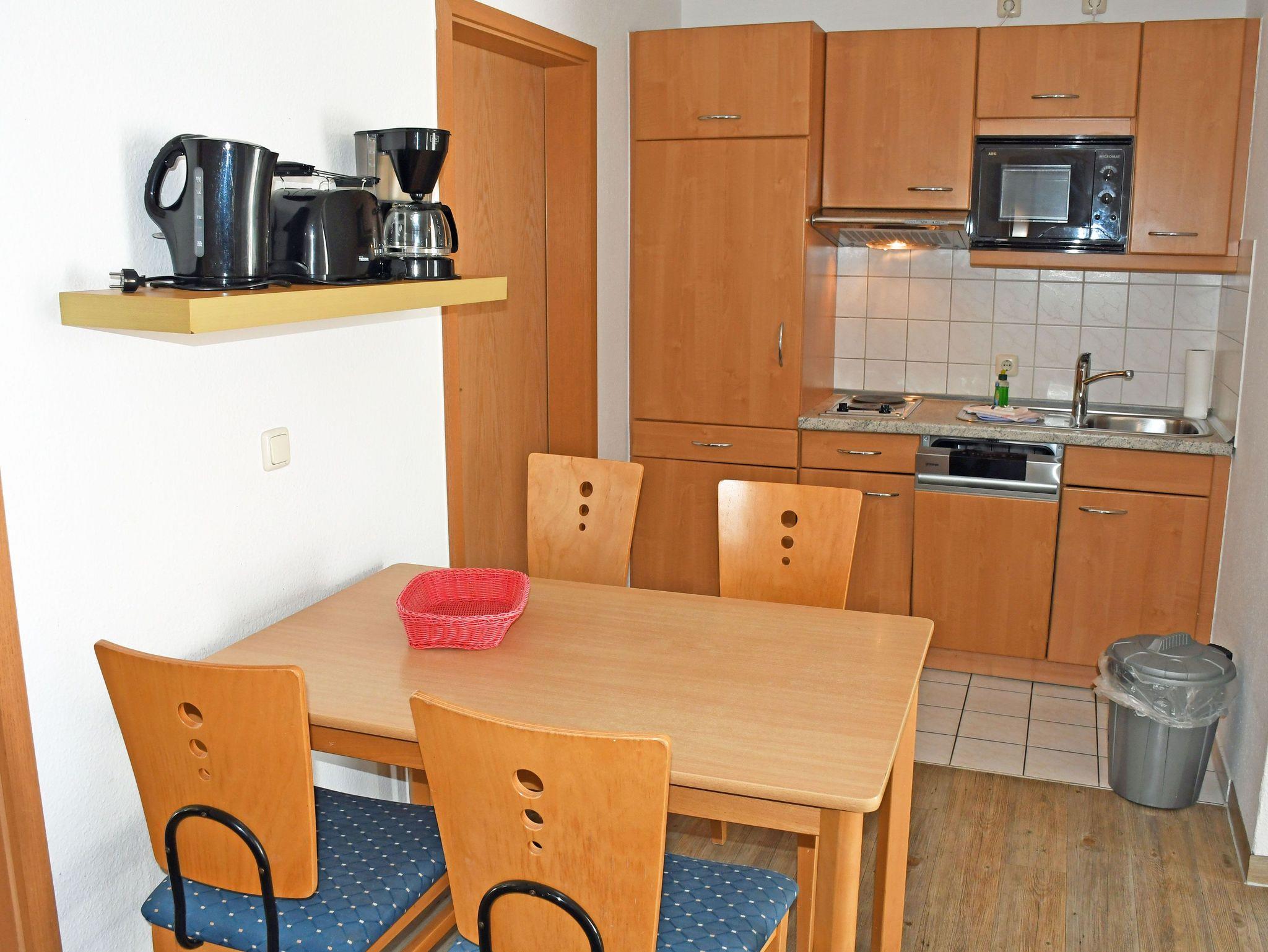 Im Wohnraum integrierte Einbauküche, ausgestattet mit: 2-Platten-Kochfeld, Dunstabzugshaube, großer Kühlschrank mit Gefrierfach, Geschirrspüler, Toaster, Kaffeemaschine, Wasserkocher und Küchenutensilien