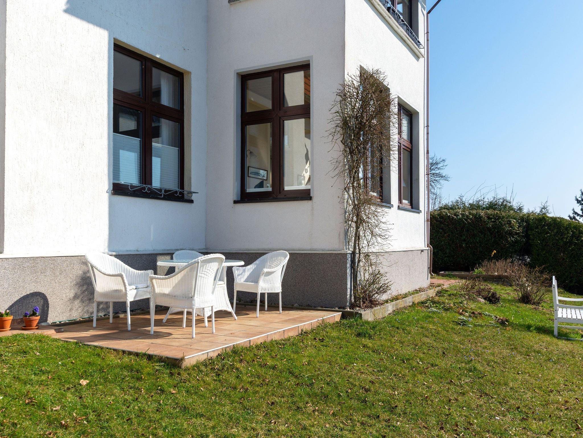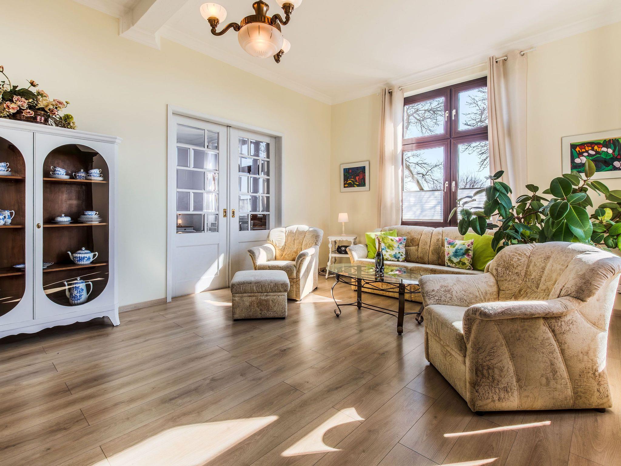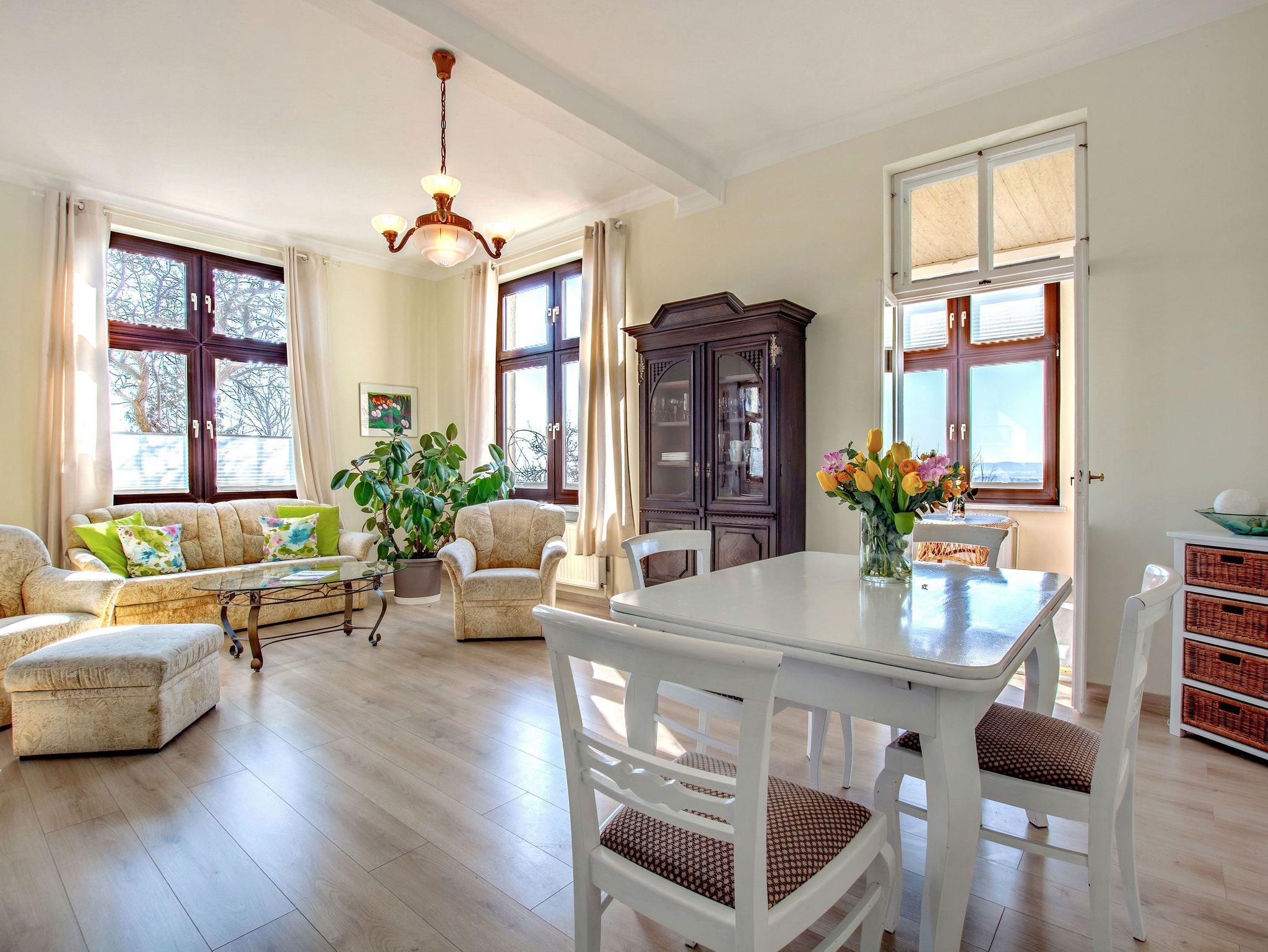 Die Ferienwohnung 1 ist hell und großzügig geschnitten, mit tollem Meeresblick und Terrasse. Eine sehr geräumige und stilvolle Wohnung mit großem Wohnzimmer und gemütlicher Sitzgruppe im Verandazimmer mit Blick auf die Ostsee.