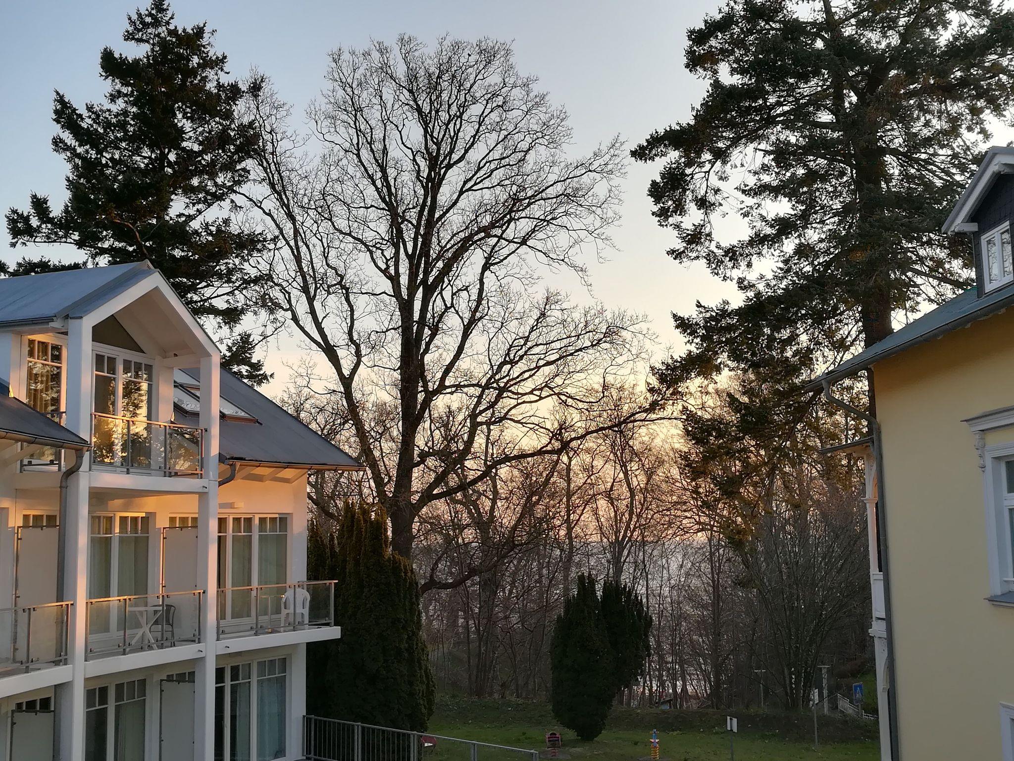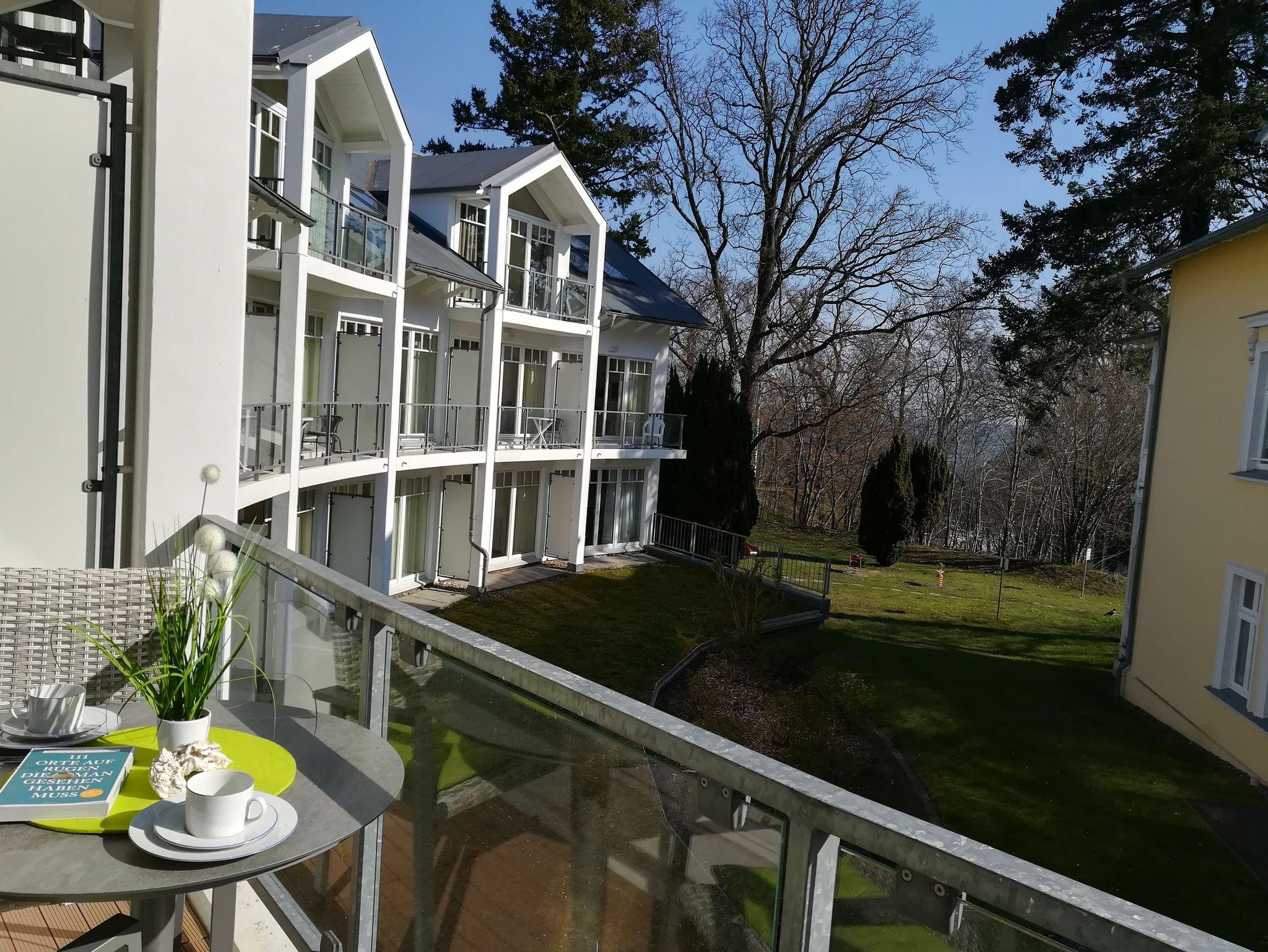 Hier blicken Sie ins Grüne der großzügigen Gartenanlage und auf die Waldpromenade; wenn die Bäume schwach belaubt sind, sogar bis auf die rauschende Ostsee.