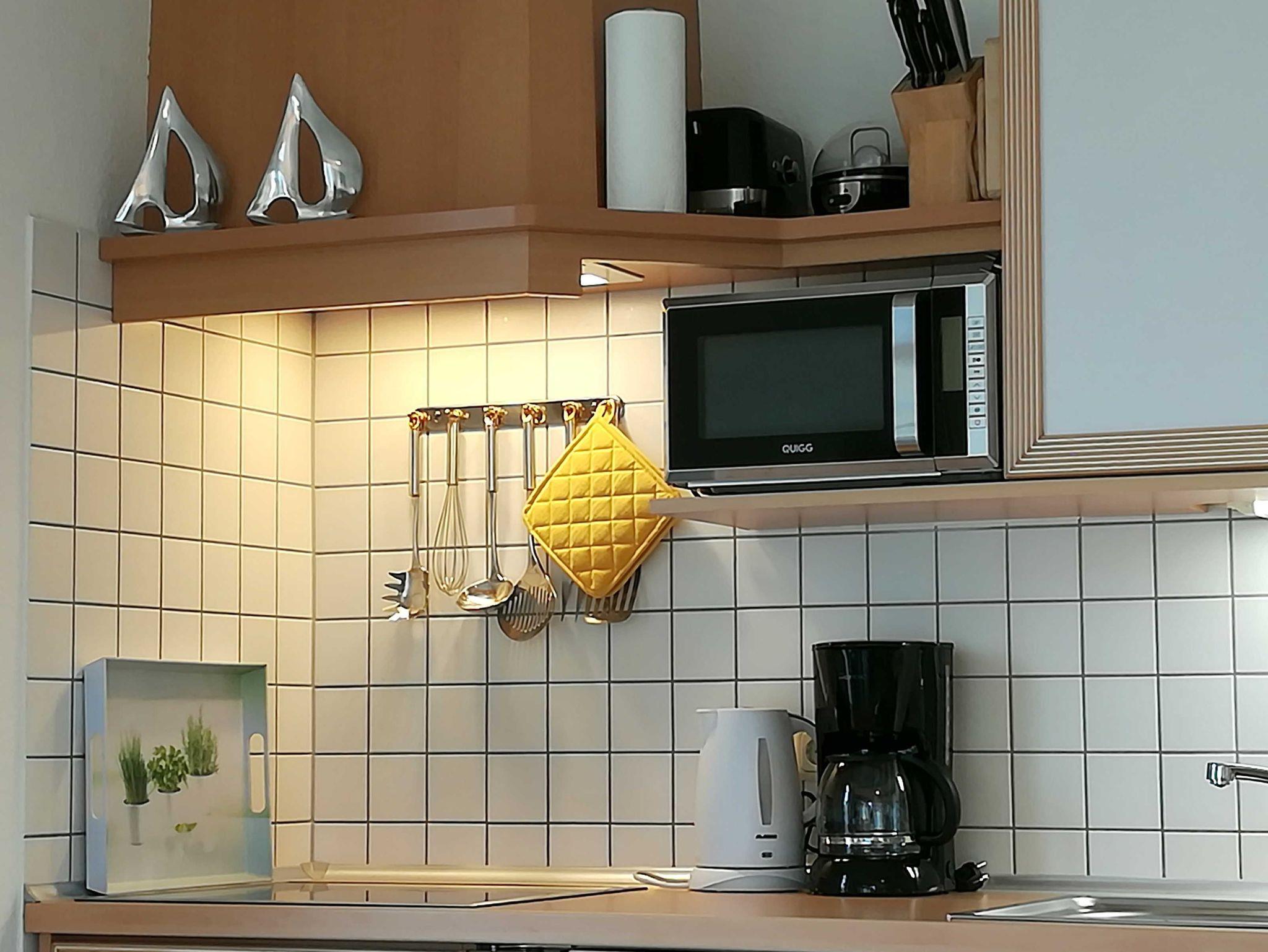 Der offene Wohn-Essbereich mit hochwertig komfortablen Sitz- und ausklappbarem Schlafsofa (1,60m x 2,00 m) plus Kleiderschrank verfügt über eine komplett ausgestattete Küchenzeile (Spülmaschine Ceranfeld, Wasserkocher, Kaffeemaschine, Eierkocher, Toaster, Mikrowelle) mit Tisch und 4 Stühlen. Außerdem ist ein Flachbildschirm, Radio/CD Player und kostenfreies W-LAN vorhanden.