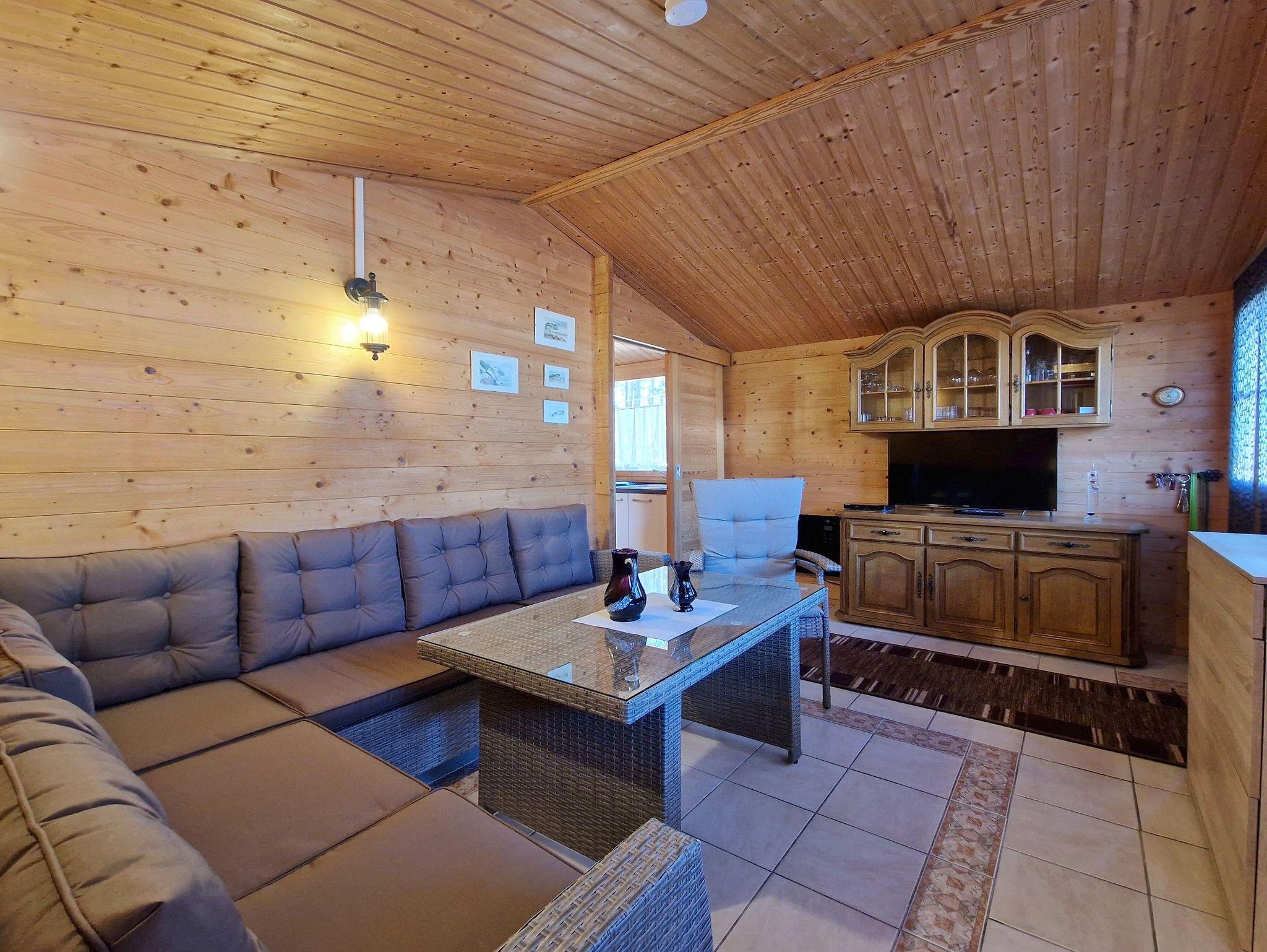 Der Wohn -und Essbereich ist mit einer gemütlichen Sitzgarnitur und Flachbild TV ausgestattet.