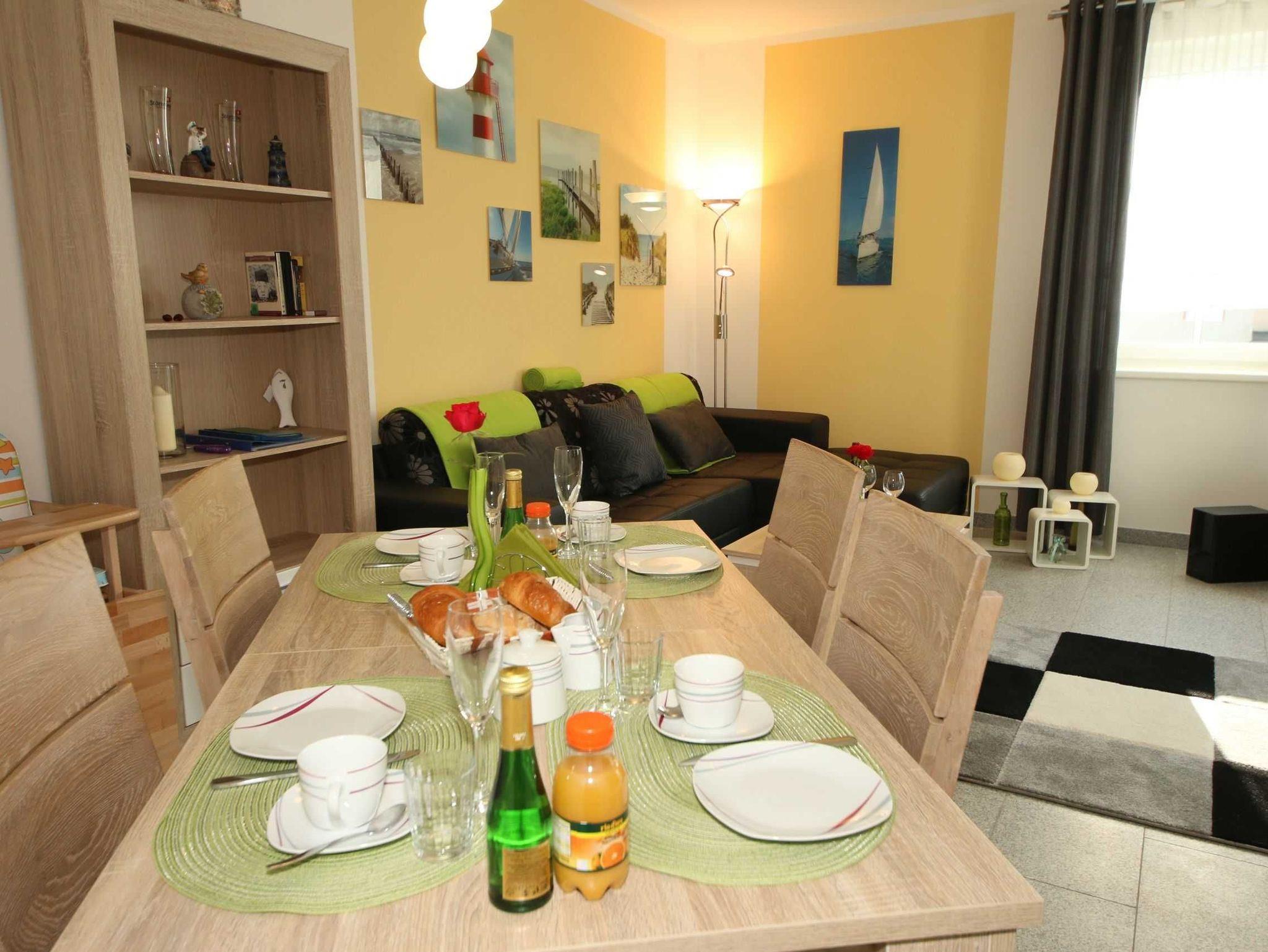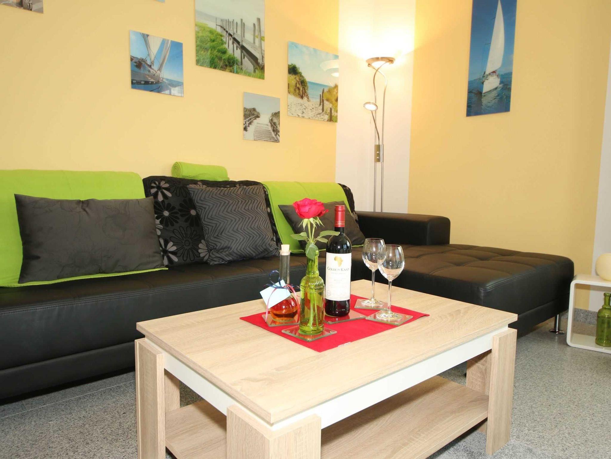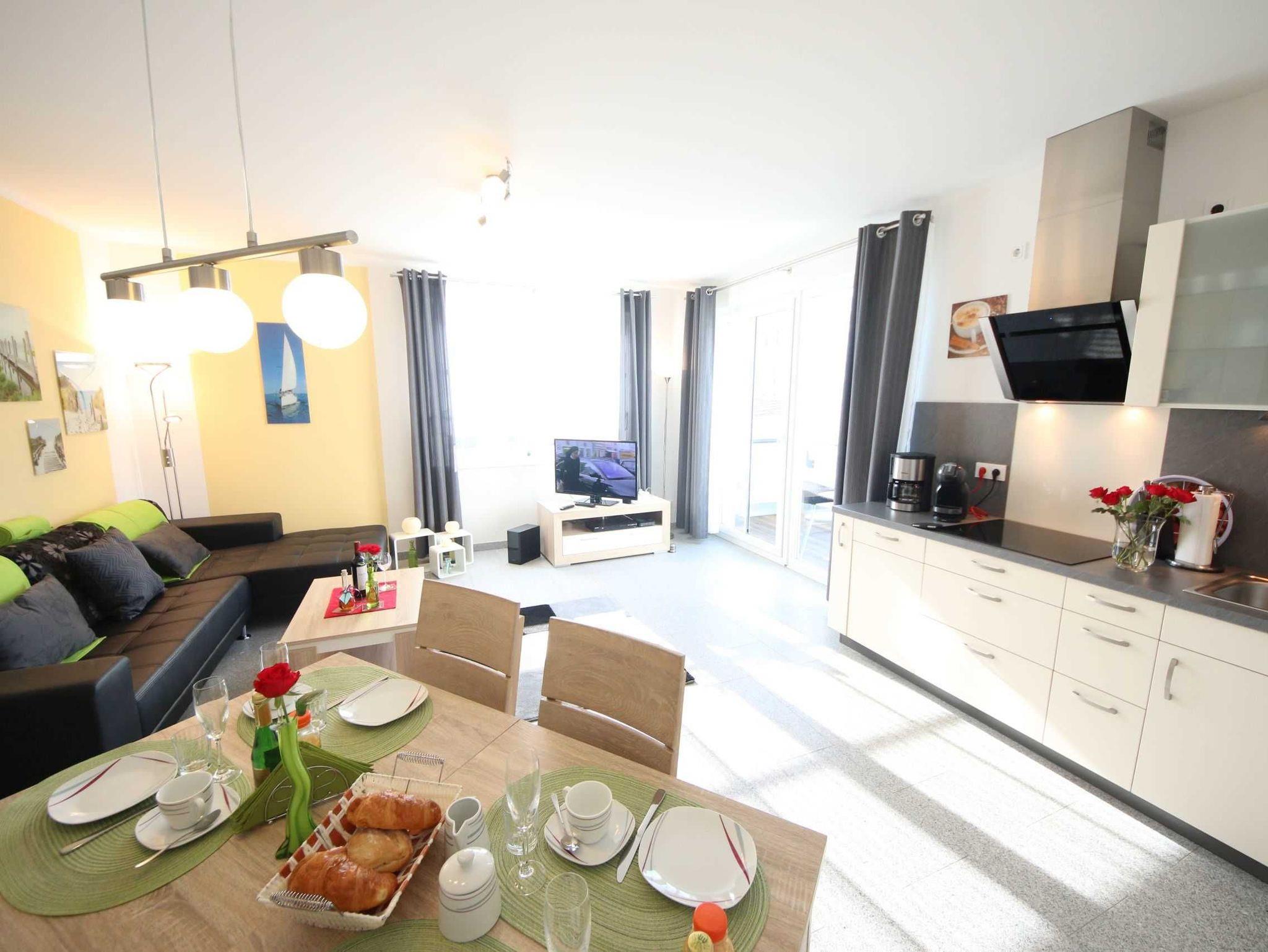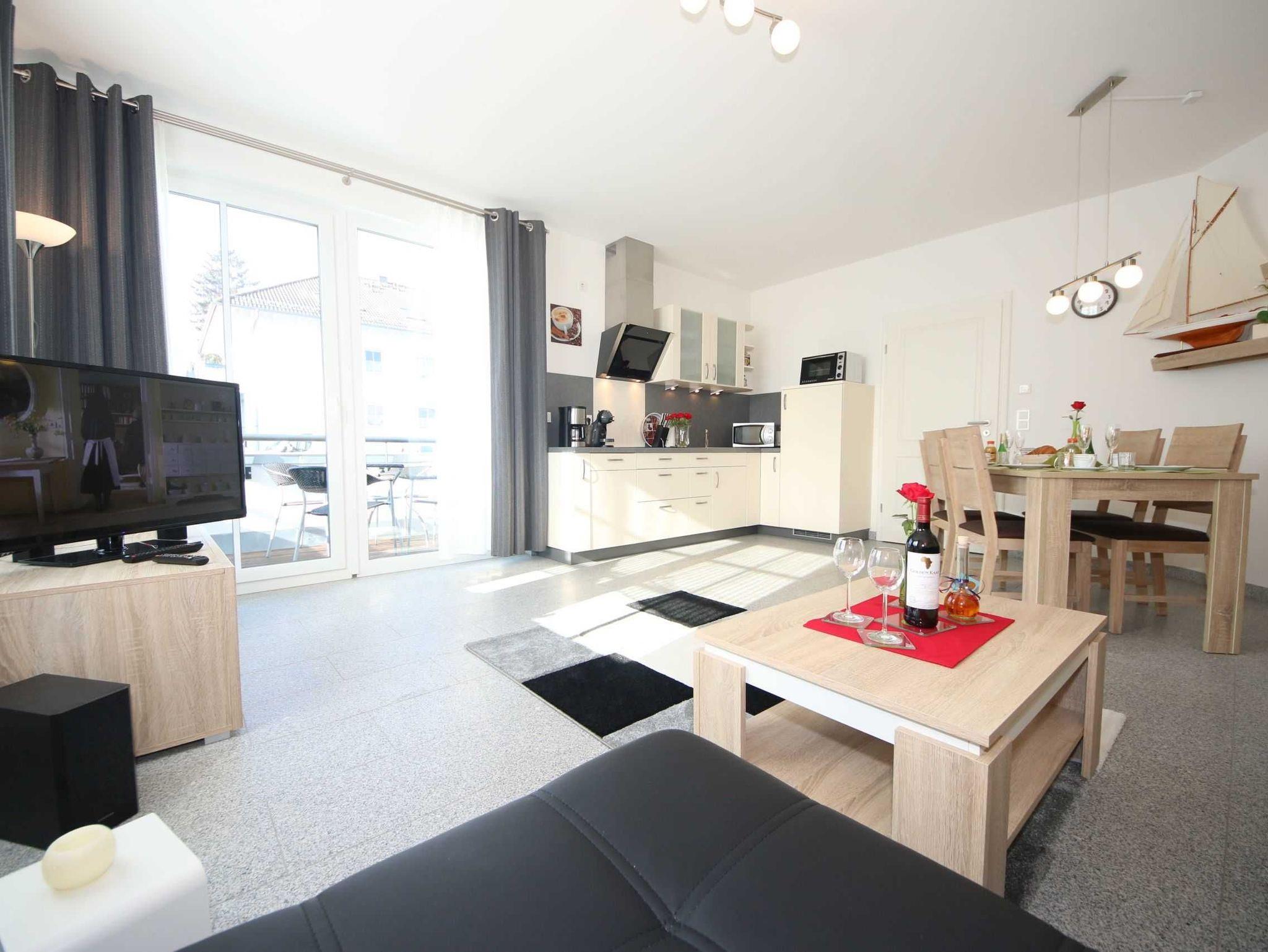 Die mit 60 qm komfortable und modern eingerichtete Nichtraucherwohnung verfügt über einen Granit Fußboden sowie Fußbodenheizung und befindet sich in der 1. Etage. Die Wohnung erreichen Sie bequem durch den Aufzug von der hauseigenen Tiefgarage. Die Wohnung verfügt über einen Balkon mit Südwestausrichtung und gemütlicher Bestuhlung (Sessel und Tisch). Im Wohnbereich lädt eine Sitzlandschaft mit Leselampe zum Verweilen ein. Ein Smart-TV, Blu-Ray-/DVD-Player, Sound-Anlage mit DAB-Radio und WLAN (inklusive) sorgen für einen angenehmen Aufenthalt. Die offene Küchenzeile verfügt über ein hochwertiges Ceranfeld, mit Abzugshaube, separatem Backofen, Mikrowelle mit Grillfunktion, Geschirrspüler, Kaffeemaschine, Kapselmaschine (Dolce Gusto), Wasserkocher, Toaster und natürlich diversen Küchenutensilien. Der Essplatz für 4 Personen mit Ausziehtisch rundet das Bild ab. Die beiden Schlafzimmer sind mit Boxspringbetten (1,60 m x 2,00 m & 1,80 m x 2,00 m) ausgestattet. Ebenfalls verfügen beide über 1 Full-HD-Flachbildschirm, einem stillen Diener, zwei Nachtkonsolen, Insektenschutzgitter und einem Kleiderschrank. Das moderne Duschbad mit WC verfügt über eine beheizte Handtuchhalterung, einen Kosmetikspiegel und einen Fön. Für unsere kleinen Gäste ist 1x Hochstuhl inklusive. Der Tiefgaragenstellplatz Nr. 7, Einfahrtshöhe 2 Meter, steht Ihnen kostenfrei zur Verfügung. Im Objekt befindet sich ein Fahrradraum in dem geliehene oder mitgebrachte Fahrräder sicher abgestellt werden können. Gegen Gebühr können Sie eine Waschmaschine und einen Trockner im Haus nutzen. Zusätzlich befinden sich in der Ferienwohnung ein Wäscheständer, Bügelbrett und Bügeleisen. Keine Haustiere erlaubt!! (Menschen mit Tierhaarallergie vor Buchung der Wohnung Kontakt mit dem Vermieter aufnehmen). Die Erstausstattung eines Wäschepaketes (komplette Bettwäsche, 1 Duschhandtuch, 2 kleine Handtücher, 2 Geschirrhandtücher) können Sie bis 14 Tage vor Anreise gegen einen Aufpreis dazu buchen oder durch eigene ergänzen.