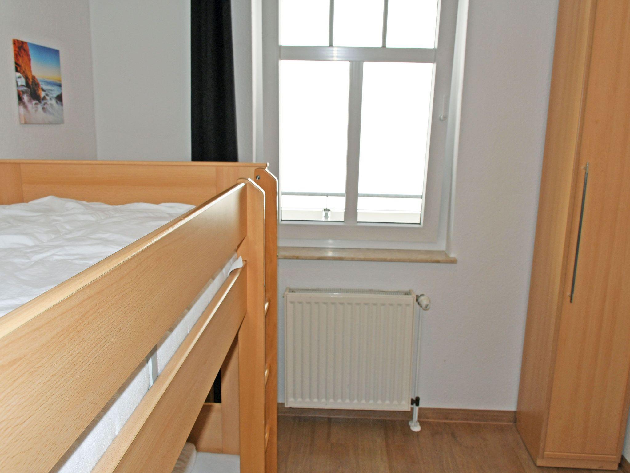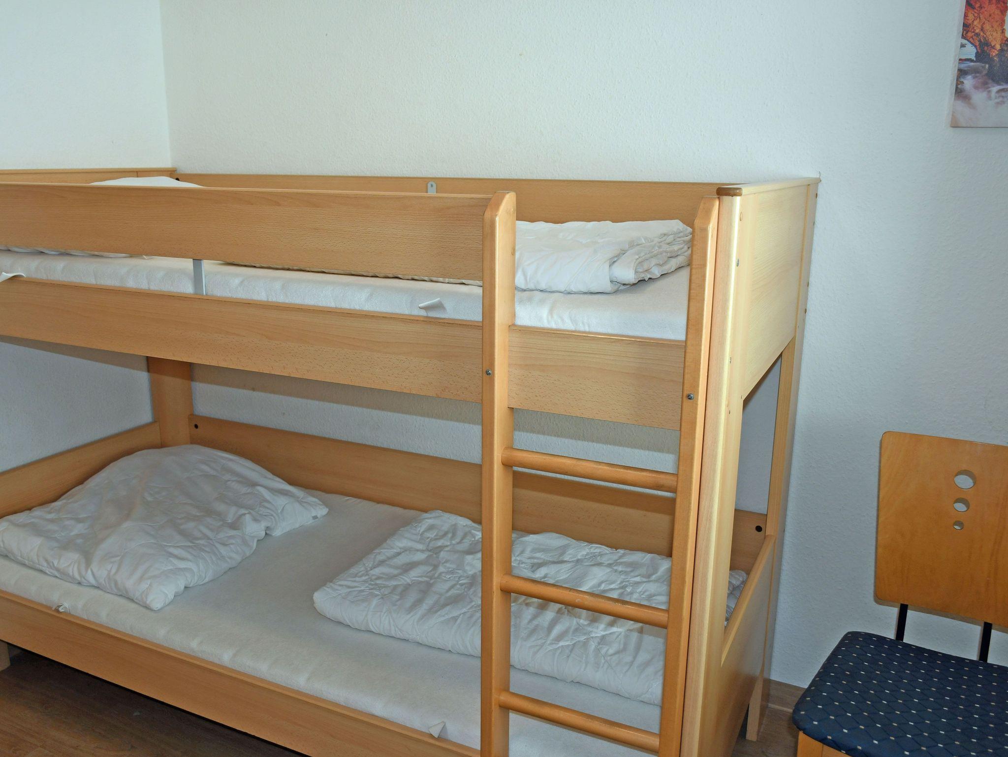 Schlafzimmer mit 2 getrennt stehenden Betten (90 x 200 cm) bzw. Etagenbett und kleinem Kleiderschrank