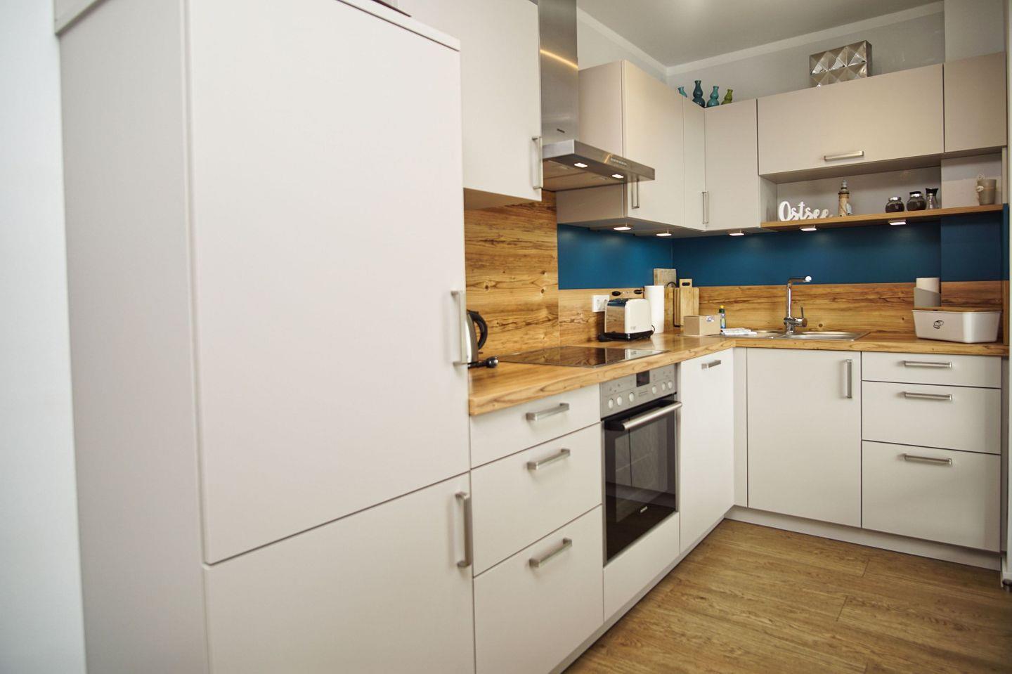 KÜCHE // Küchenzeile, 4-Platten Induktionsherd, Kühlschrank mit Gefrierfach, Backofen, Toaster, Wasserkocher, Kaffeemaschine, reichlich Besteck, Geschirr und Küchenutensilien ++