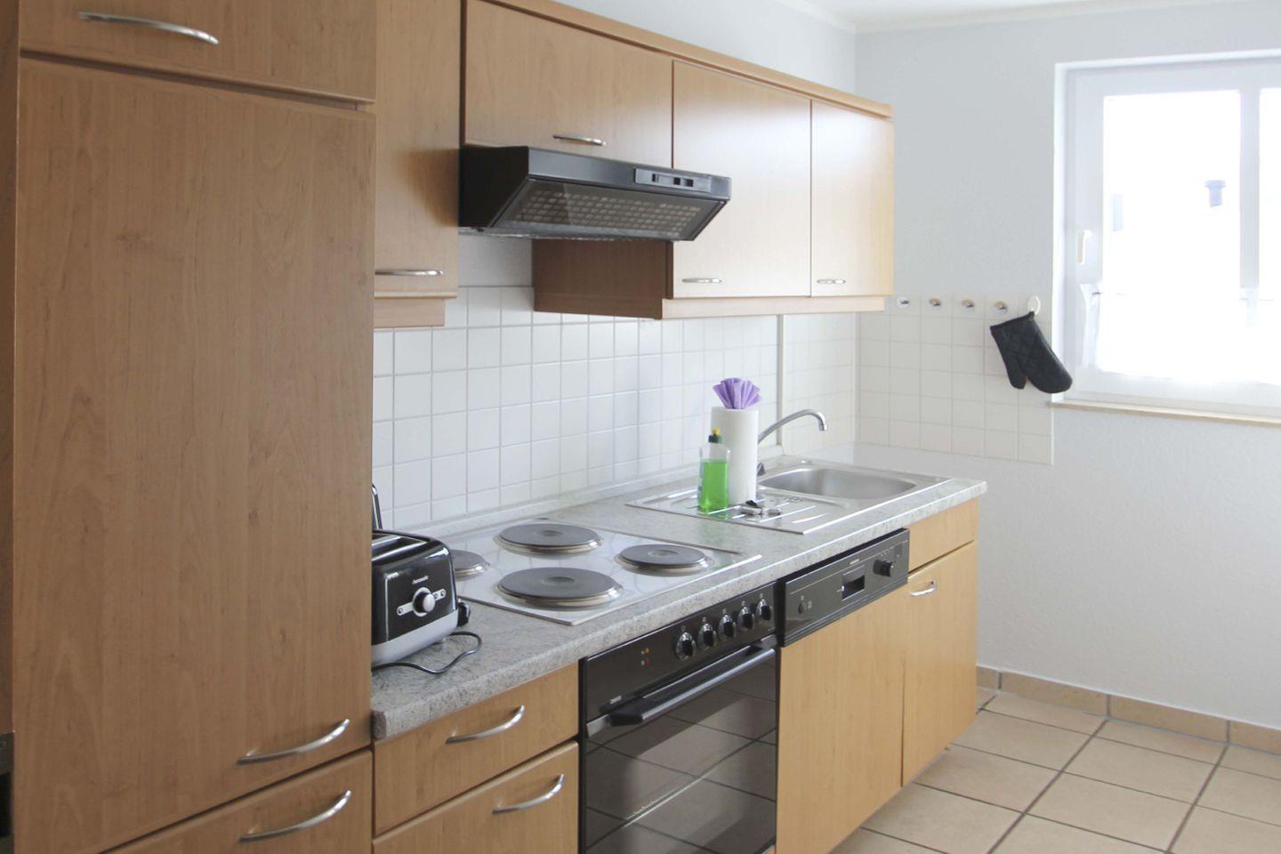 KÜCHE // geschlossene Küche, 4-Platten-Herd, Spülmaschine, Kühlschrank mit Gefrierfach, Backofen, Toaster, Wasserkocher, Kaffeemaschine, reichlich Besteck, Geschirr und Küchenutensilien ++