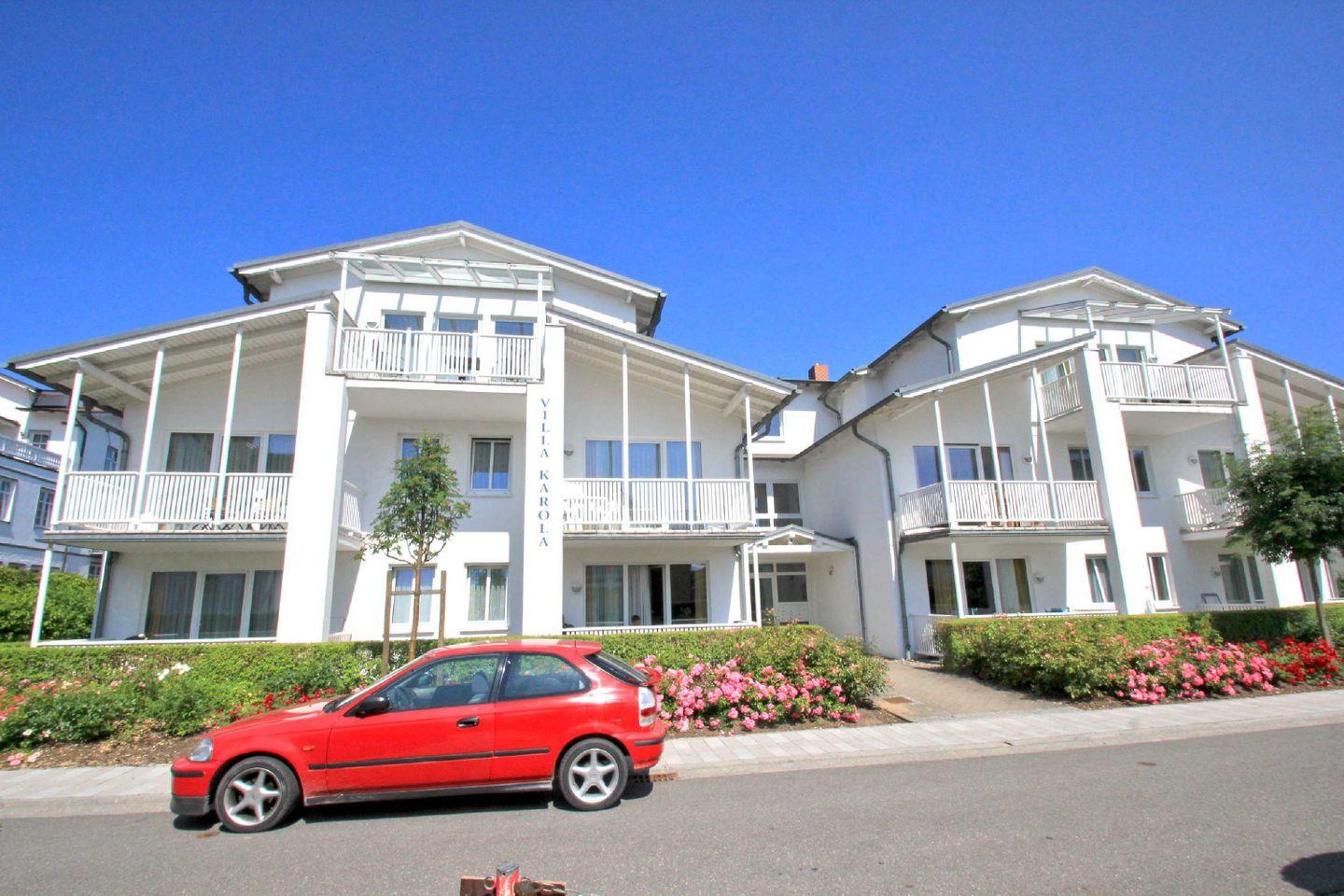 Die Villa Karola in Göhren bietet eine moderne Ferienwohnung mit Balkon und kostenfreiem Zugang zum AHOI Erlebnisbad.
