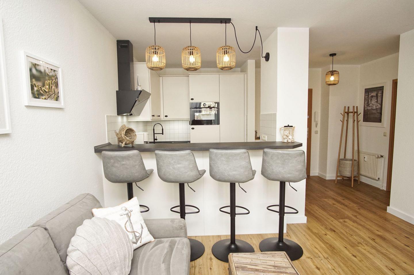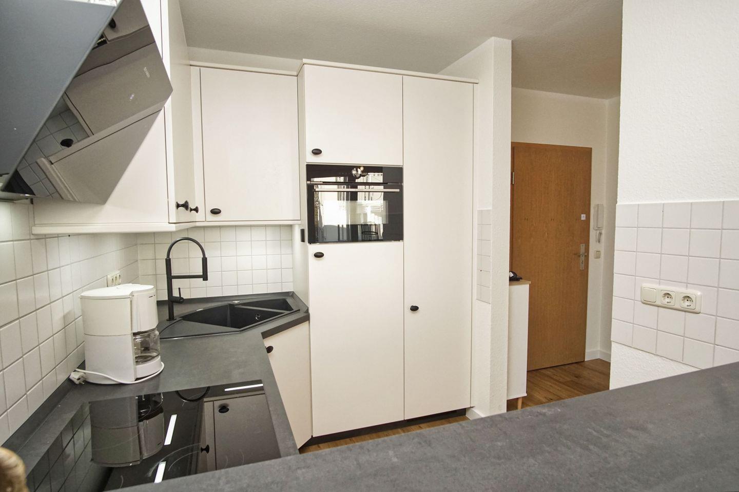 KÜCHE // offene Küche, Ceranfeld, Spülmaschine, Kühlschrank mit Gefrierfach, Backofen (Kombigerät), Toaster, Wasserkocher, Kaffeemaschine, reichlich Besteck, Geschirr und Küchenutensilien sowie Waschmaschine ++