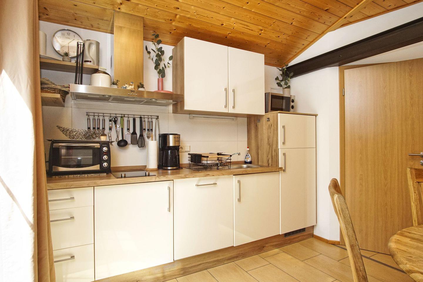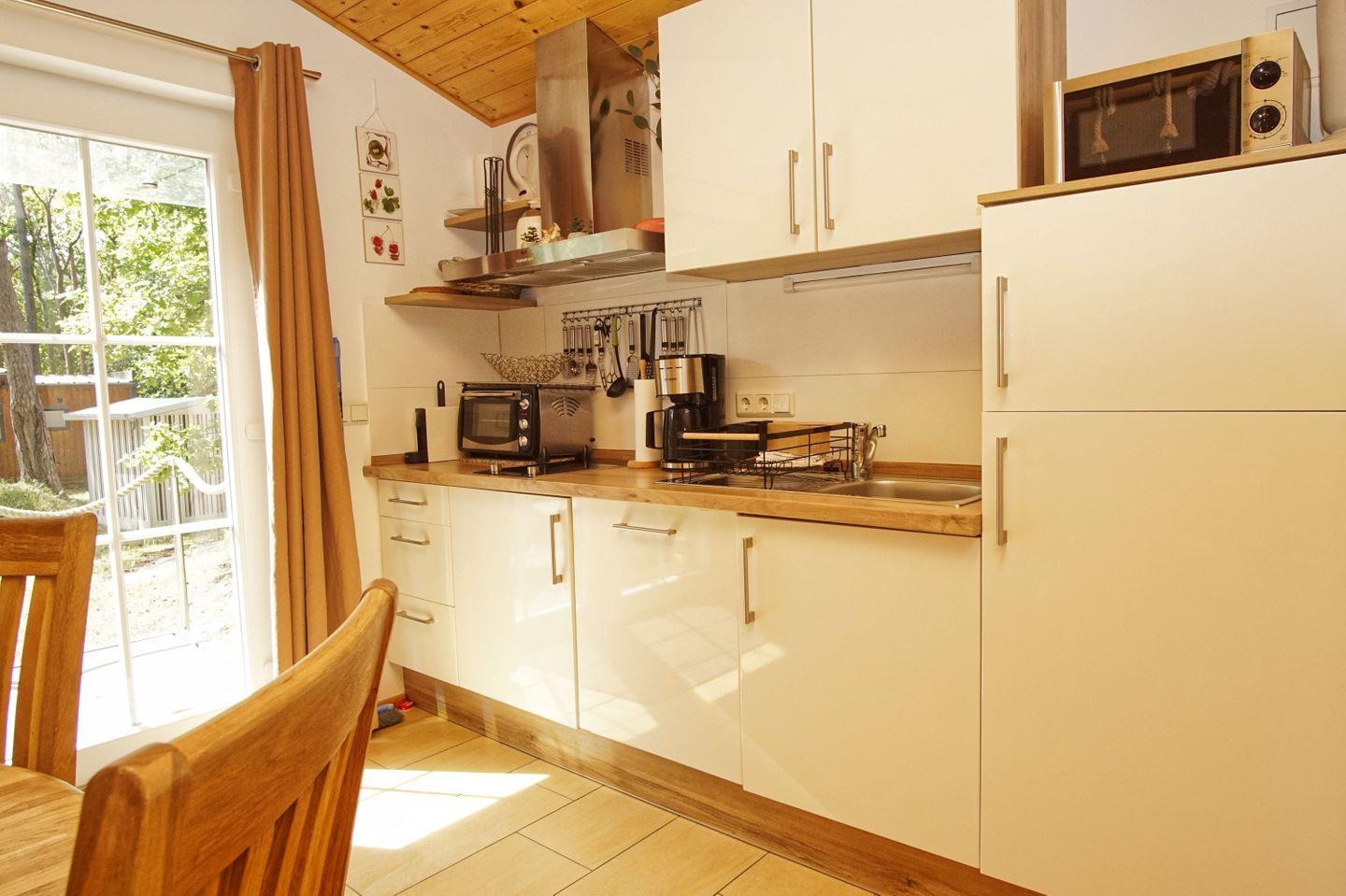 KÜCHE // offene Küche, 2-Felder Ceranherd, Kühlschrank mit Gefrierfach, Mikrowelle, Geschirrspülmaschine, Toaster, Wasserkocher, Kaffeemaschine, reichlich Besteck, Geschirr und Küchenutensilien ++