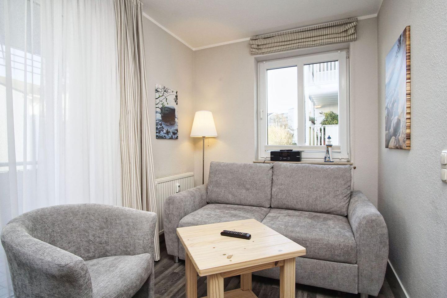 Zentrale Ferienwohnung in Göhren mit Balkon, nah am Strand und kostenfreiem Zugang zu Schwimmbad und Sauna.