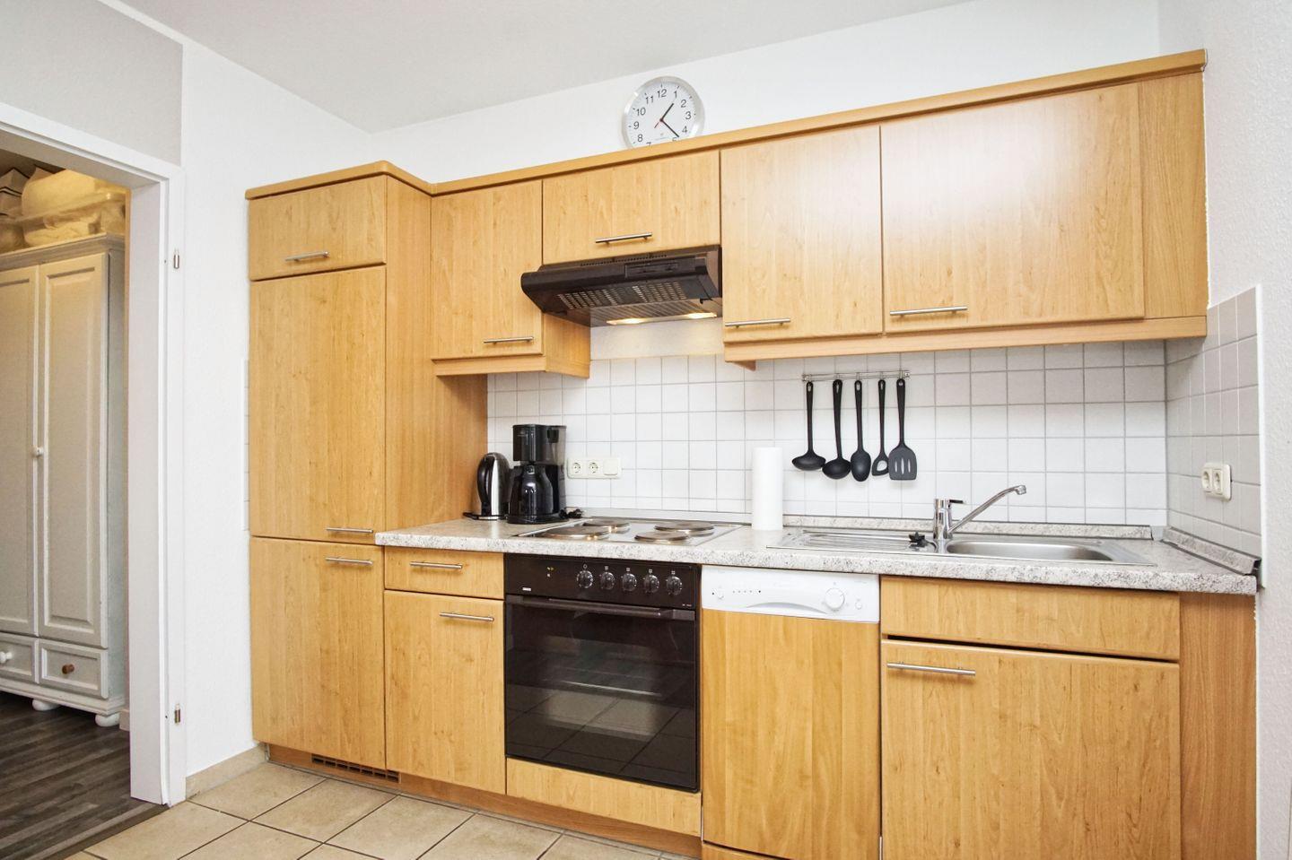 KÜCHE // Küchenzeile, Herd (4-Platten), Spülmaschine, Kühlschrank mit Gefrierfach, Backofen, Toaster, Wasserkocher, Kaffeemaschine, reichlich Besteck, Geschirr und Küchenutensilien ++
