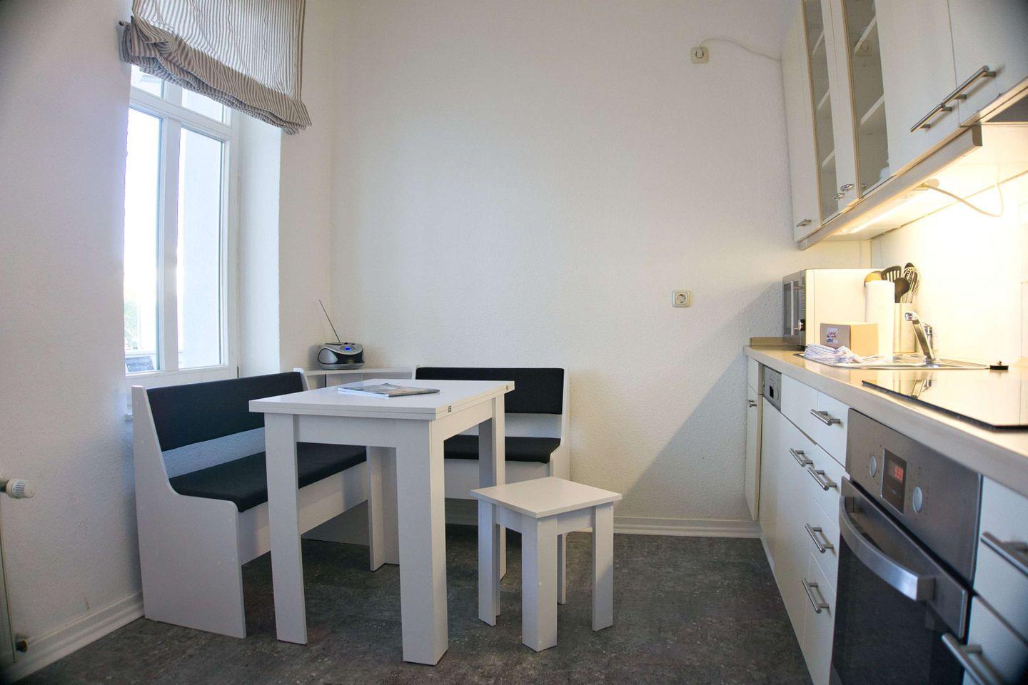 KÜCHE // Küchenzeile, 4-Platten Herd, Spülmaschine, Kühlschrank mit Gefrierfach, Backofen, Mikrowelle, Toaster, Wasserkocher, Kaffeemaschine, reichlich Besteck, Geschirr und Küchenutensilien sowie kleiner Sitzecke ++