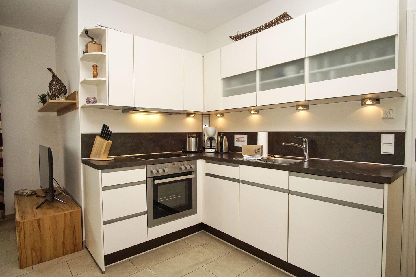 KÜCHE // Küchenzeile, 4-Platten Ceranherd, Kühlschrank mit Gefrierfach, Backofen, Toaster, Wasserkocher, Kaffeemaschine, reichlich Besteck, Geschirr und Küchenutensilien ++