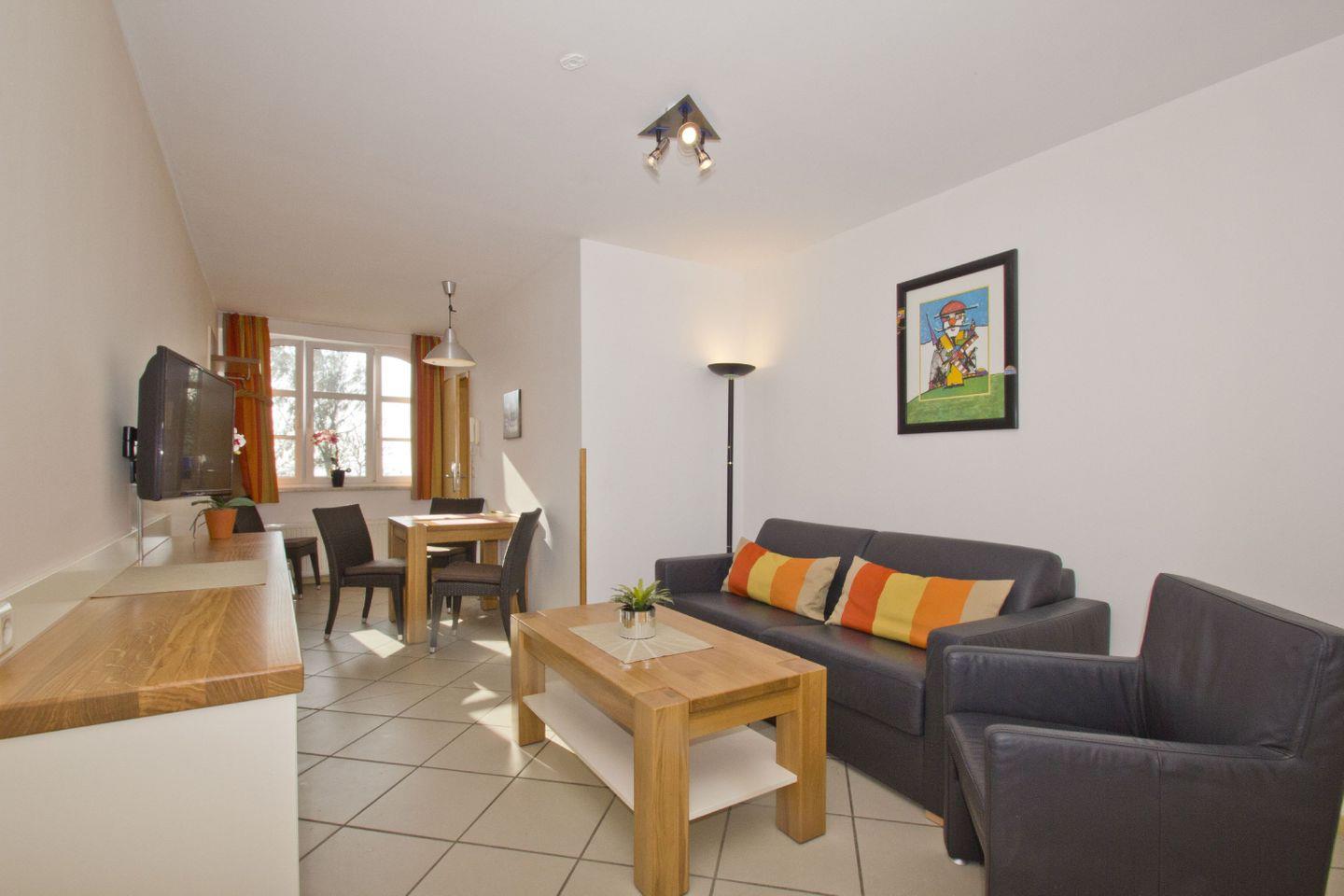 WOHNEN // Wohnraum mit Essbereich, Esstisch mit 4 Stühlen, Sitzgarnitur, Couch mit Schlaffunktion, Kabel-TV, Radio, CD-Player ++