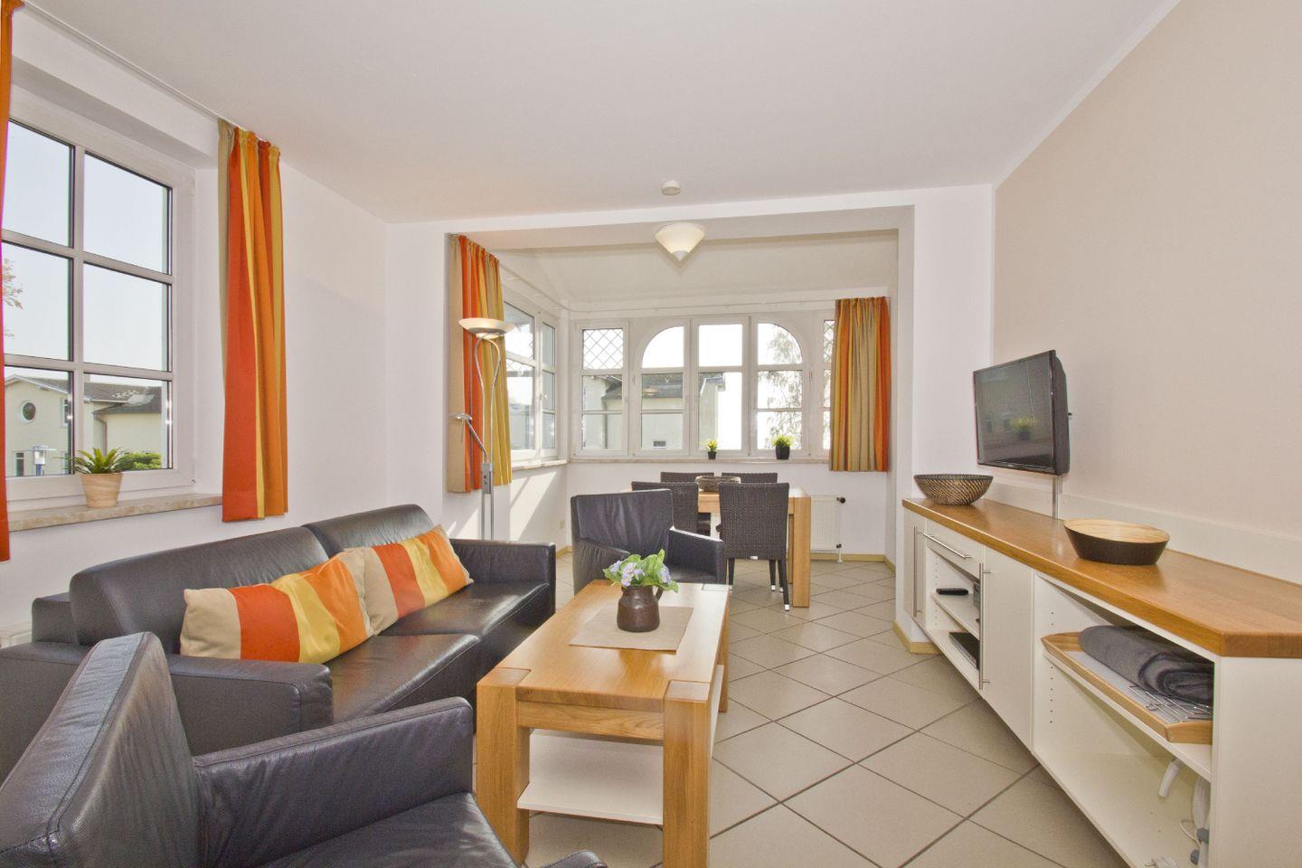 WOHNEN // Wohnraum mit Essbereich, Esstisch mit 4 Stühlen, Sitzgarnitur, Couch mit Schlaffunktion, Kabel-TV, Radio, CD-Player ++