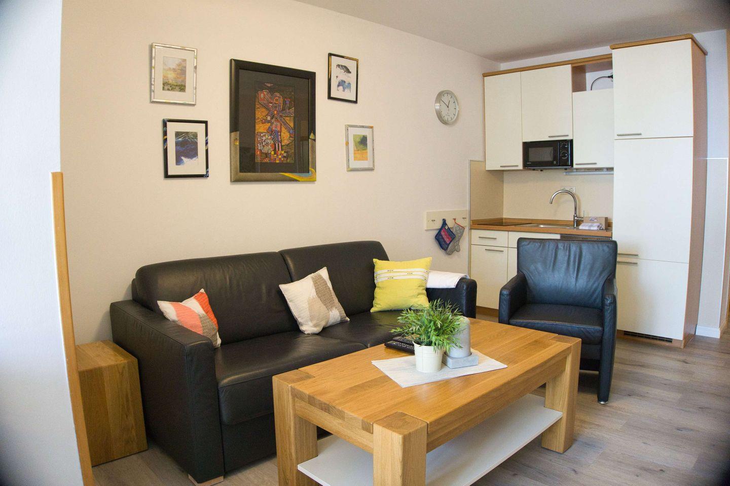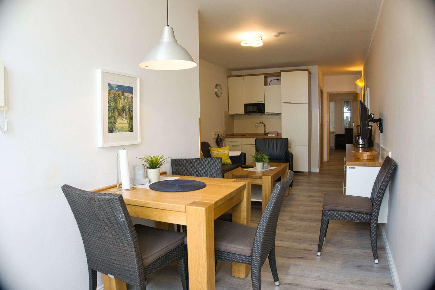WOHNEN // Wohnraum mit Essbereich, Esstisch mit 4 Stühlen, Sitzgarnitur, Couch mit Schlaffunktion, Kabel-TV, Radio, CD-Player ++